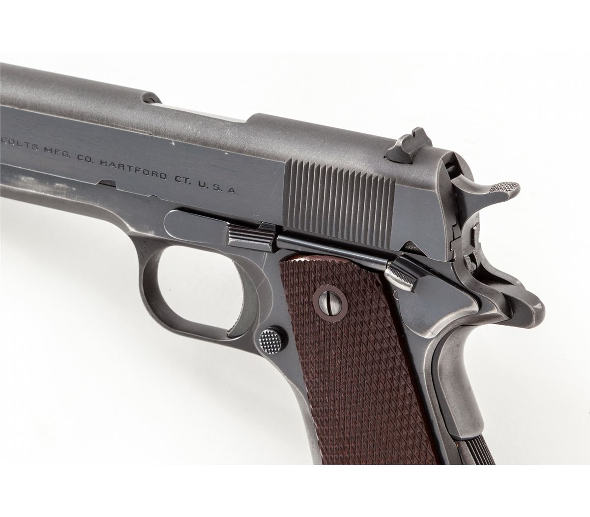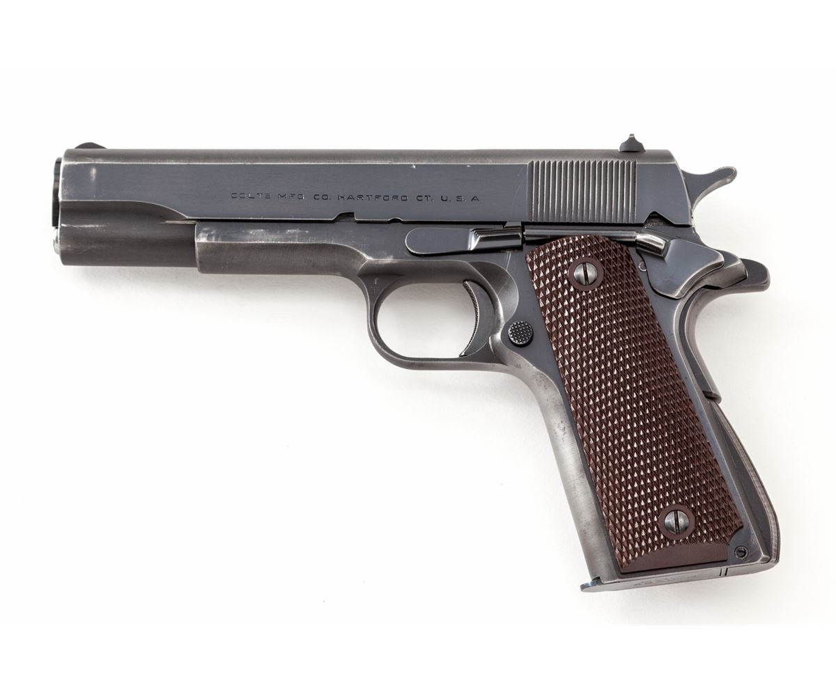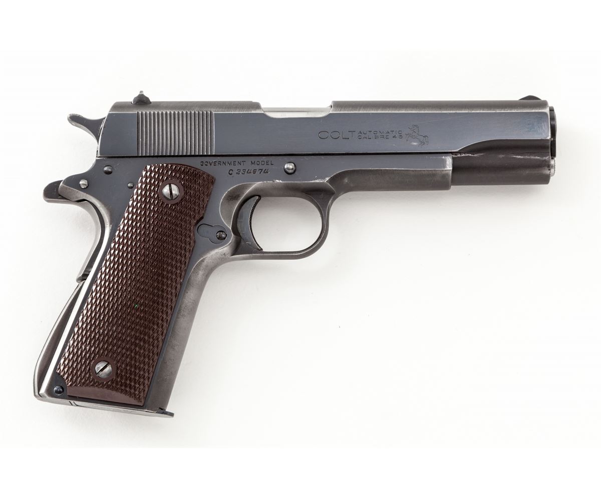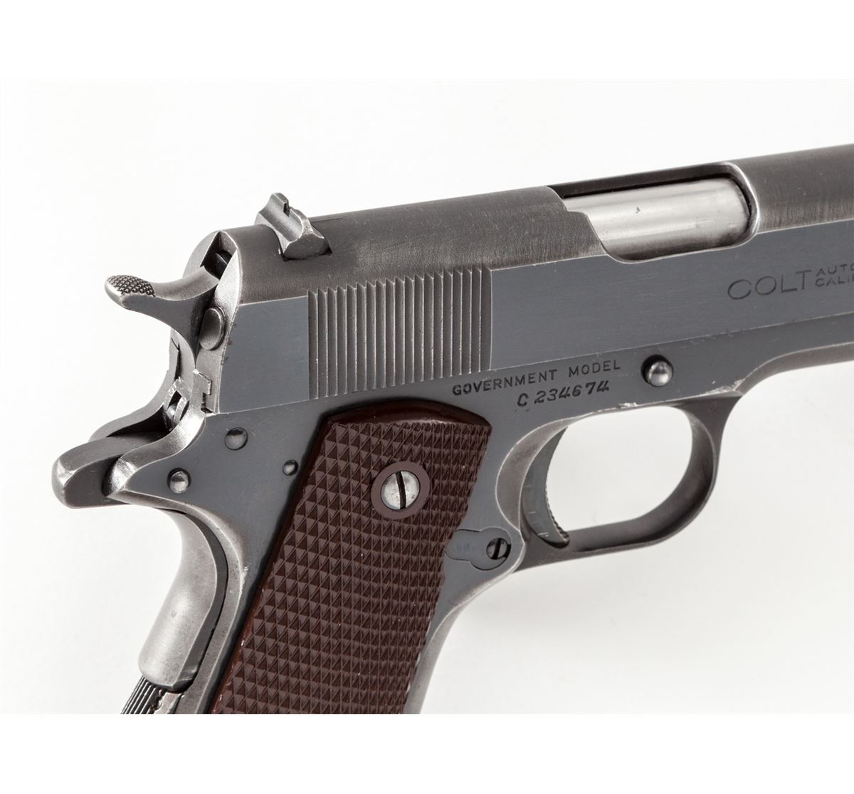 Post-War Colt Government Model, #C234674, .45 ACP cal., 5'' barrel, blue finish, milled trigger, WWII era brown checkered plastic grips, with one pre-war blue commercial magazine marked ''Colt 45 Auto''. Mfg'd 1948. Condition is fine retaining approx. 92% blue with extensive thinning to front strap, mainspring housing and grip safety. Scratch below slide stop. Crisp grips and action, fine bore. Est.: $800-$1,200. (C&R/PPT)