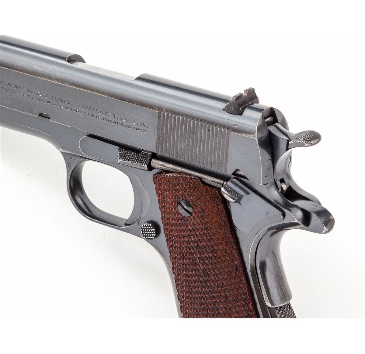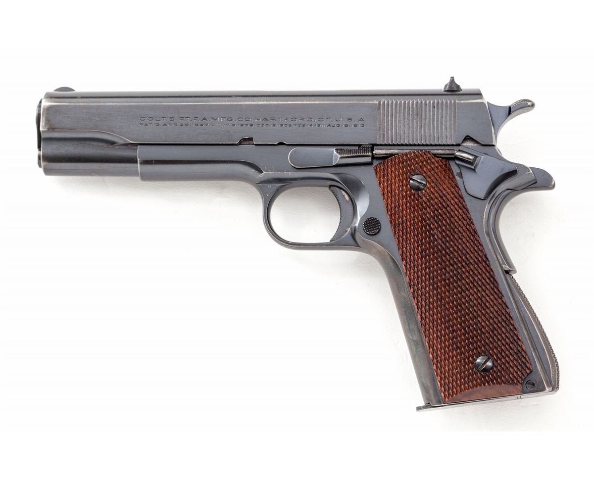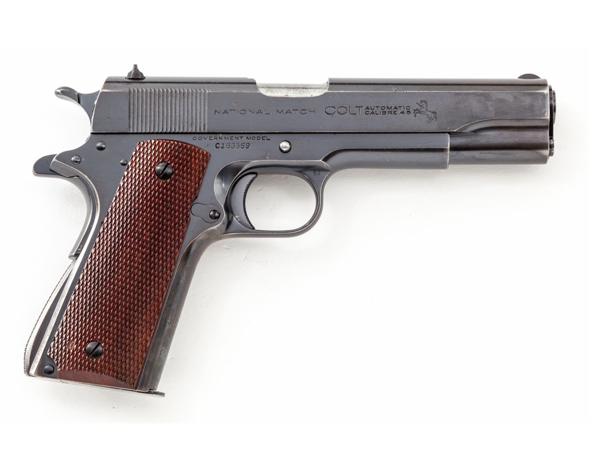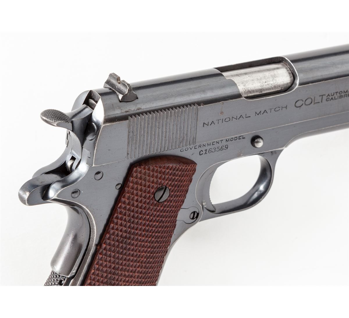 Early Pre-War Colt National Match Semi-Automatic Pistol, #C163569, .45 ACP cal., 5'' barrel, blue finish, checkered walnut grips, with one commercial two-tone magazine, the base of which is marked ''Colt/45 Auto.'' This fixed sight example was mfg'd in 1932. Condition is fine retaining approx. 92% original blue. Grips are crisp and may be later replacements. Frame internally marked beneath grip and to side of barrel with previous owner's name (only shows when disassembled). All correct bright Match small parts; slide with matching number beneath firing pin retainer. Early Match barrel is marked ''MB'' to left lug. Action is tight, bore is bright. Est.: $2,000-$4,000. (C&R/PPT)
