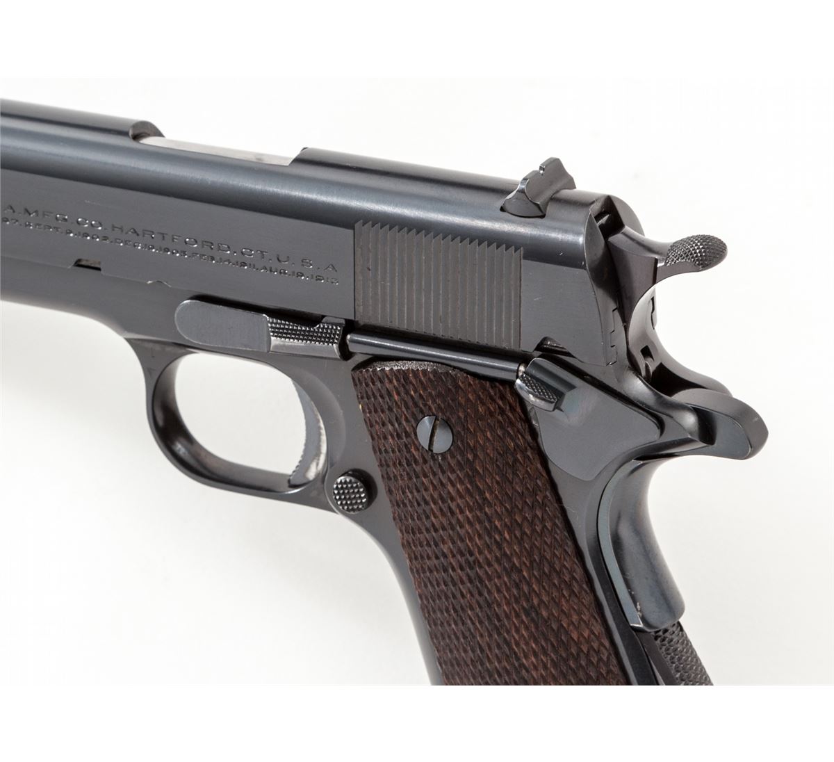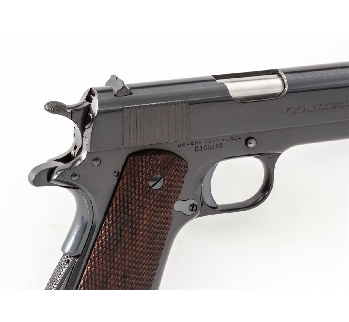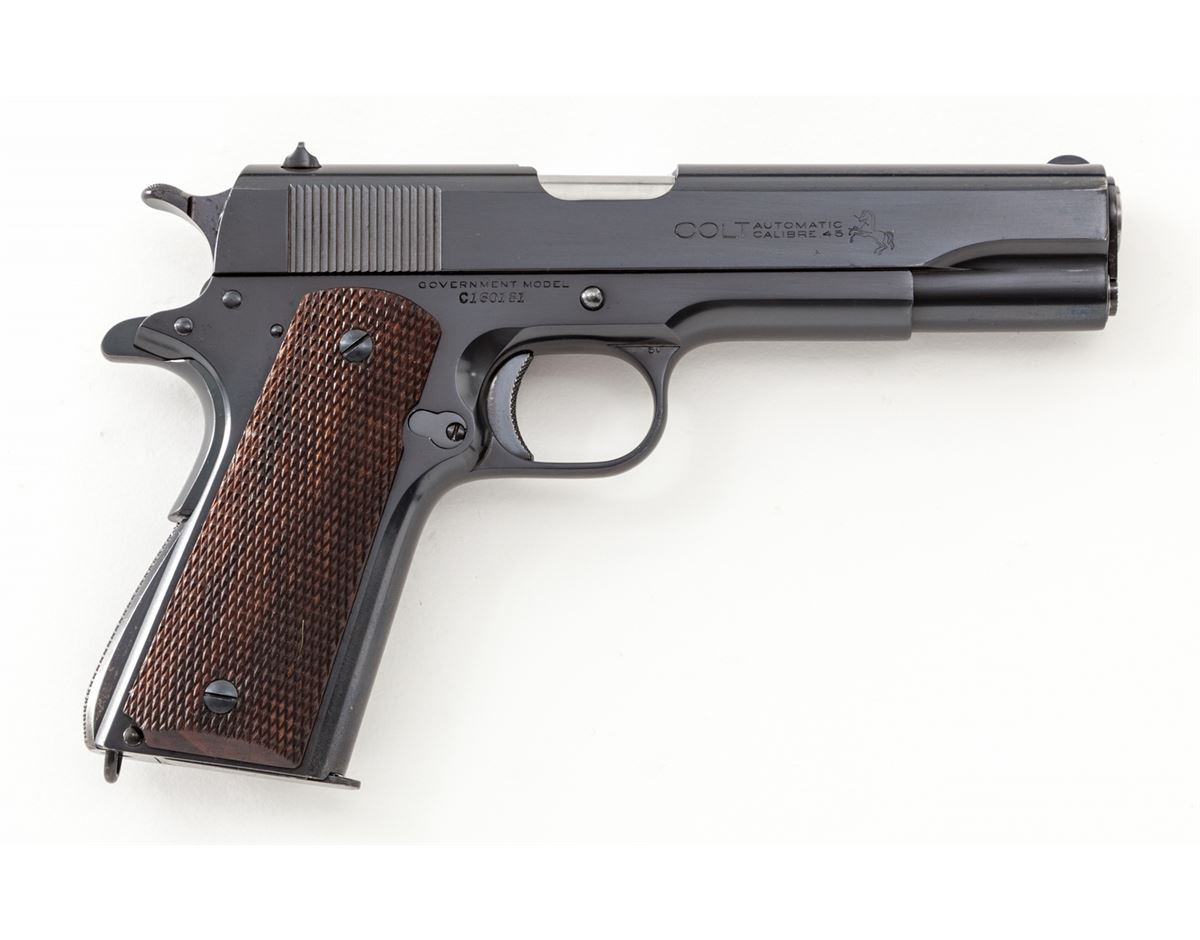 Pre-War Colt Government Model, #C160181, .45 ACP cal., 5'' barrel, blue finish, factory checkered walnut grips, with one two-tone unmarked Colt magazine. Mfg'd 1931. Condition is excellent as professionally refinished and restocked. Pistol shows very light wear to high edges near muzzle. Crisp grips and action and bright bore, with some thinning in actioning areas. Difficult to discern from original finish. Est.: $1,000-$1,500. (C&R/PPT)