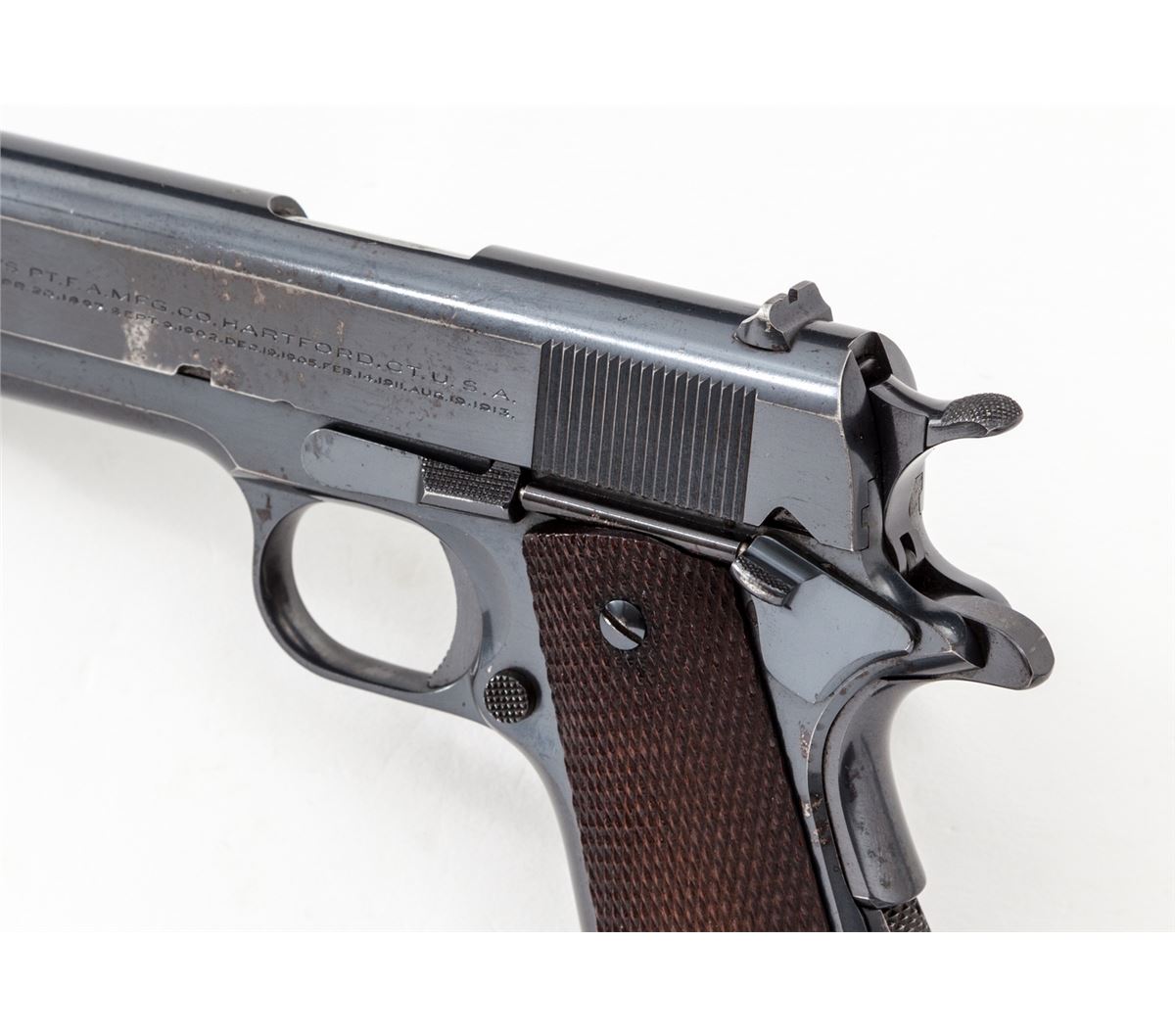 Pre-War Colt Super 38 Semi-Automatic Pistol, #6835, .38 Super cal., 5'' barrel, blue finish, factory checkered walnut grips, with one correct two-tone magazine. Mfg'd 1930. Condition is fine retaining approx. 90%-92% original pre-war blue with light speckling to left side of frame, as well as front strap. Grips with mild flattening and some oil darkening near screws. Matching numbered slide beneath firing pin retainer. Action is good, bore is bright. Est.: $1,800-$2,400. (C&R/PPT)