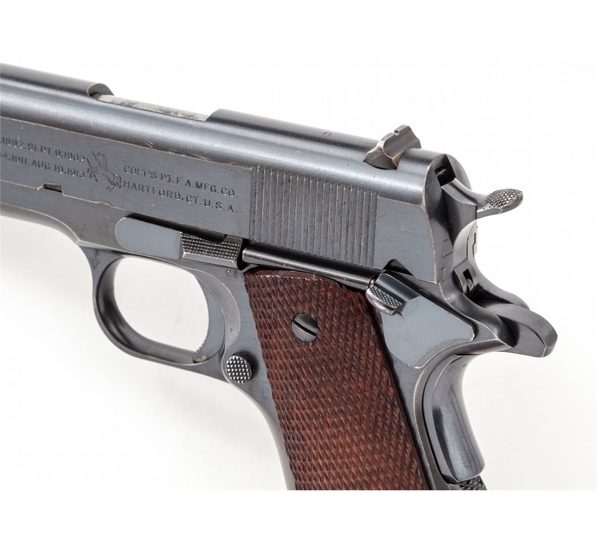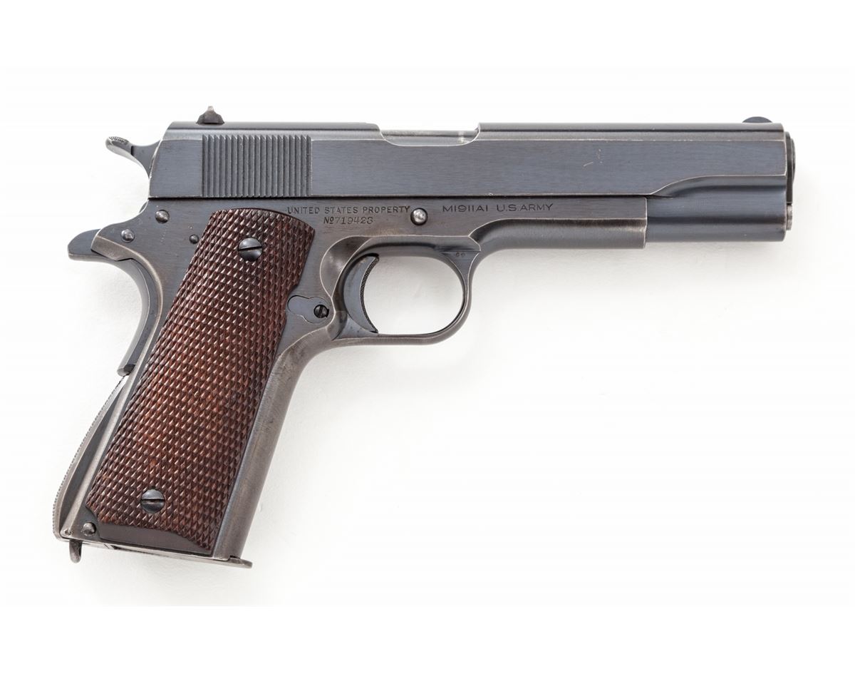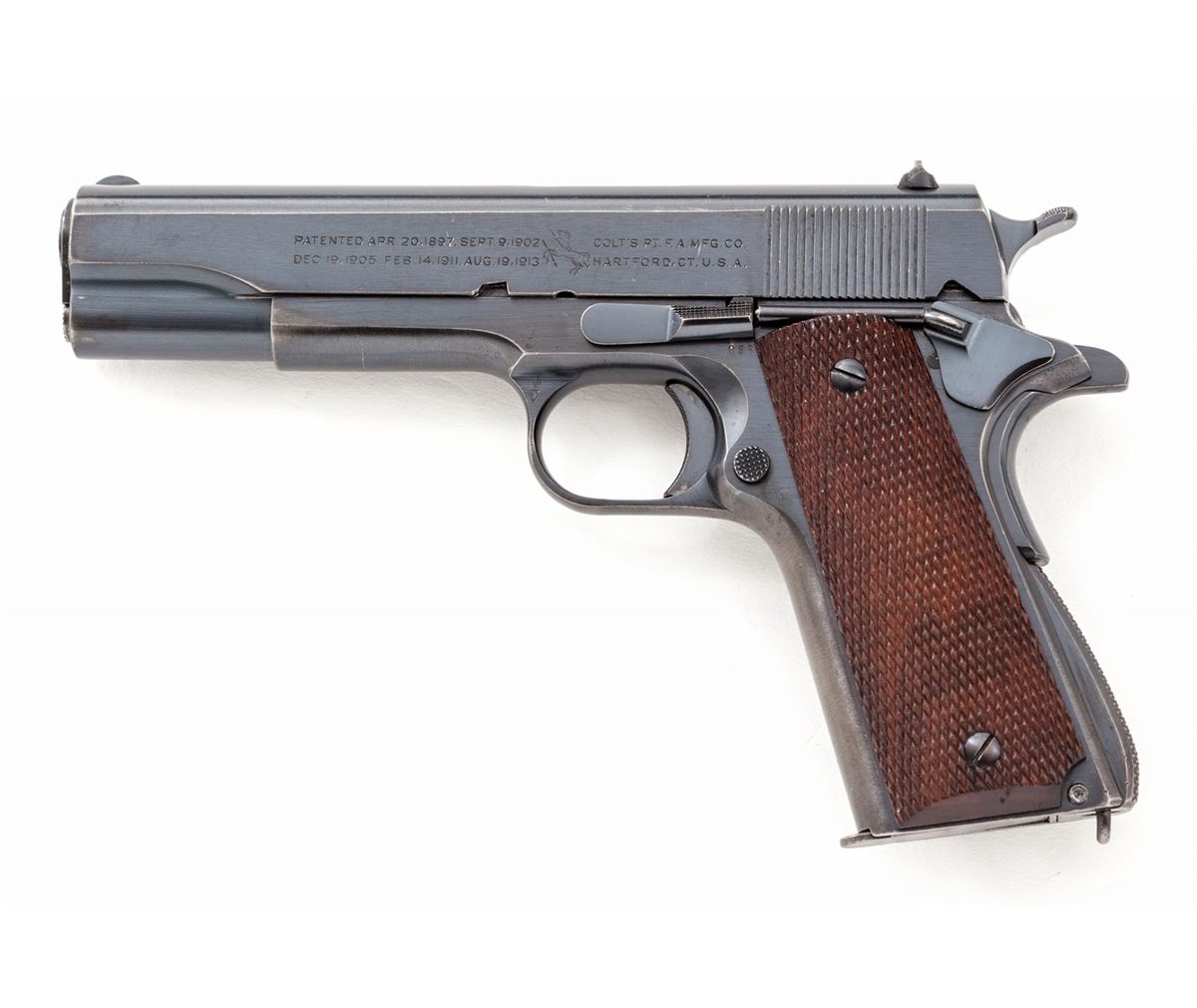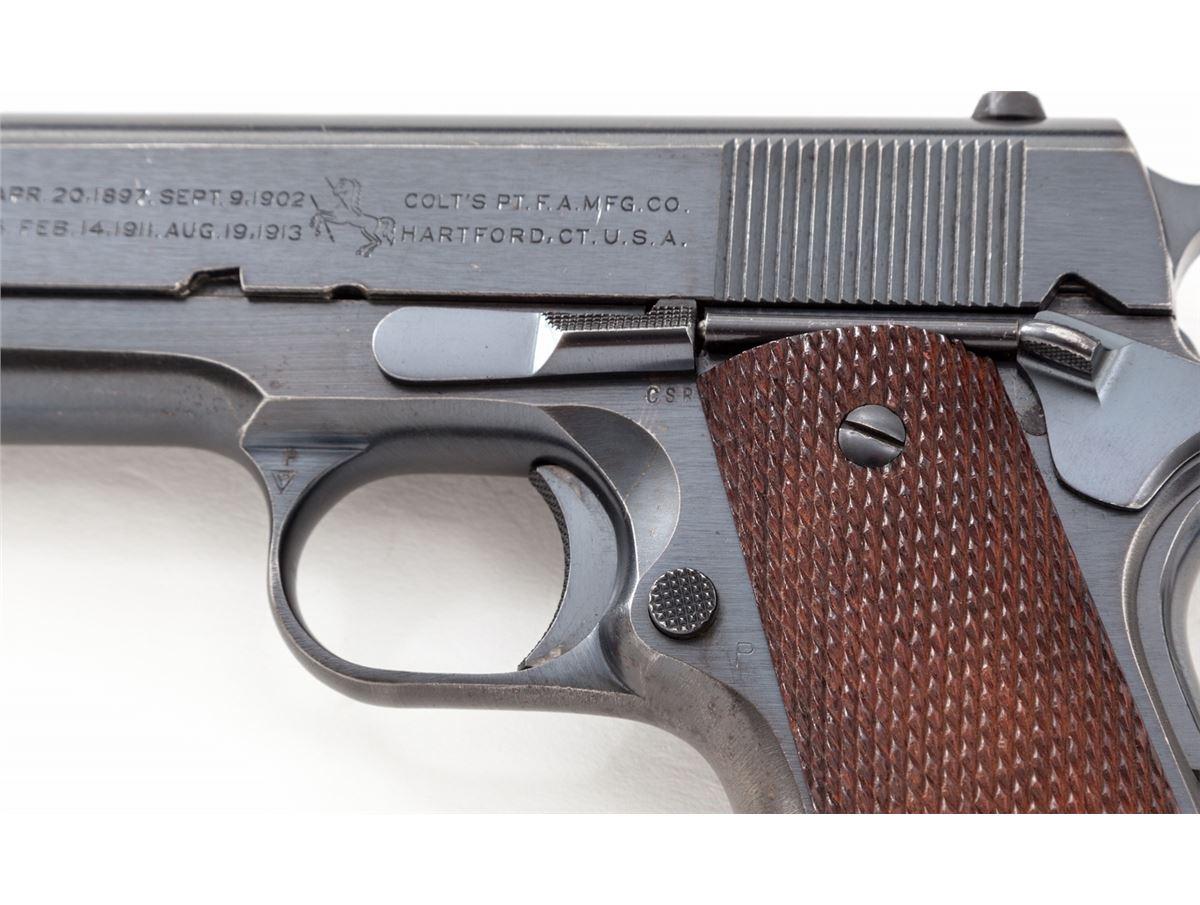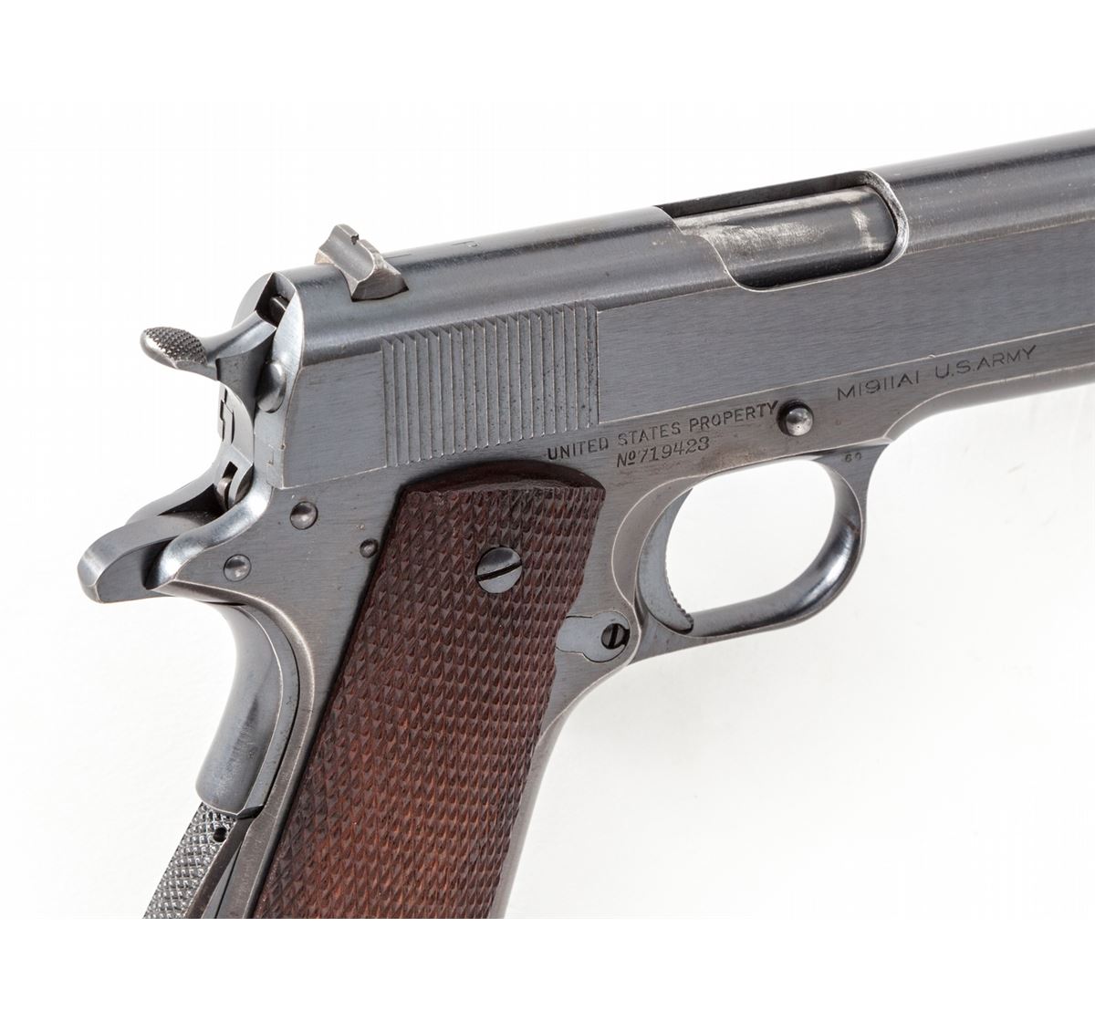 Scarce Colt Model 1911-A1 Semi-Automatic Pistol, #719423, .45 ACP cal., 5'' barrel, blue finish, factory checkered walnut grips, with one two-tone magazine. Mfg'd 1940, as inspected by Charles S. Reed, with ''CSR'' inspector markings just below slide release. Considered scarce with only approx. 4695 delivered in 1940. Pistol additionally features ''P'' just forward rear sight and slightly below and to the right of magazine release. Frame with commercial type ''VP'' markings to left triggerguard bow, as is correct for this variation. Condition is excellent retaining approx. 95% original factory blue with some thinning beneath serial number and to front strap of frame. Light highpoint edgewear, predominantly to muzzle area of slide and forward portion of frame. Slide is numbered #714036. Grips with mild flattening. Action is crisp, bore is fine. Est.: $4,000-$6,000. (C&R/PPT)