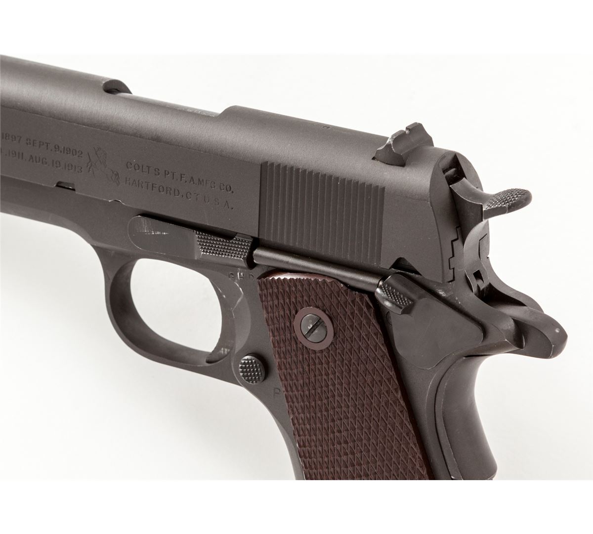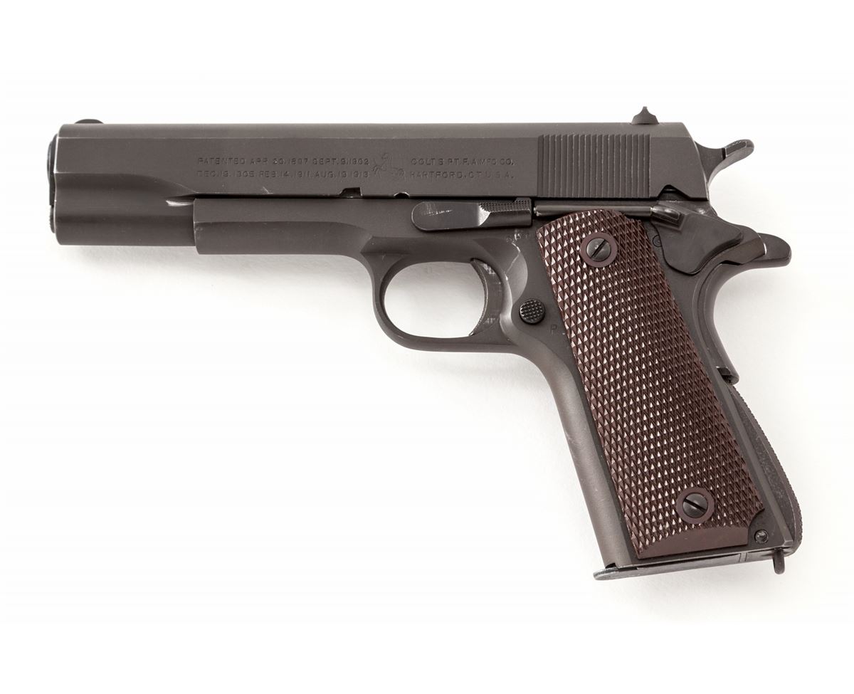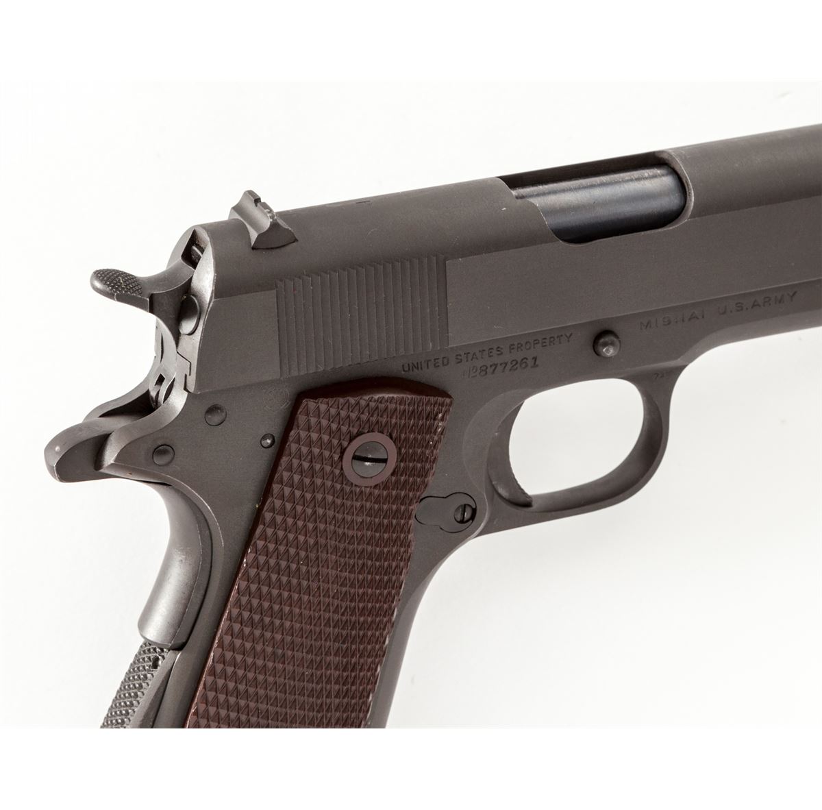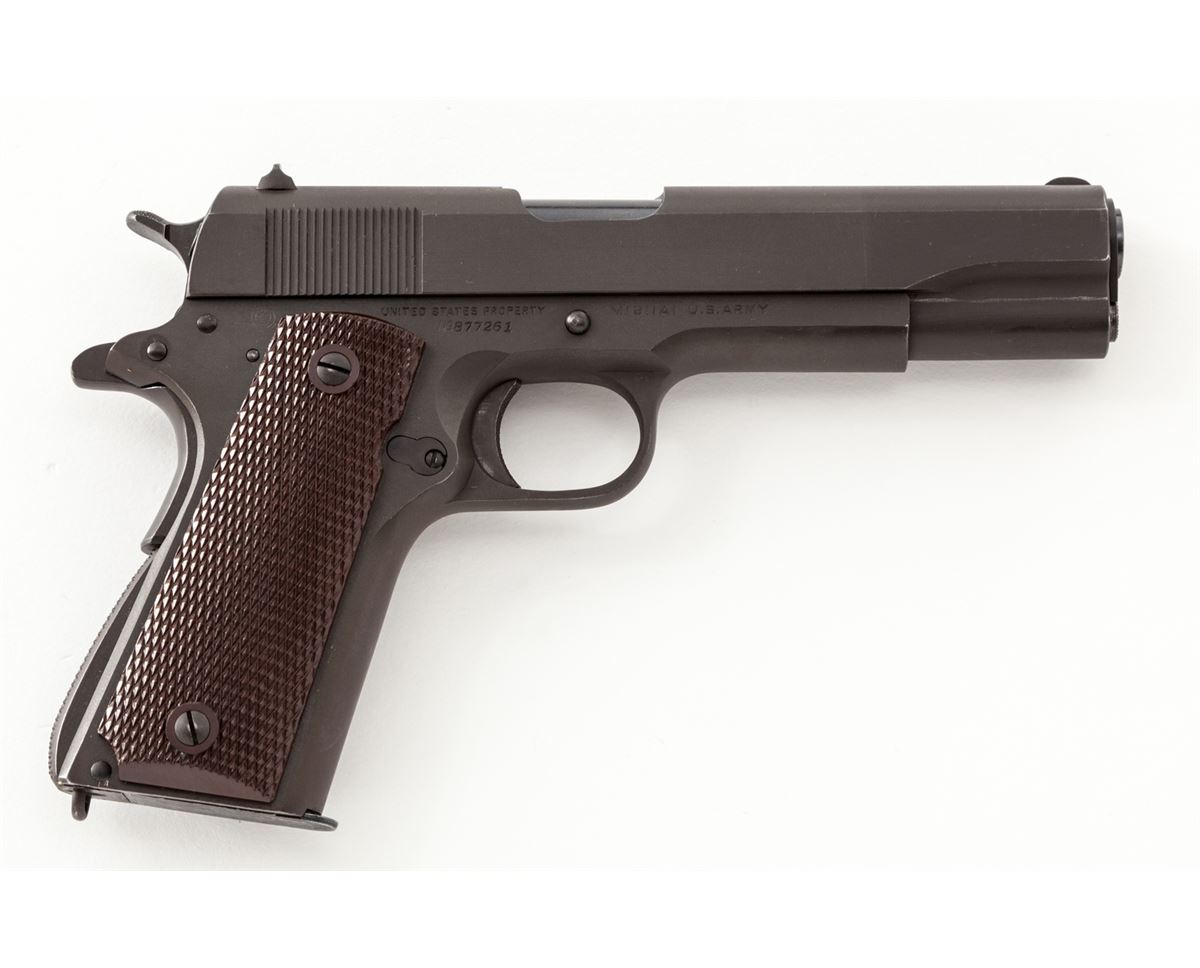 Colt Model 1911-A1 Semi-Automatic Pistol, #877261, .45 ACP cal., 5'' barrel, parkerized fiish, with correct large ring brown checkered plastic grips, with one magazine marked ''C-L''. Matching numbered slide beneath firing pin retainer. Correct early war milled trigger and small font ''G.H.D.'' inspector's mark below slide stop. Barrel marked ''Colt 45 Auto'' to left side above lug, with ''G'' in the 6 o'clock position just forward the lug. Condition is excellent retaining approx. 95%+ factory finish, with thinning at muzzle, in actioning areas of slide, trigger and grip safety. Grips are crisp, action is good, bore is fine. Est.: $1,500-$2,000. (C&R/PPT)