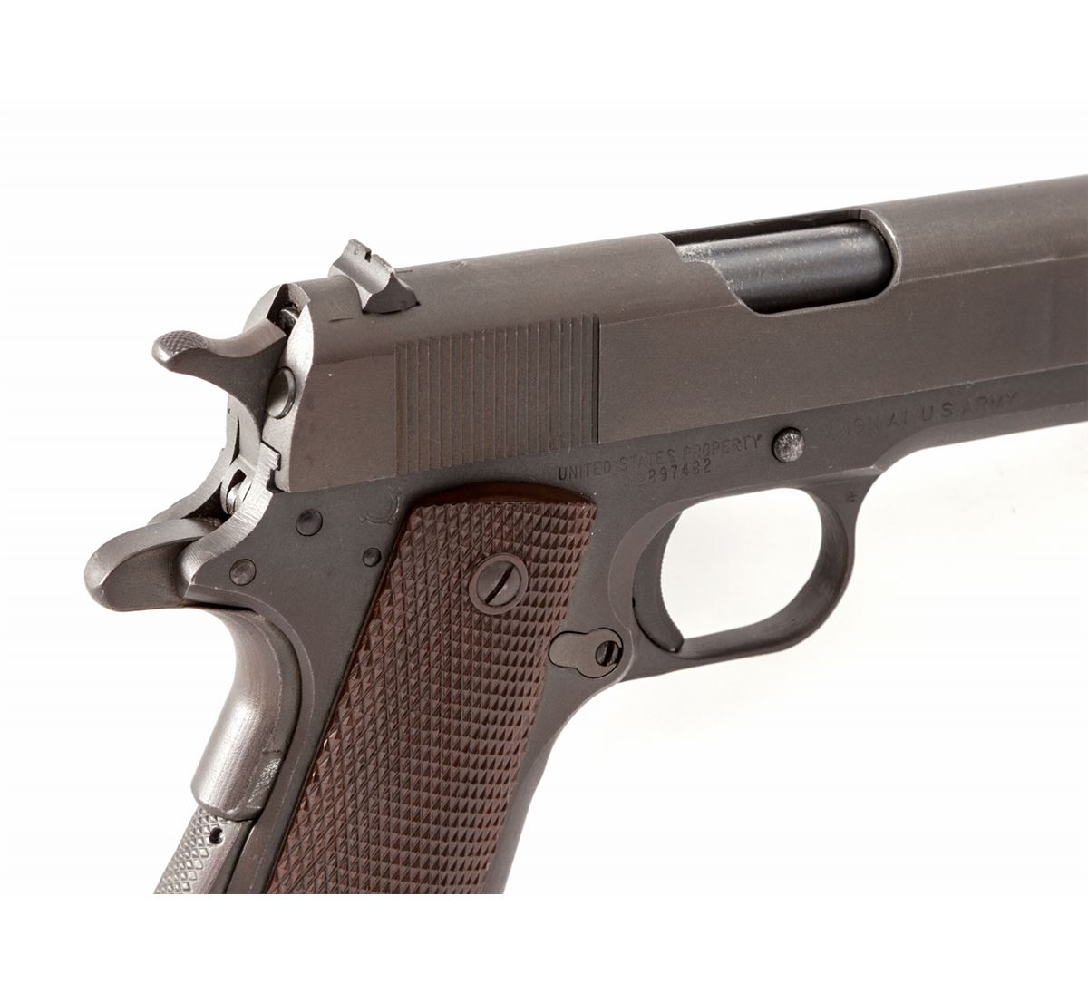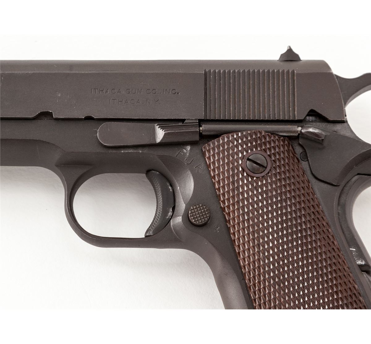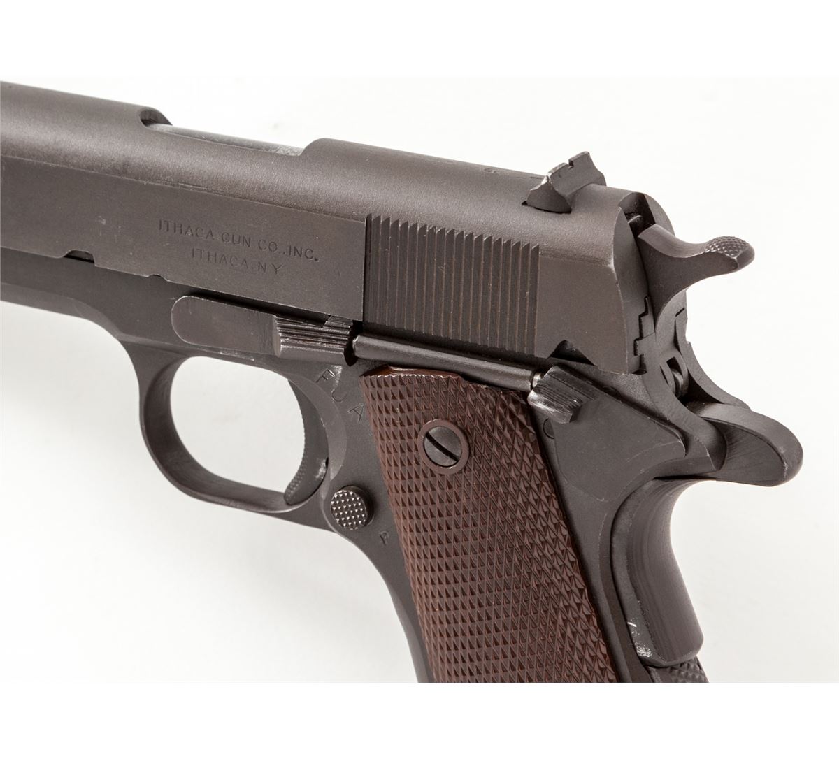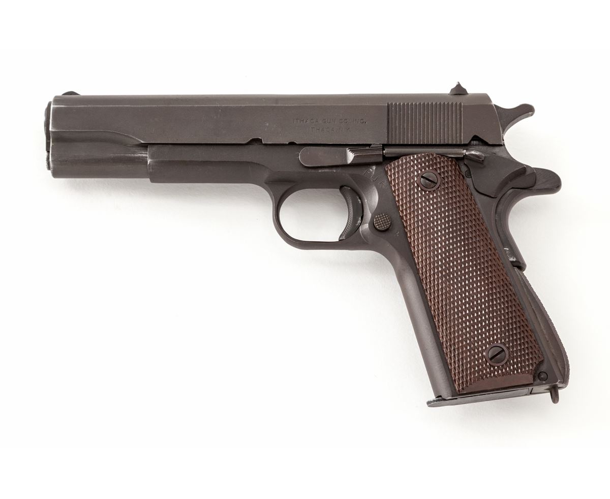 Ithaca Model 1911-A1 Semi-Automatic Pistol, #897482, .45 ACP cal., 5'' barrel, parkerized finish, with correct small ring brown checkered plastic grips, one blue Risdon marked magazine, and ''HS'' marked barrel. Condition is excellent retaining approx. 95%+ factory finish, with thinning at muzzle, in actioning areas of slide, trigger and grip safety. Grips are crisp, action is good, bore is fine. Est.: $1,200-$1,800. (C&R/PPT)