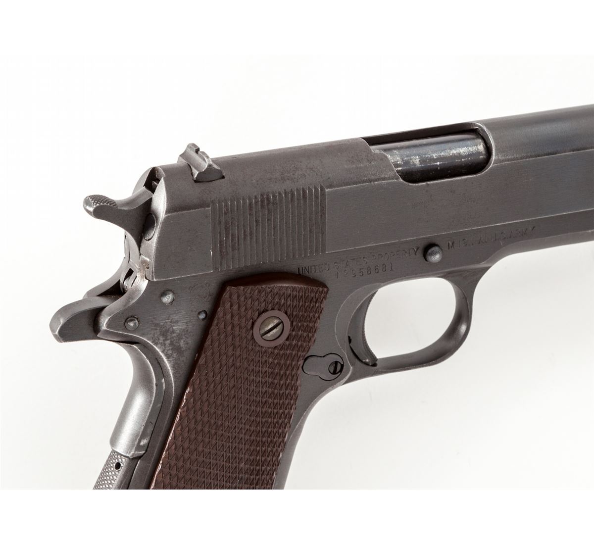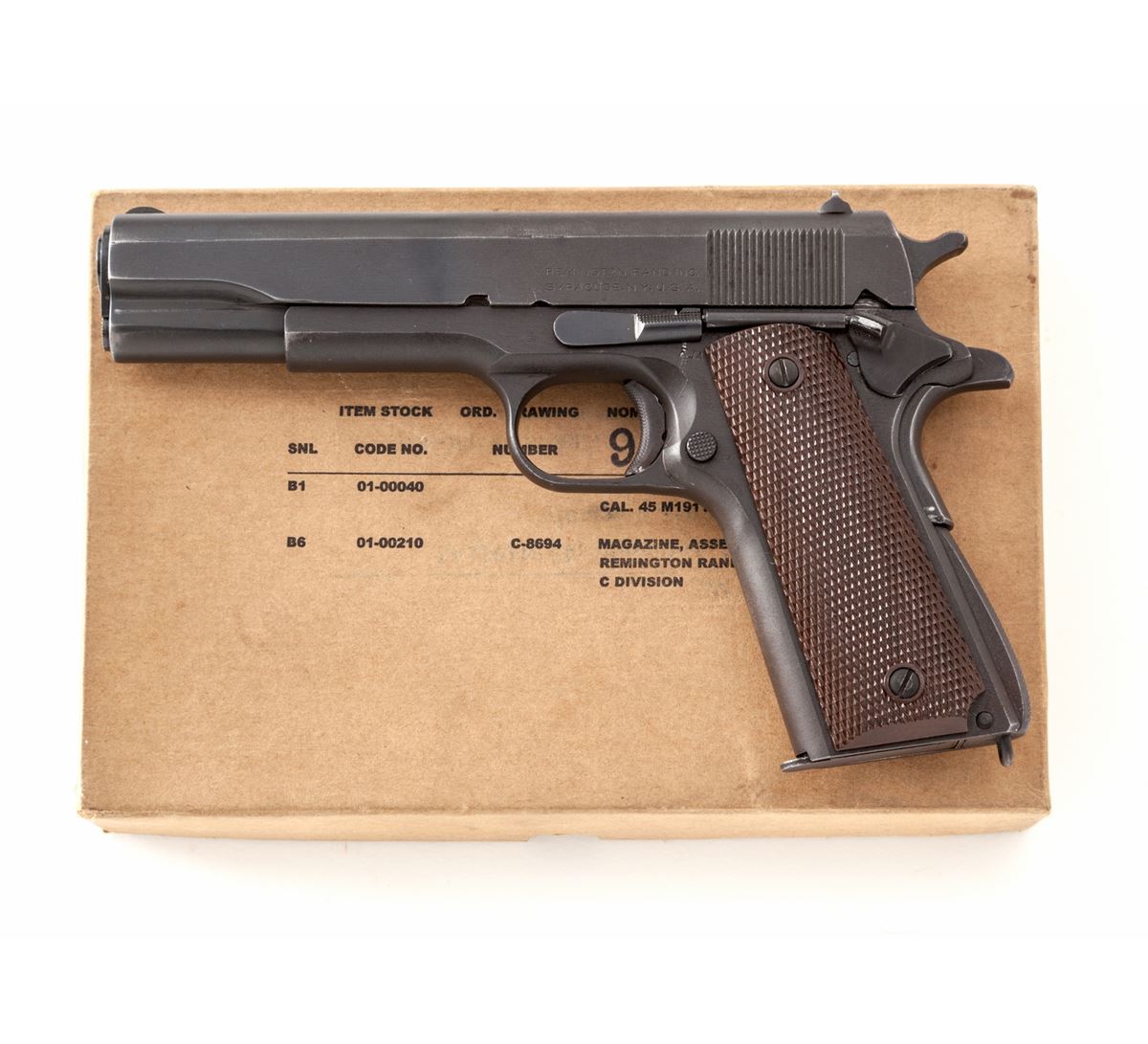 Remington-Rand Model 1911-A1 Semi-Automatic Pistol, 2nd Type, #958681, .45 ACP cal., 5'' blue HS barrel, dulite finish, GI brown plastic checkered grips, with one ''S'' marked magazine, in kraft box with unopened extra magazine. Condition is near excellent retaining approx. 95% finish, with thinning to forward portion of slide, front strap and frame, and thinning and mild toning to right side of frame beneath hammer. Left grip panel is correct; right grip panel is of Colt mfg. Action is crisp, bore is bright. Est.: $1,800-$2,400. (C&R/PPT)