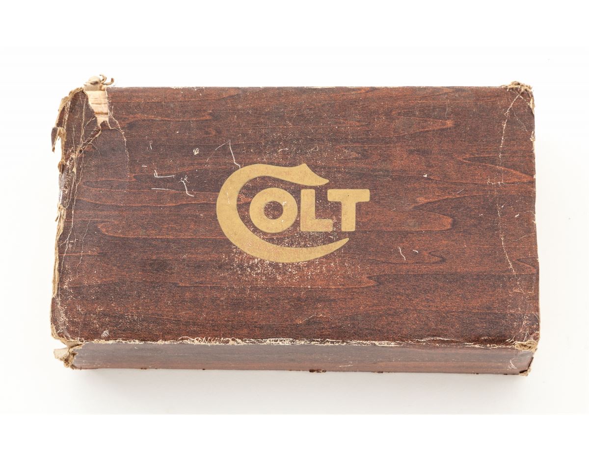 Colt MK IV Series 70 Gold Cup National Match, #70N26388, .45 ACP cal., 5'' barrel, blue finish, factory checkered walnut grips with gold Colt medallions. Condition is excellent, appearing as new, in its original box. Box is missing end label and shows moderate tattering. Est.: $1,200-$1,800. (Modern/PPT)