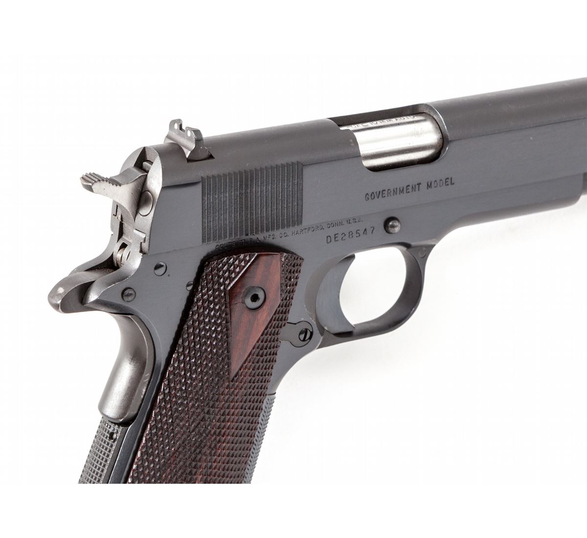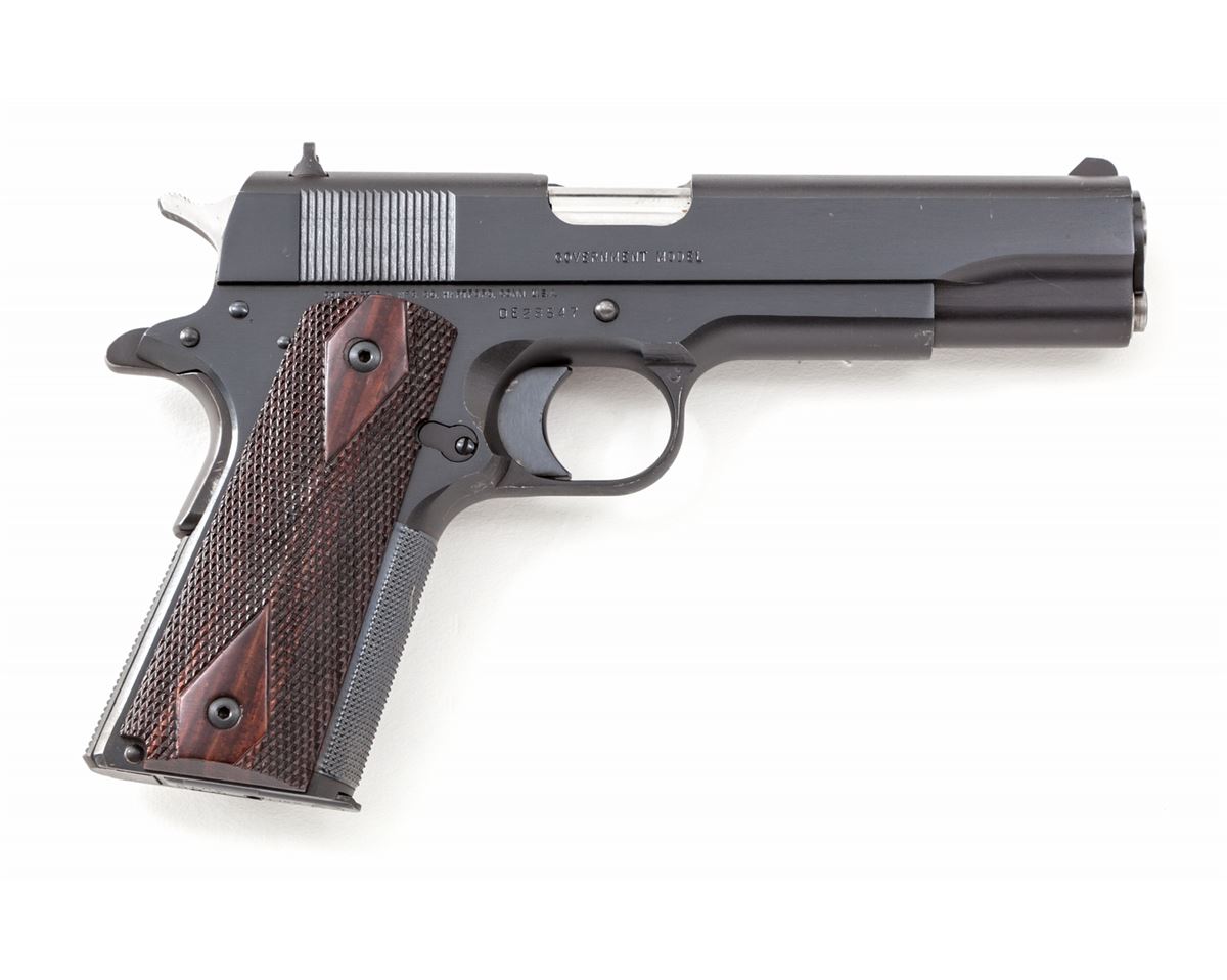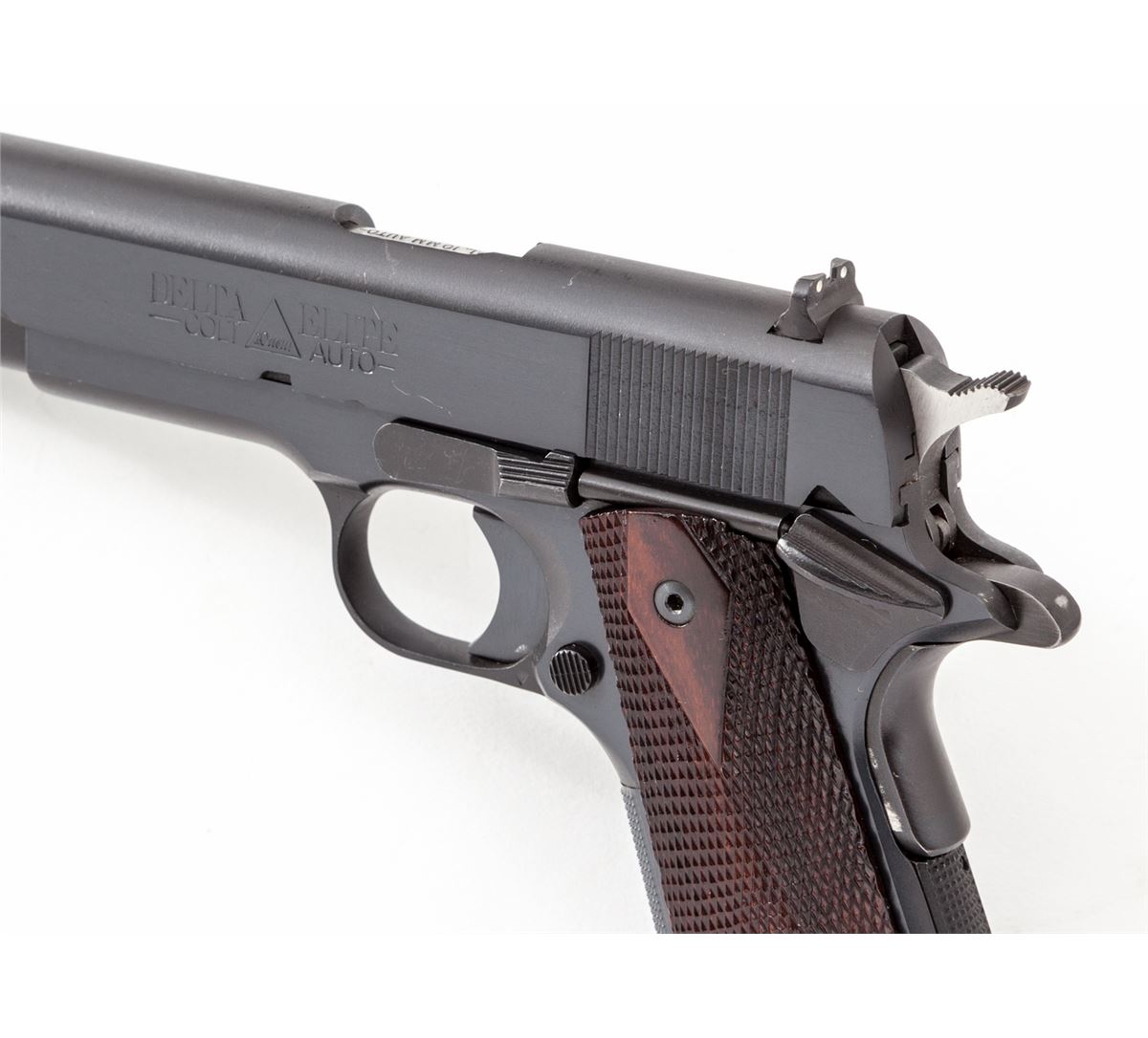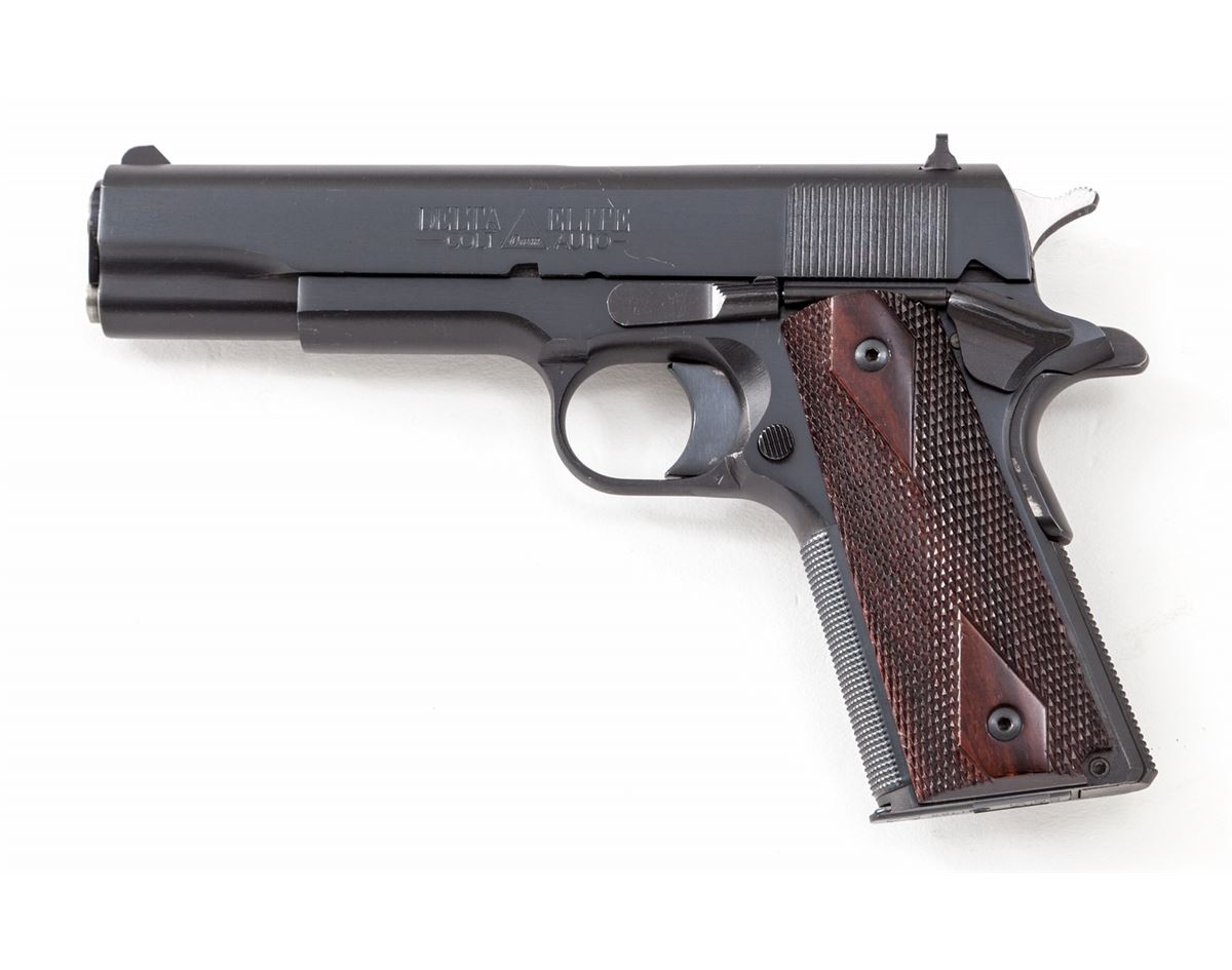 Colt Delta Elite Semi-Automatic Pistol, #DE28547, 10mm, 5'' barrel, blue finish, aftermarket checkered rosewood grips, with flat checkered mainspring housing, added checkered front strap insert, long trigger, 3-Dot sight system, with Allen head grip screws, and one Colt 10mm magazine. Condition is excellent showing light marks from handling, with small scratch to left side of slide and thinning in actioning areas. Grips are crisp, action is tight, bore is bright. Est.: $1,200-$1,800. (Modern/PPT)