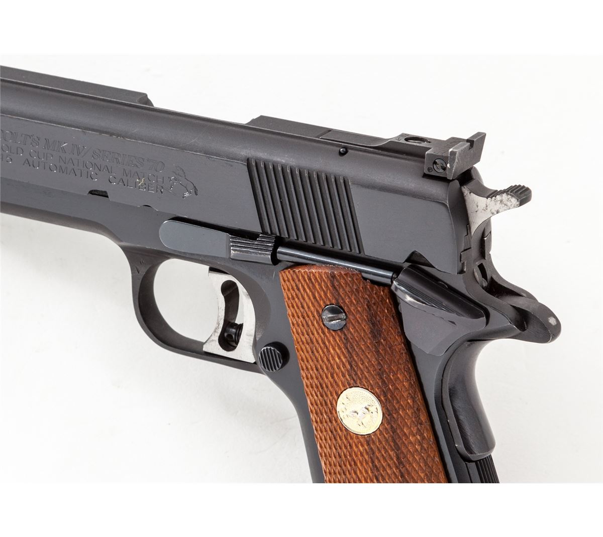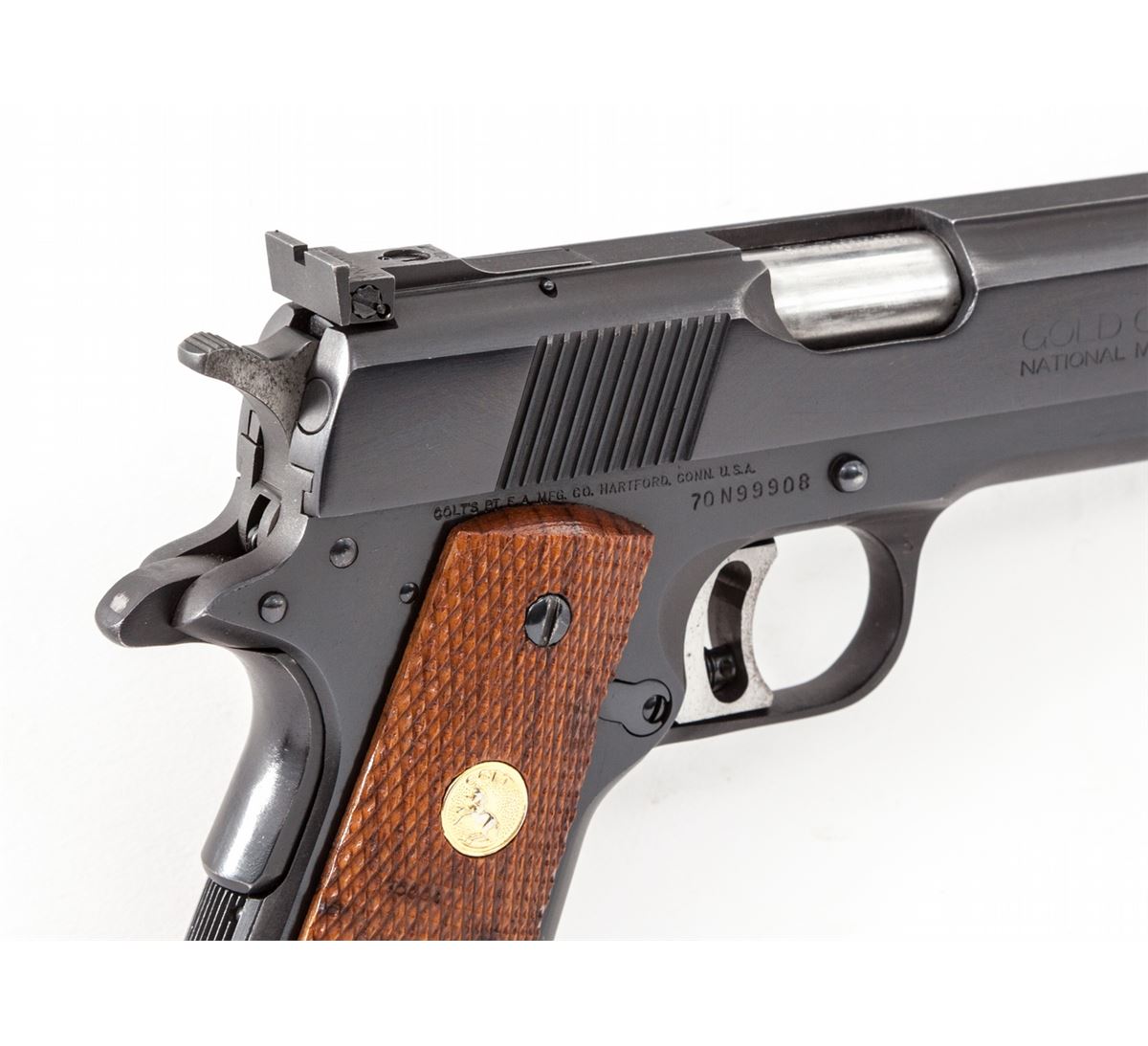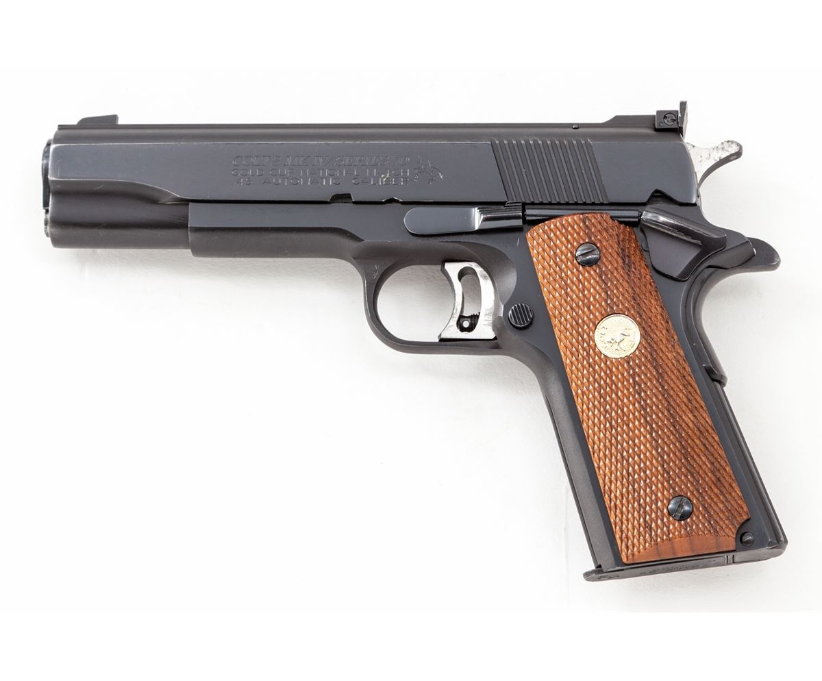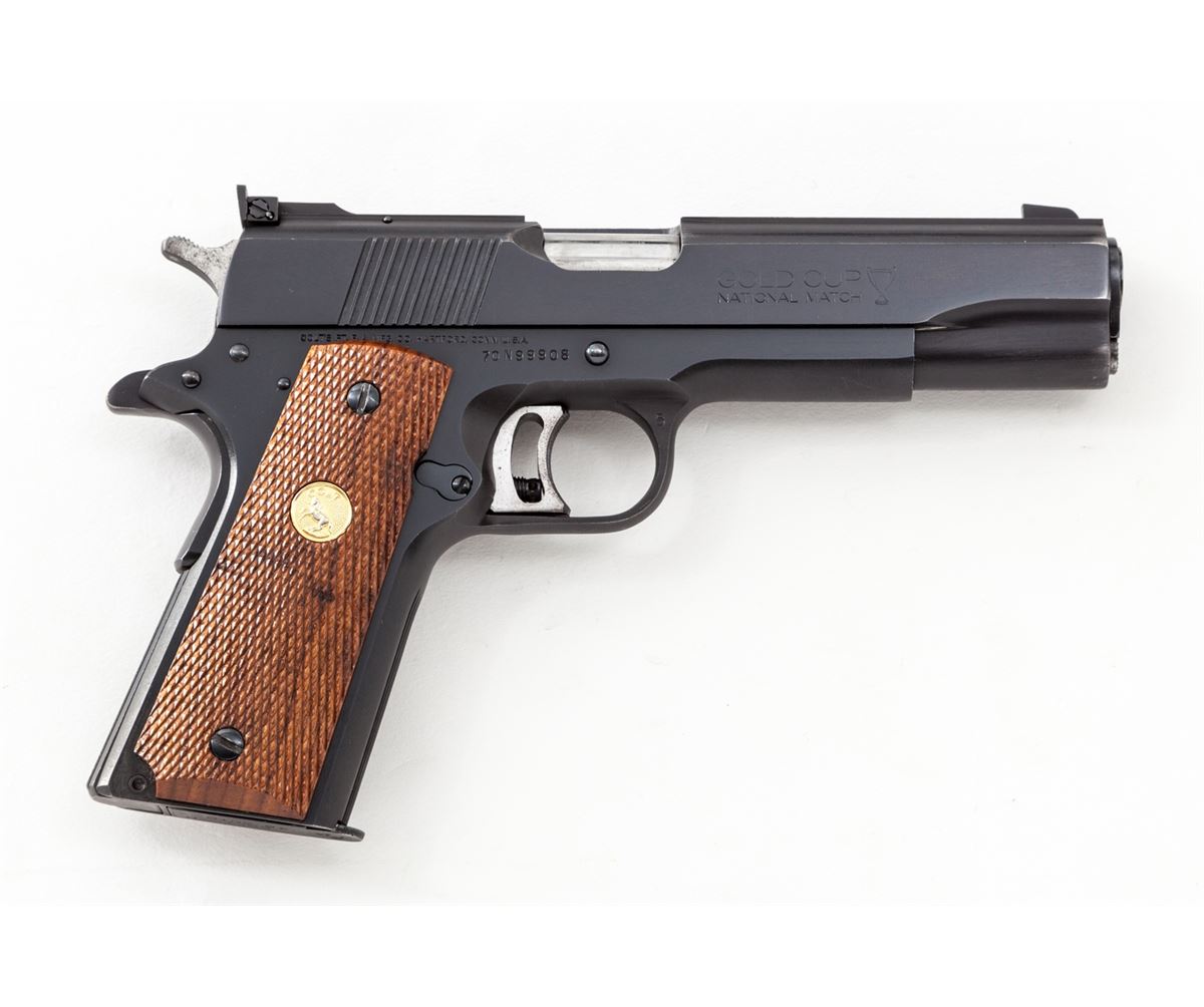 Colt MK IV Series 70 Gold Cup National Match Semi-Automatic Pistol, #70N99908, .45 ACP cal., 5'' barrel, blue finish, factory checkered walnut grips with gold Colt medallions. Condition is excellent showing only light wear at muzzle and in actioning areas. Grips are crisp, action is tight, bore is mirror bright. Est.: $1,000-$1,500. (Modern/PPT)