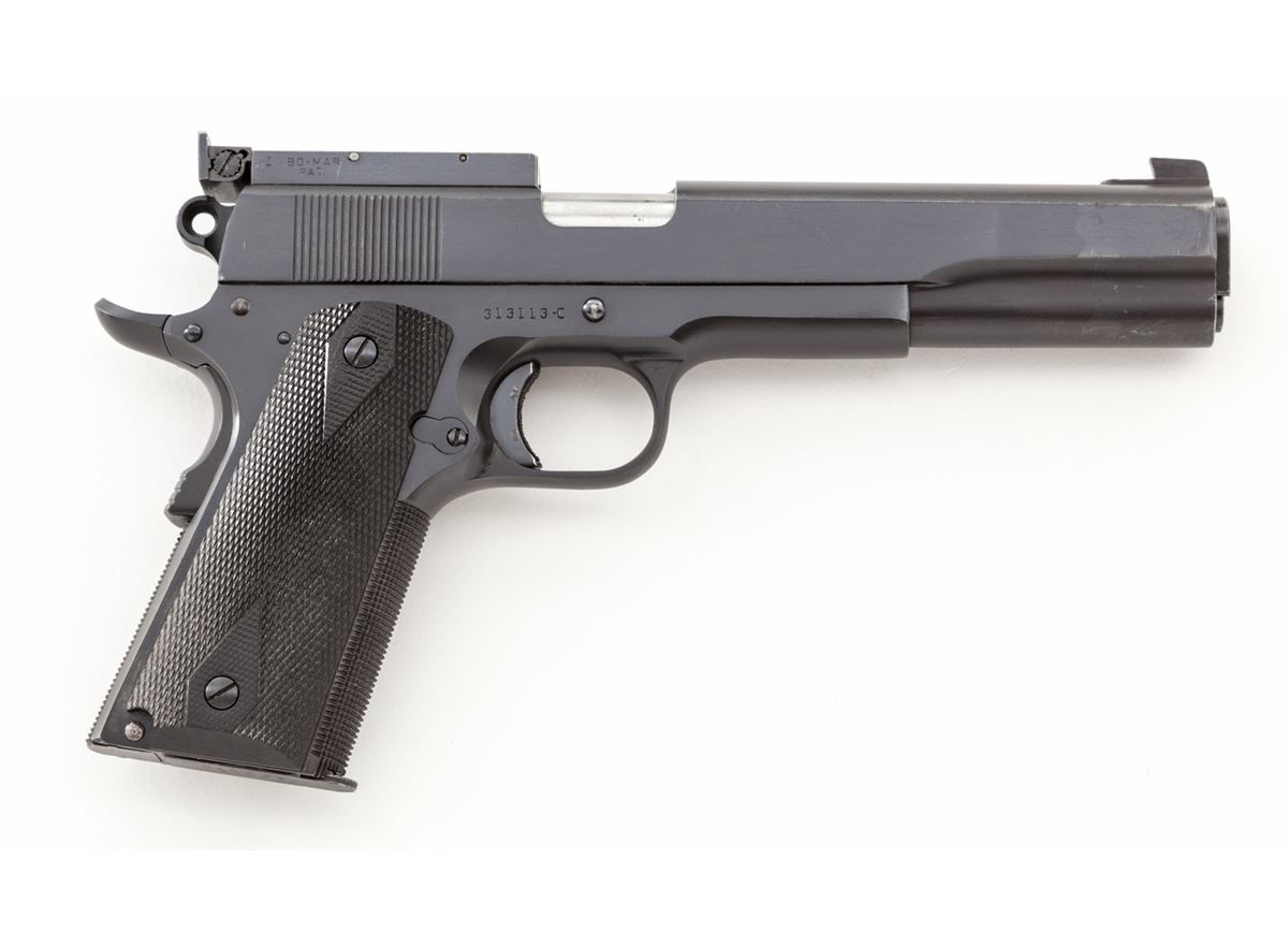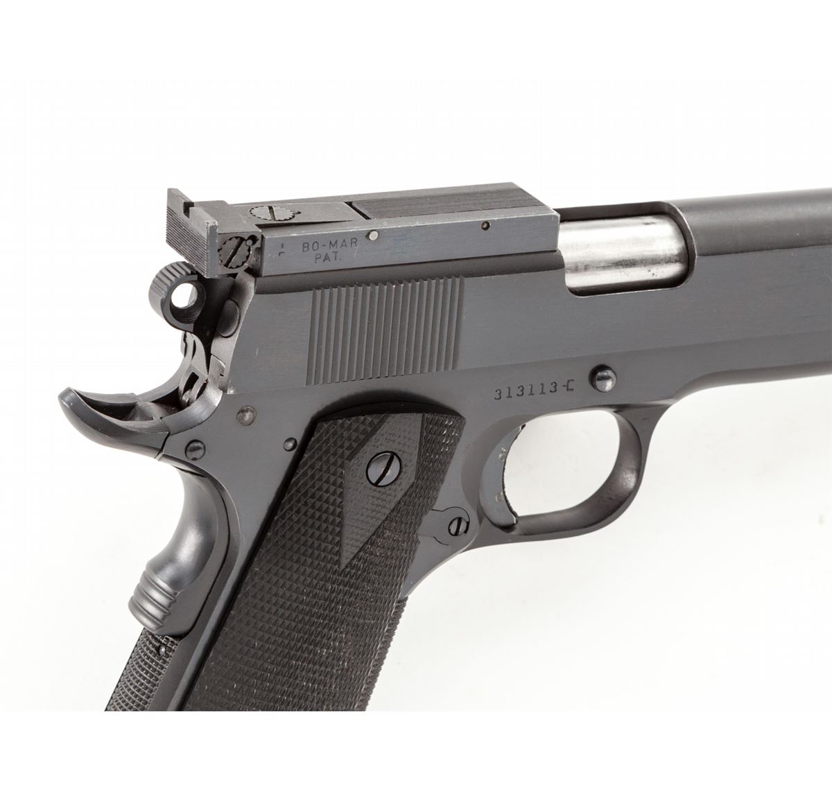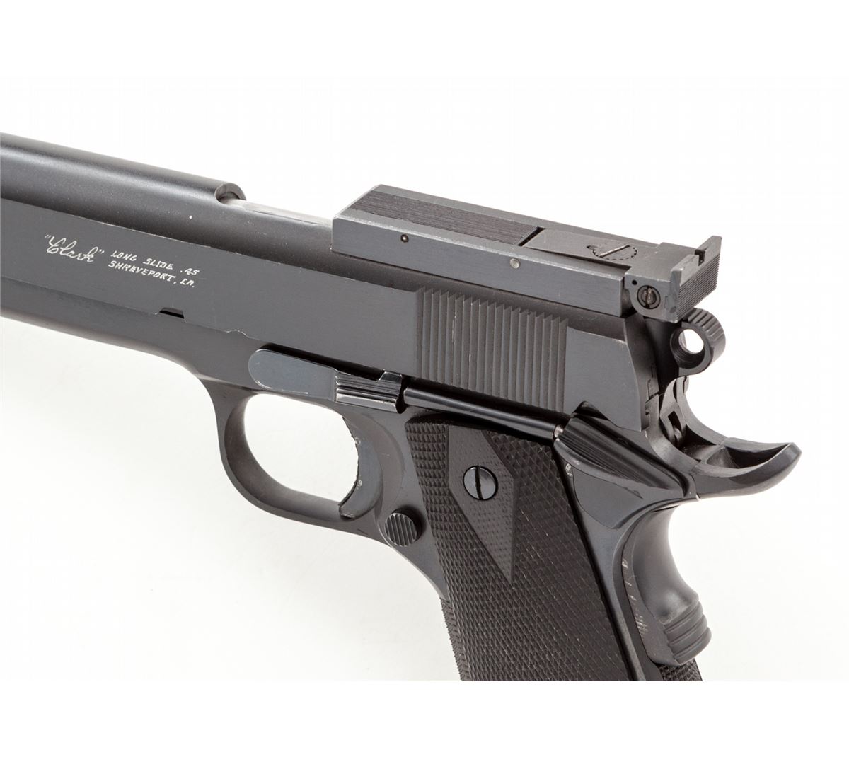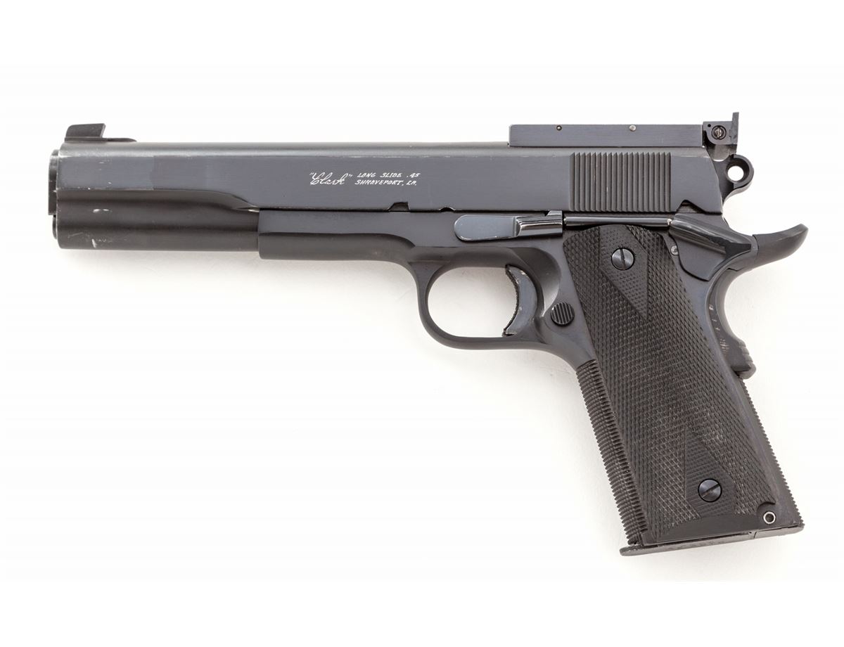 Clark Long Slide/Colt Government Model, #313113-C, .45 ACP cal., 6'' barrel, extended slide marked '''Clark' Long Slide .45/Shreveport, LA''; blue finish, checkered black plastic grips, with Bomar partial rib, lightened Commander hammer, extended grip safety, flat checkered mainspring housing, checkered front strap, and three (3) magazine. Condition is excellent as modified showing light wear at muzzle. Stippled trigger shows evidence of triggershoe (now removed). Action is crisp, trigger is light, bore is bright. est.: $1,800-$2,400. (C&R)