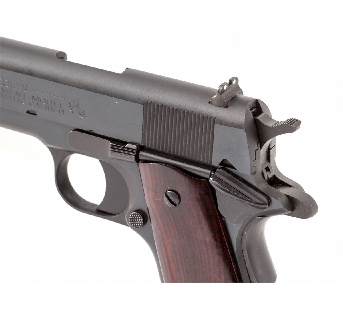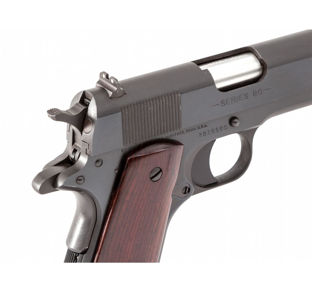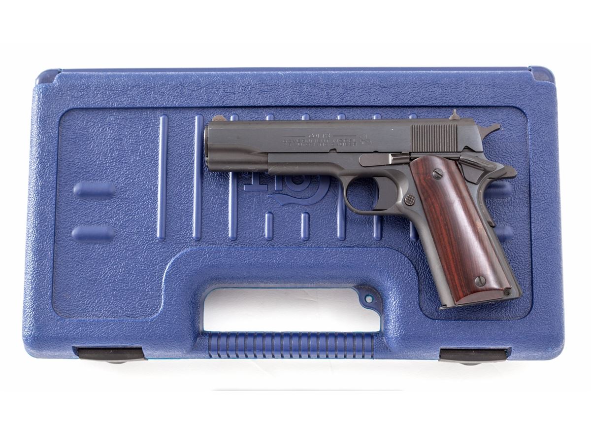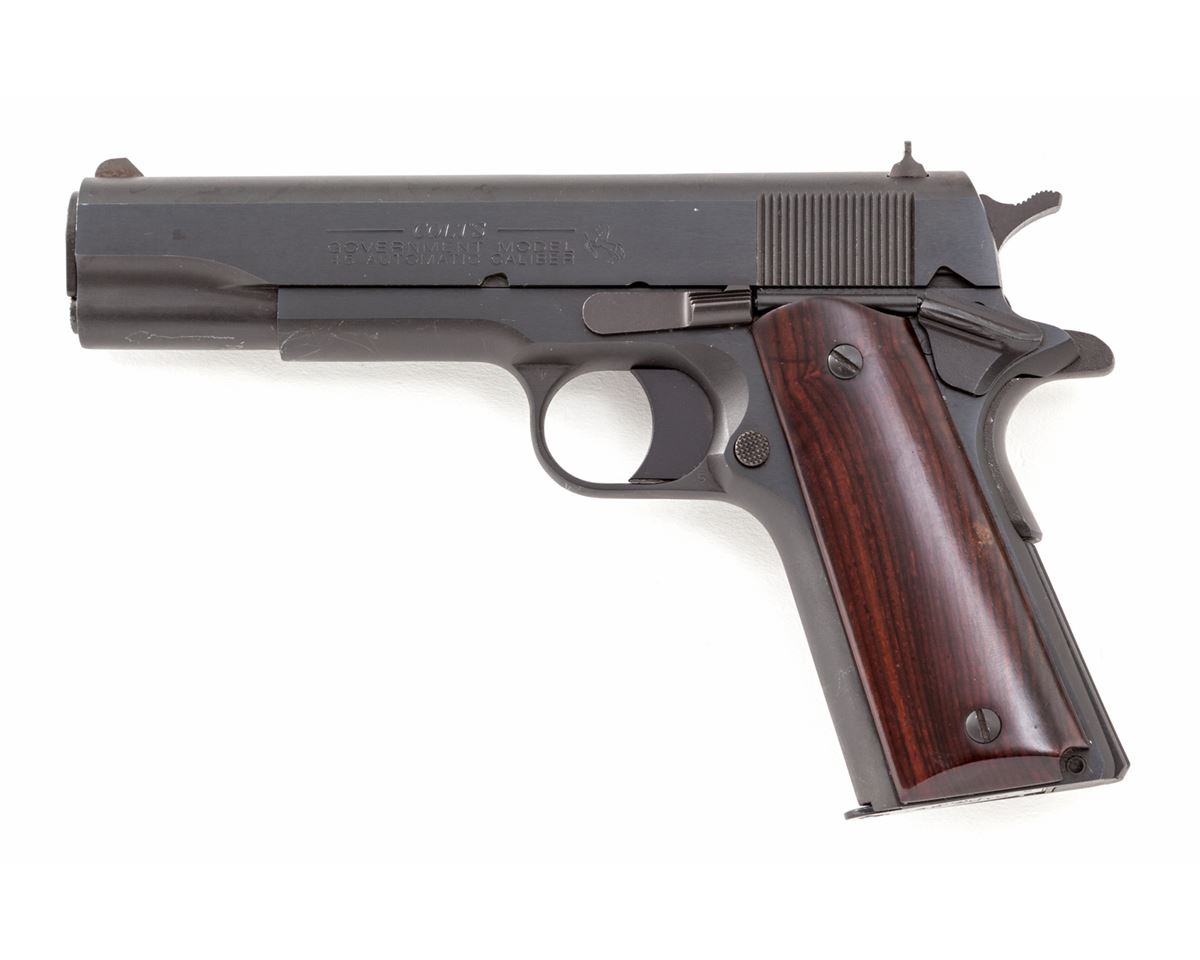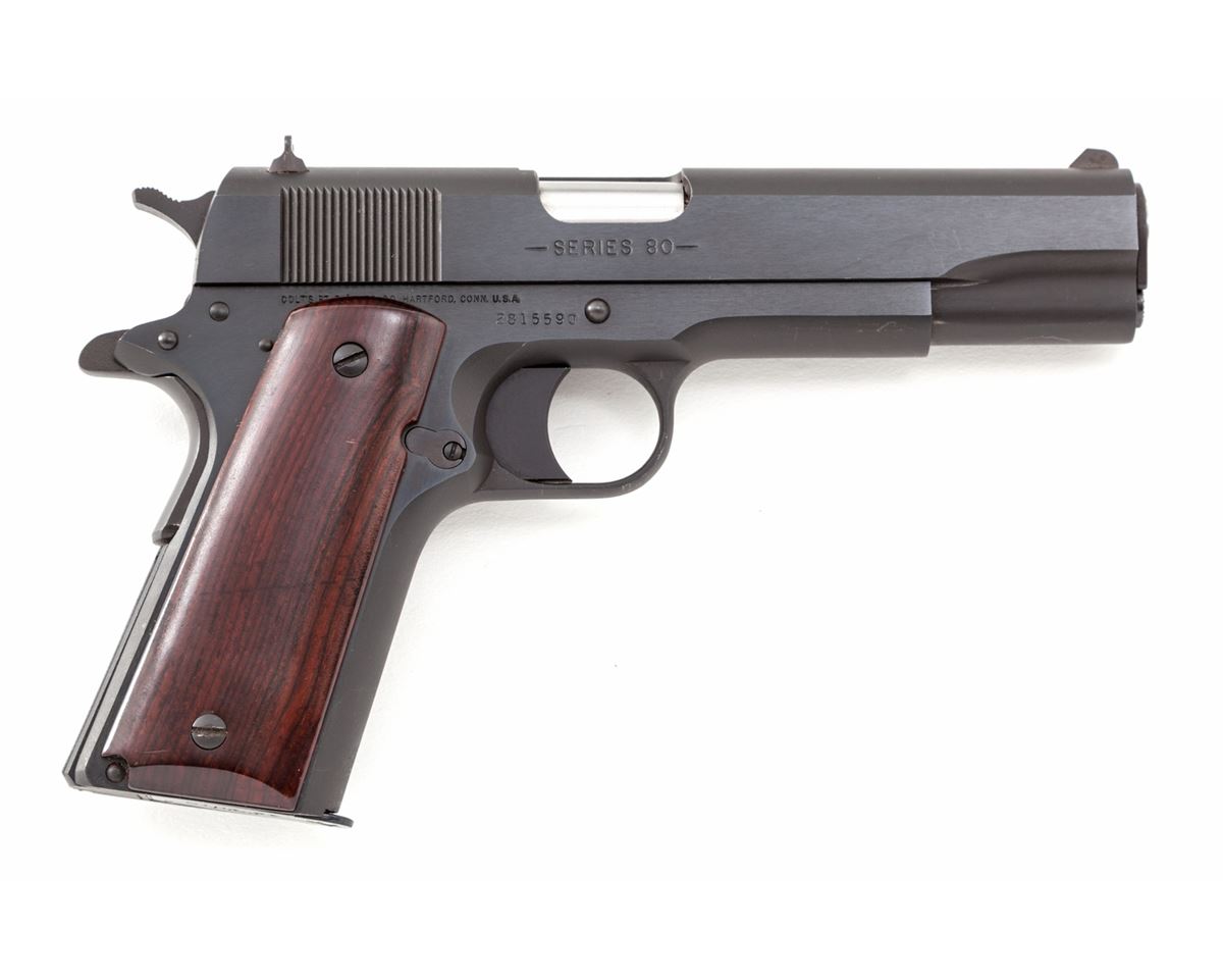 Colt Series 80 Gov't Model Semi-Automatic Pistol, #2815590, .45 ACP cal., 5'' barrel, blue finish, smooth rosewood grips, with 3-dot sight system and one factory magazine. Condition is excellent showing little use, in original box with instructions and gun lock. Est.: $500-$750. (Modern/PPT)