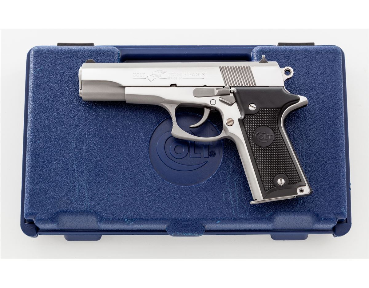 Colt Double Eagle Series 80 Semi-Automatic Pistol, #DA14692, .45 ACP cal., 5'' barrel, bright stainless steel, factory checkered black plastic grips, with two (2) magazines, in original hard case with instructions. Condition is excellent showing only light marks from handling. Est.: $800-$1,200. (Modern/PPT)
