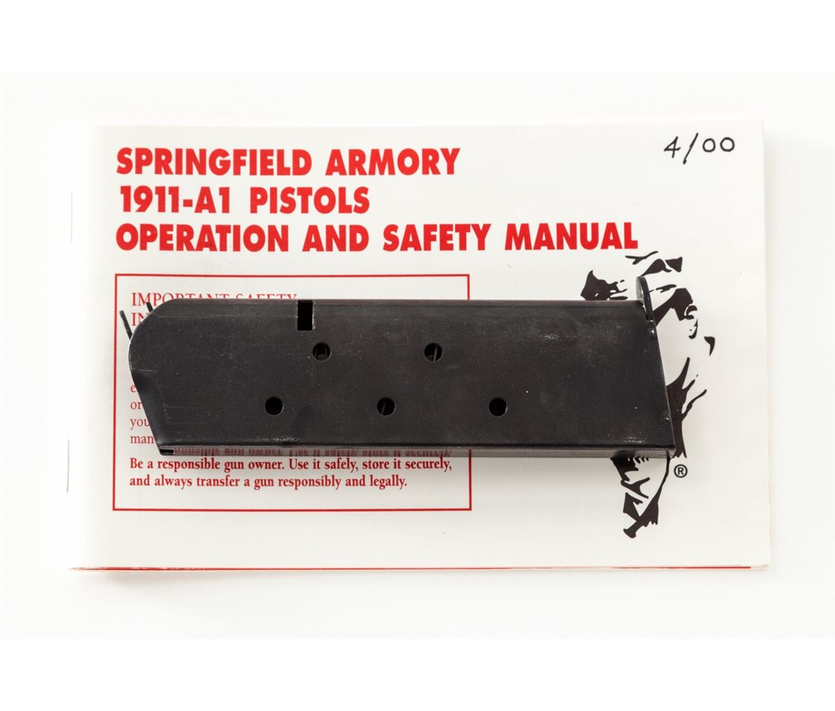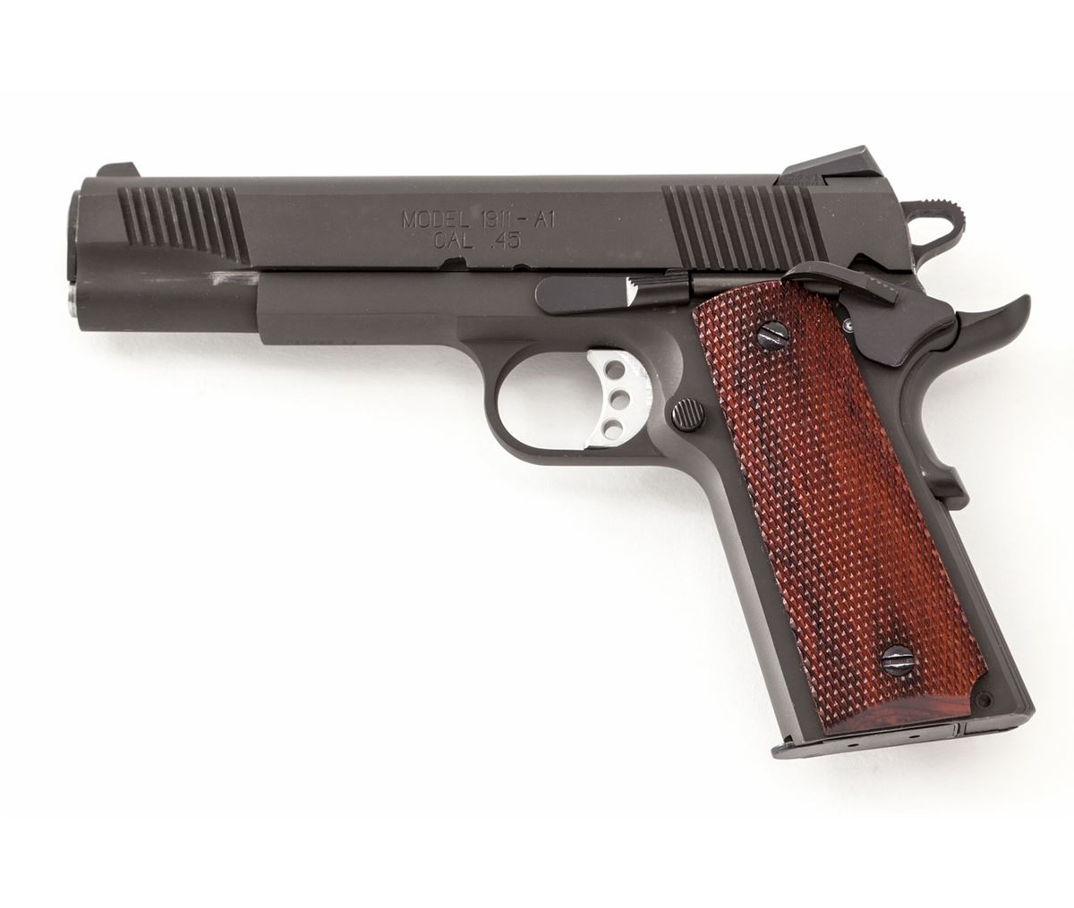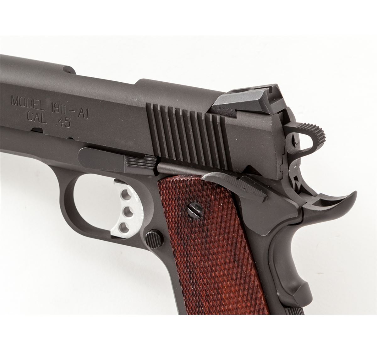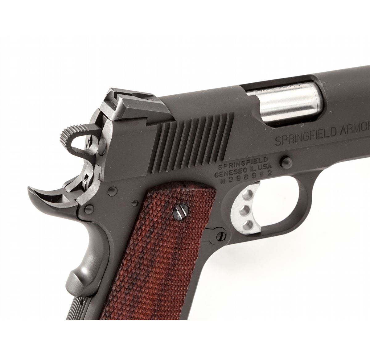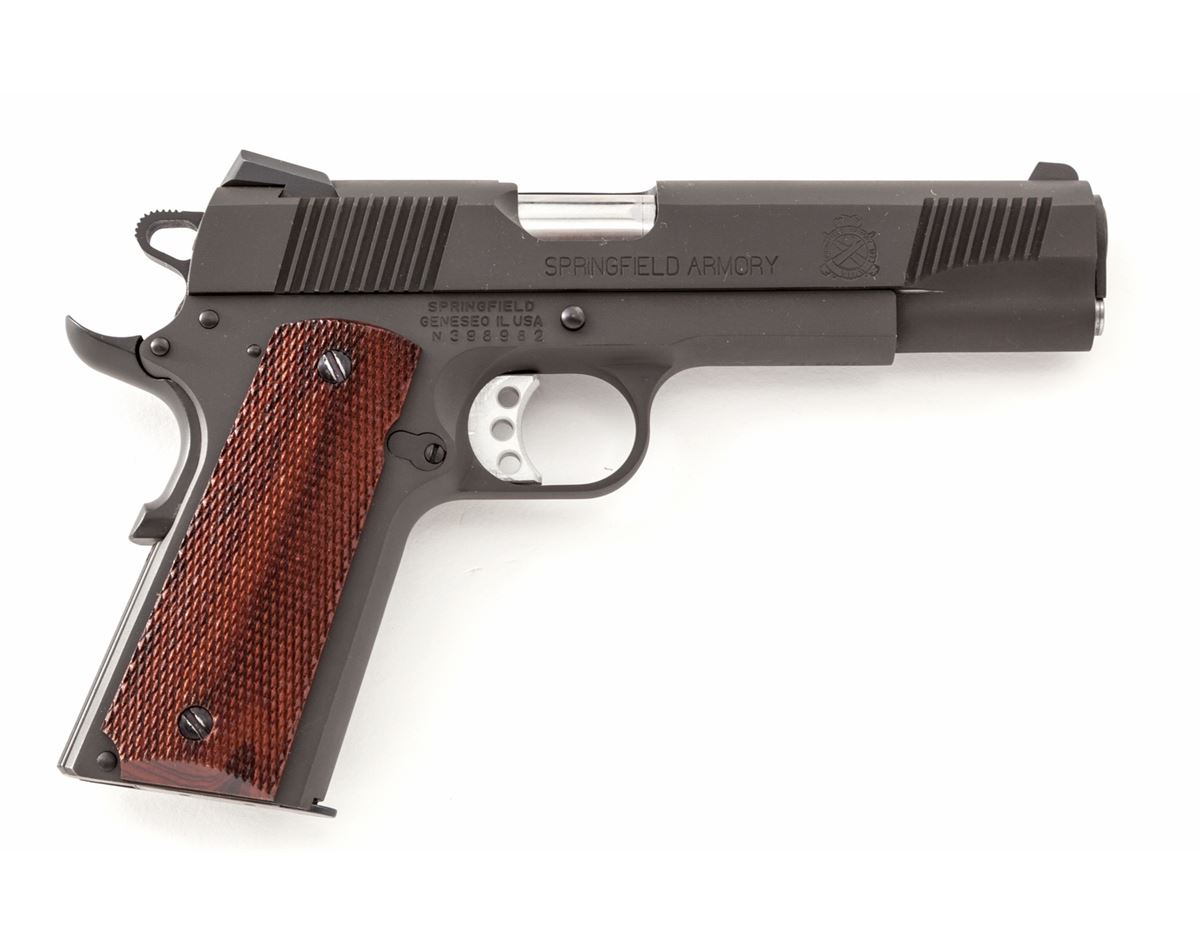 Springfield Armory Model 1911-A1 Semi-Automatic Pistol, #N398982, .45 ACP cal., 5'' barrel, phosphate finish, checkered walnut grips, with Novak's sights, aluminum trigger, extended thumb safety, instructions, and two (2) blue magazines. Condition is excellent remaining near new, showing just light thinning in actioning areas of slide. Some bright metal showing through at grip screw slots. Est.: $600-$800. (Modern/PPT)