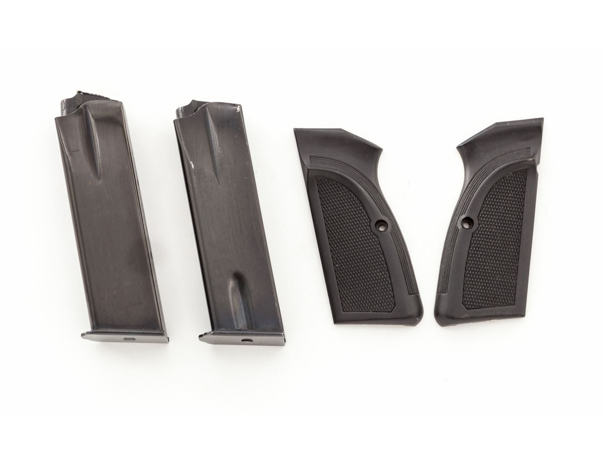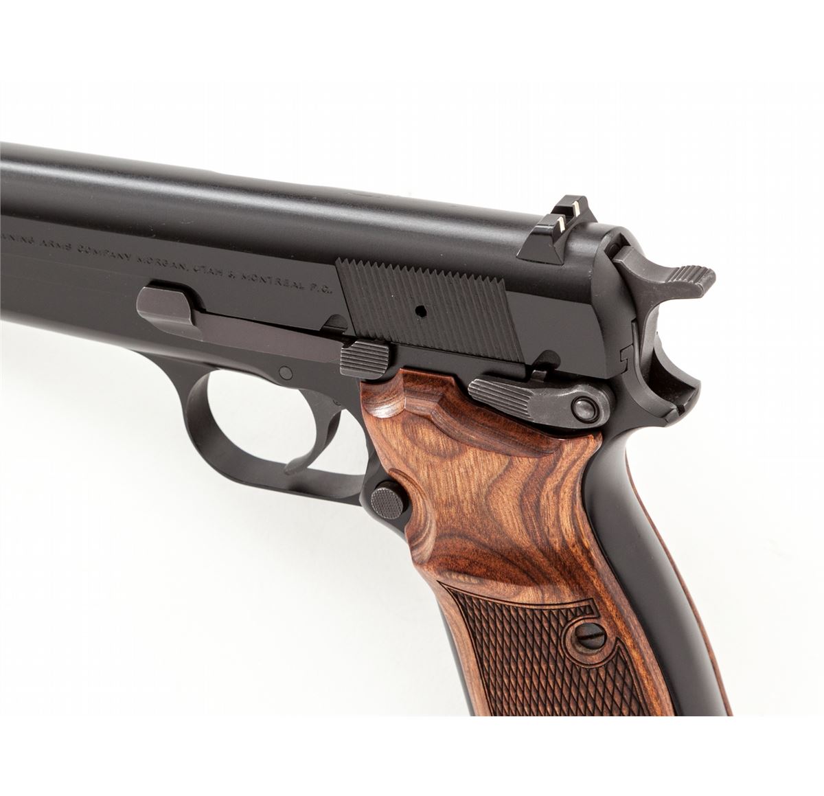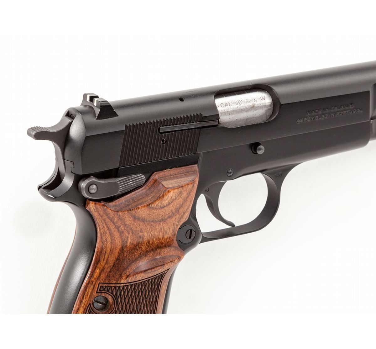 Browning Hi-Power Semi-Automatic Pistol, #2W5NT50957, .40 S&W cal., 4-3/4'' barrel, satin black finish, laminated checkered hardwood grips with fleur d'lis pattern, as well as original black plastic grips, with two (2) factory 10-round magazines and one competition 10-round magazine. Condition is excellent, appearing near new, in original box with instructions. Est.: $500-$750. (Modern)