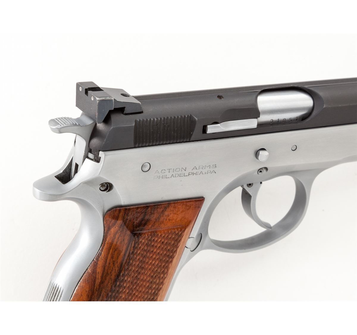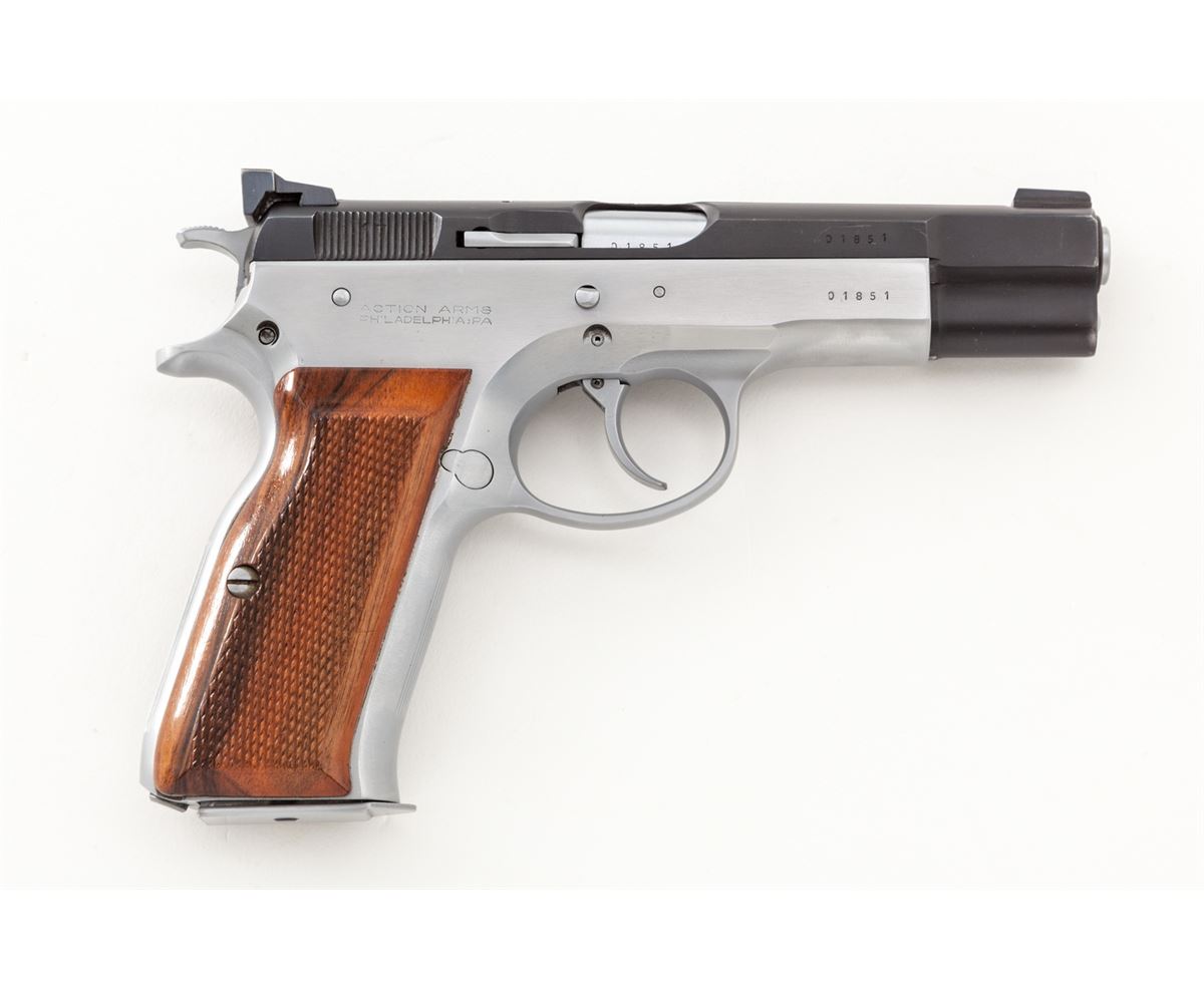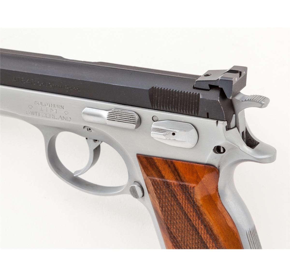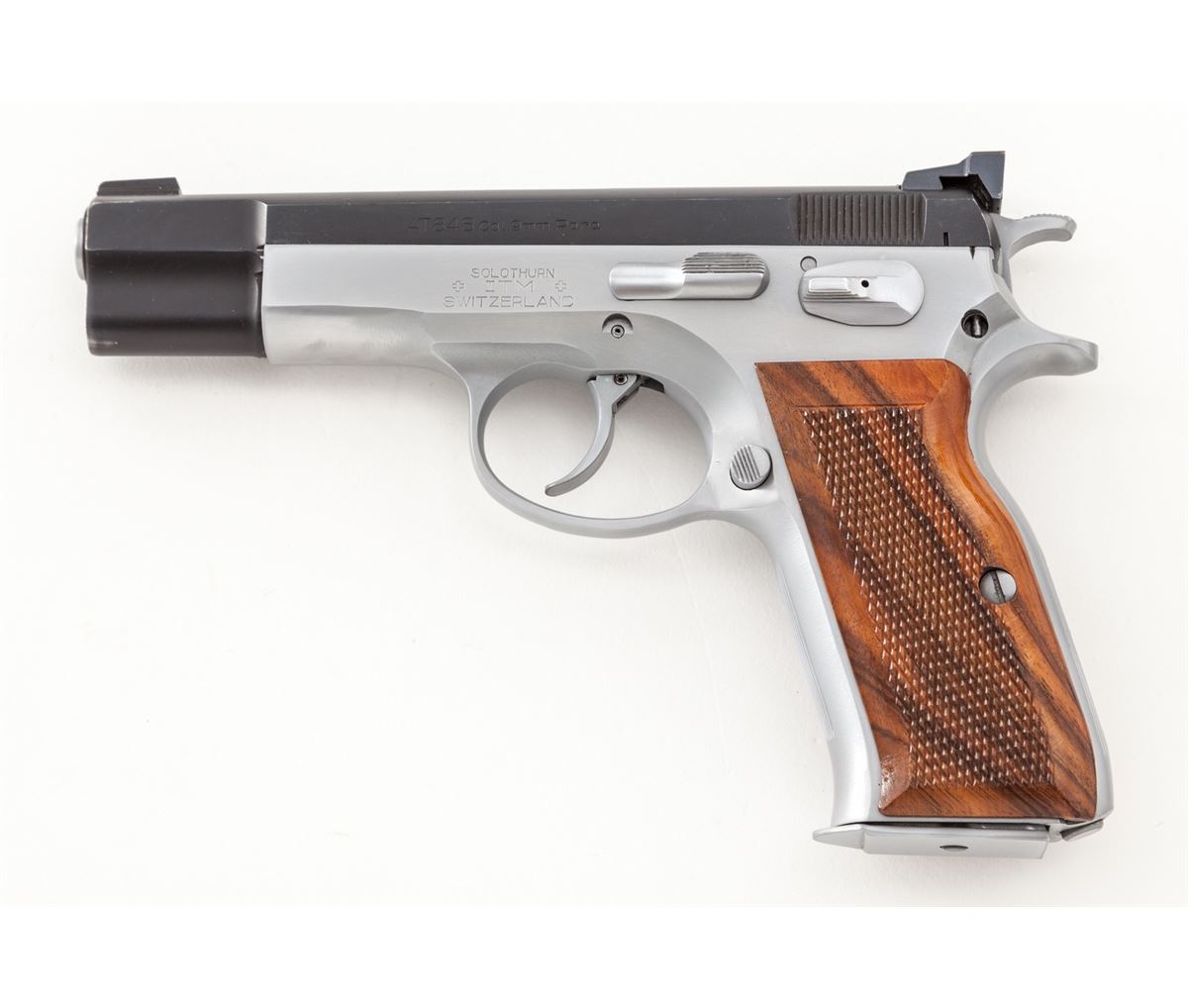 Swiss AT-84S Semi-Automatic Pistol, #01851, 9mm, 4.5'' barrel, two-tone stainless, checkered European walnut grips, with one high-capacity magazine. Condition is excellent showing light holster wear as thinning to finish at forward portion of slide. Crisp grips and action, bright bore. Est.: $500-$750. (Modern) (Not available to Calif. residents.)