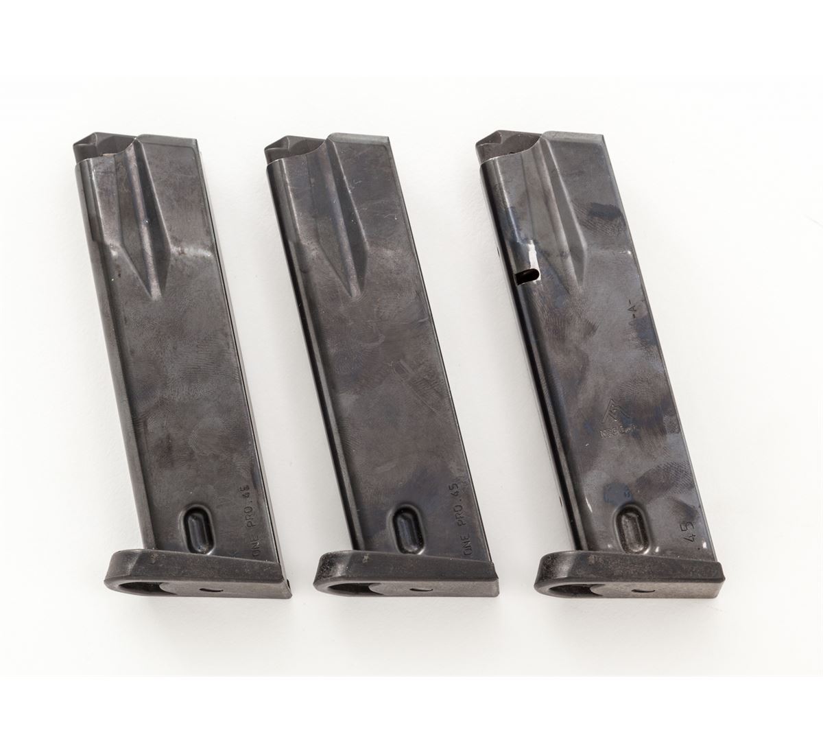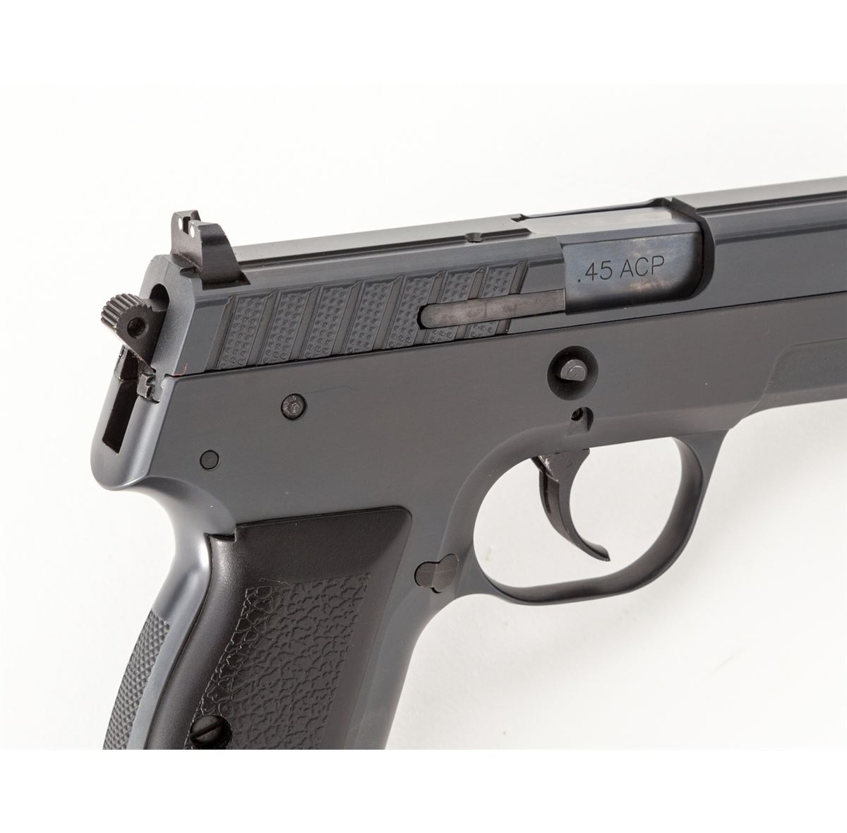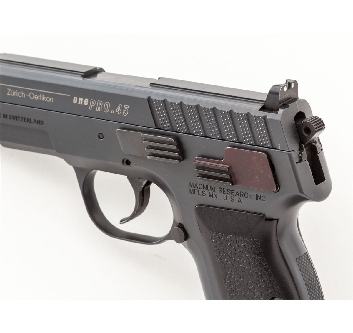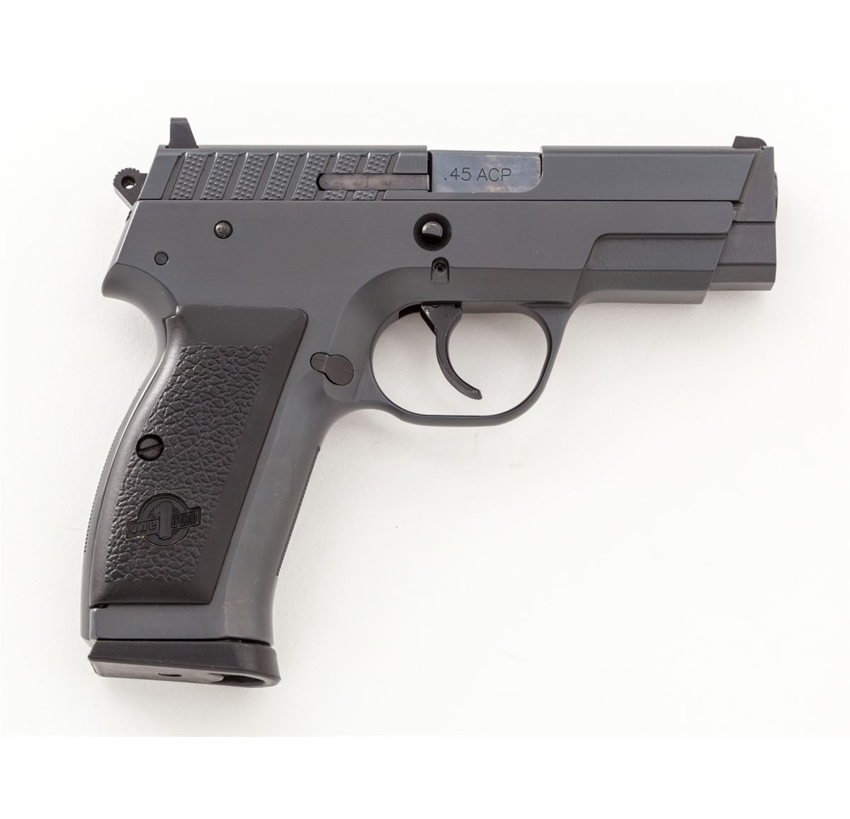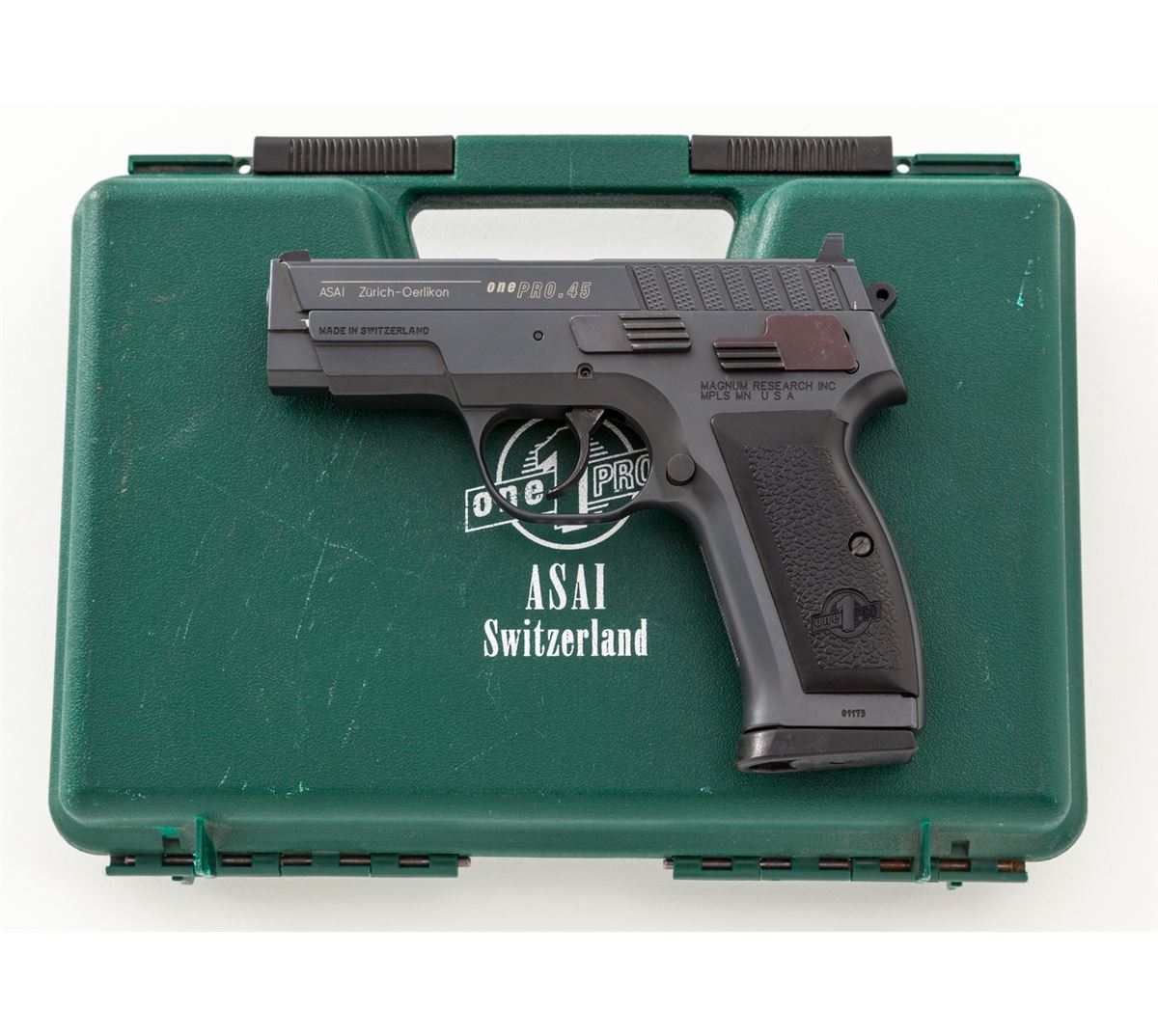 ASAI 1Pro Semi-Automatic Pistol (Swiss), #01173, .45 ACP cal., 3.5'' barrel, semi-matte non-reflective blue finish, pebblegrain black polymer grips, with four (4) 10-round magazines. Designed by Martin Tuma in Solothurn, Switzerland, and mfg'd by Oerlikon, with approx. 1000 imported by Magnum Research in the late 1990s and seldom seen today. Condition is excellent showing just light range use, appearing as new, in its original box. Est.: $1,200-$1,800. (Modern) (Not available to Calif. residents.)