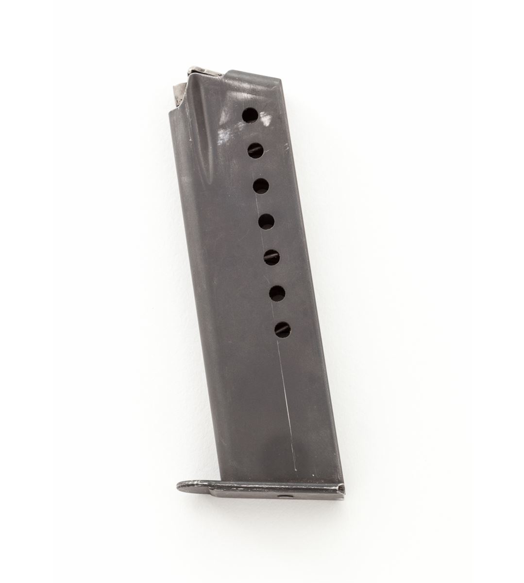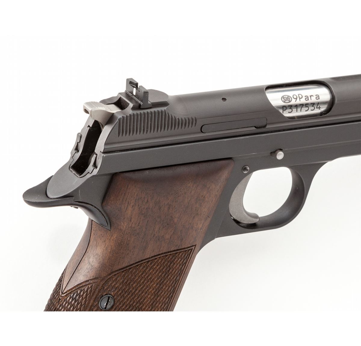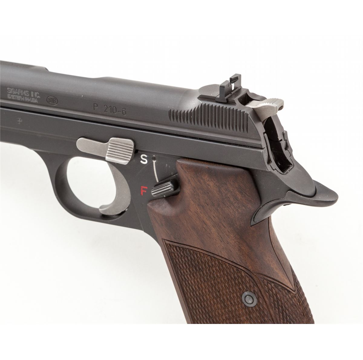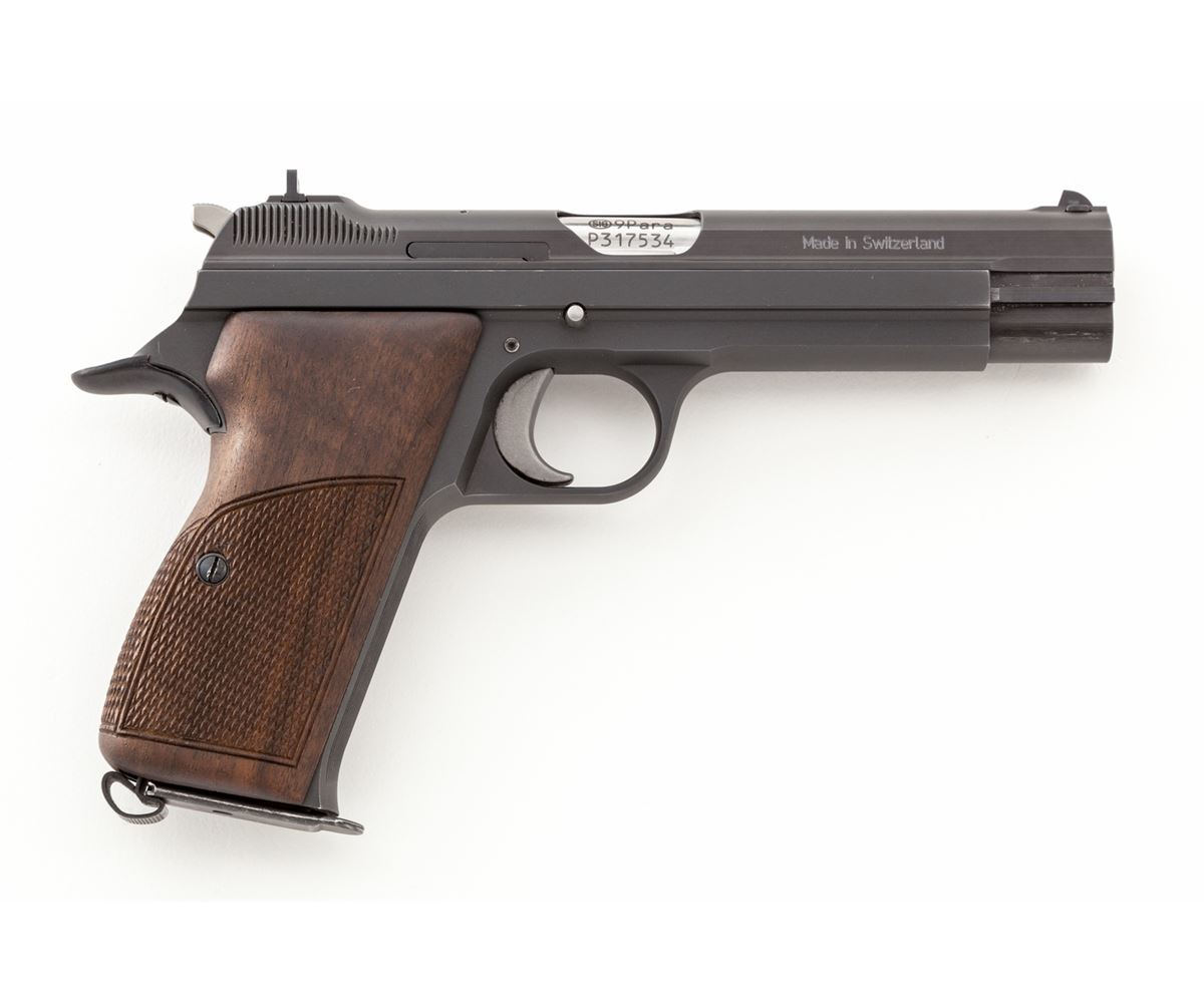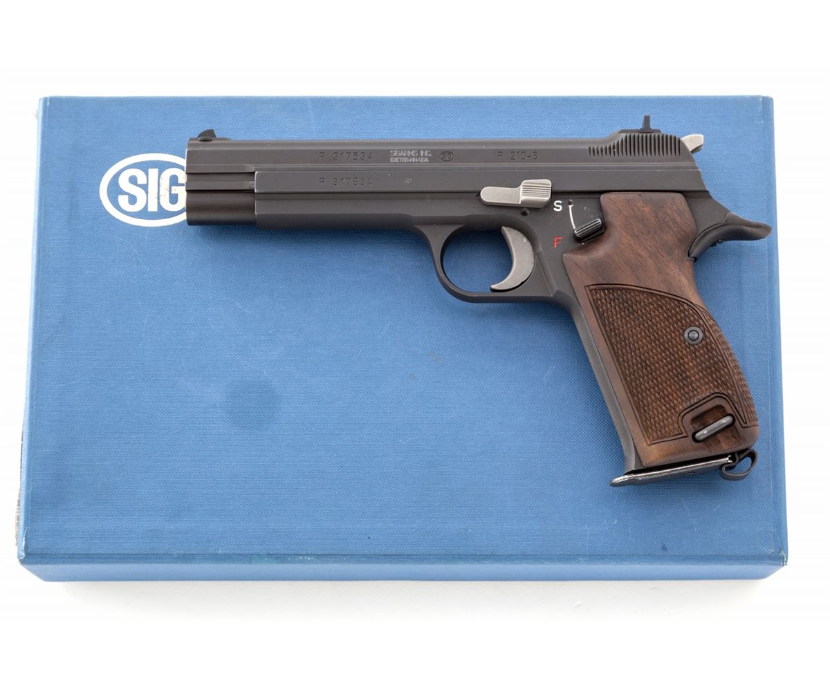 Sig P210-6 Semi-Automatic Pistol, #P317534, 9mm, 4-5/8'' barrel, matte blue finish, factory checkered walnut grips, in original box with one extra magazine, factory mag loader, instructions, text target, and Sig patch. Condition is excellent showing only light marks from handling, from standard index mark in safety area. Est.: $2,500-$3,500. (Modern) (Not available to Calif. residents.)