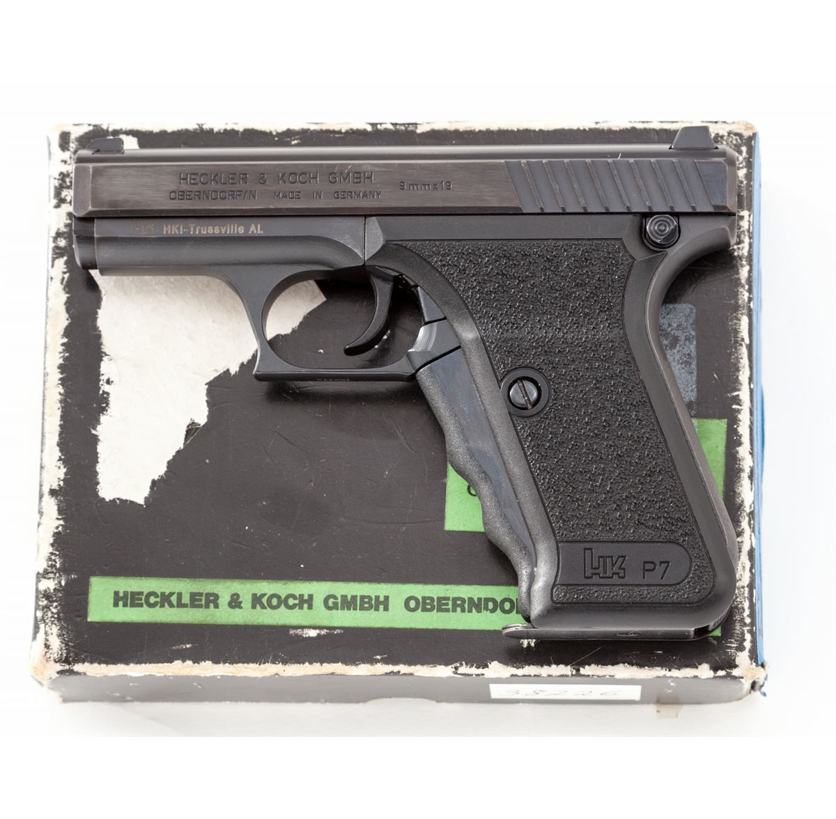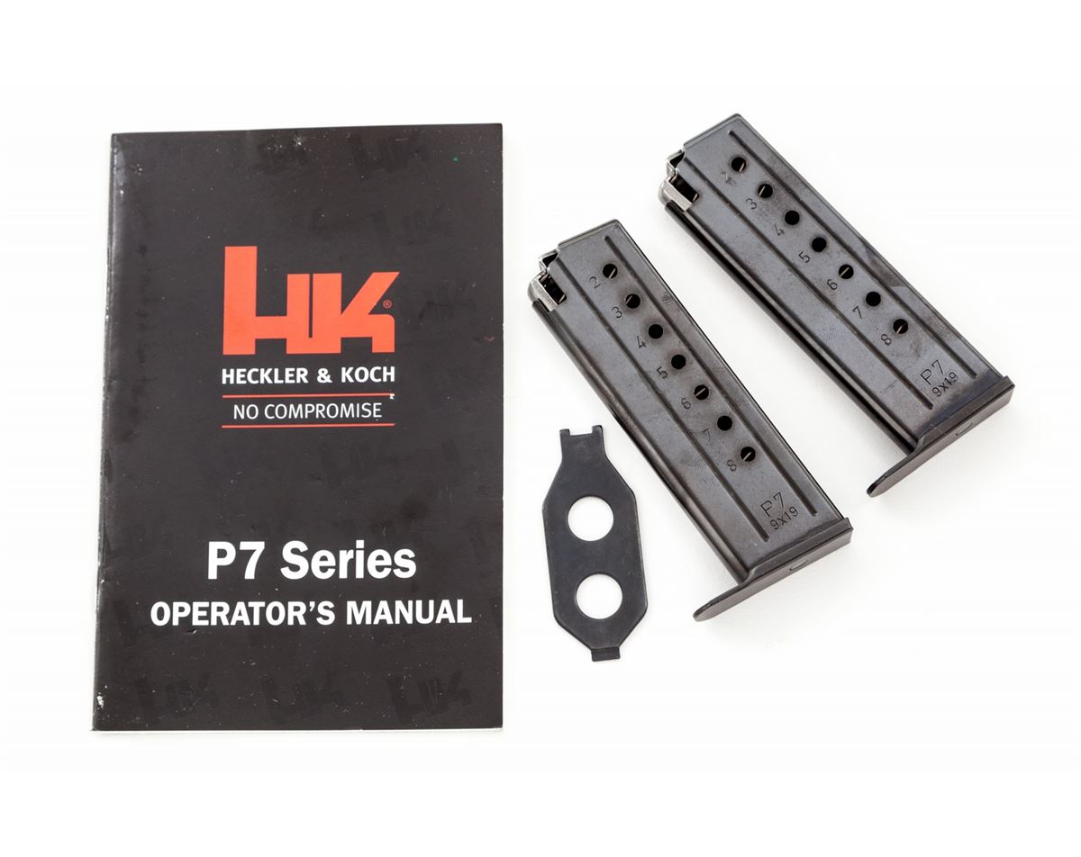 HK P7 Semi-Automatic Pistol, #38226, 9mm, 4'' barrel, blue finish, black pebblegrain factory plastic grips, with European bottom magazine release, in original box with three (3) 8-round magazines, combination tool and instructions. Condition is excellent showing little use, with just very slight thinning to finish. Box is missing its inner partition; exterior of box with tape pulls and moderate general wear. Est.: $1,000-$1,500. (Modern/PPT)