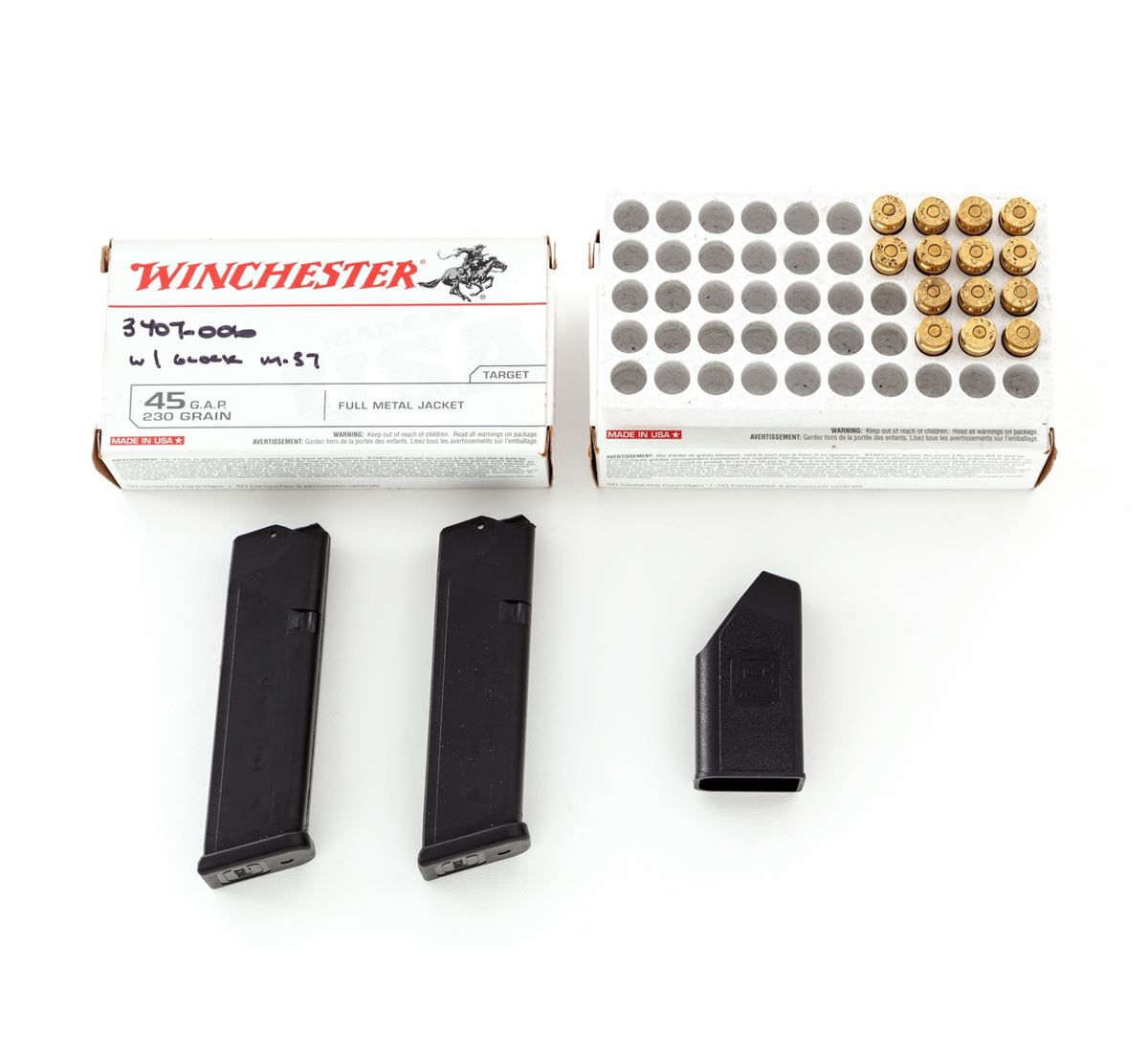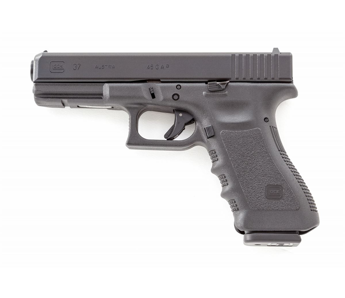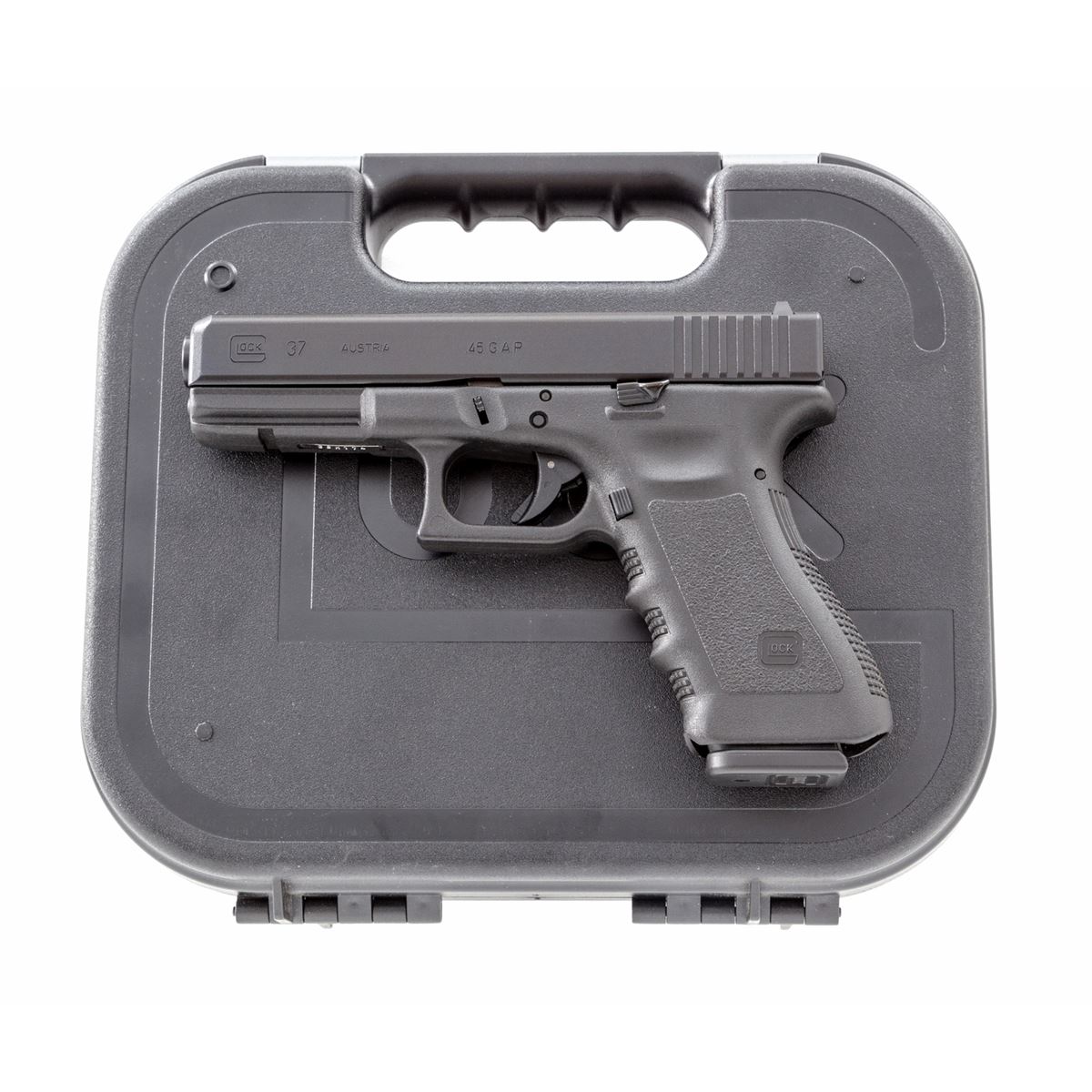 Glock Model 37 Semi-Automatic Pistol, #GBH174, .45 GAP cal., 4-1/4'' barrel, matte finish, with two (2) extra 10-round magazines, mag loader, and 64 rounds of .45 GAP ammo. Condition is excellent with less than one box of ammo fired thru it. Est.: $450-$600. (Modern)