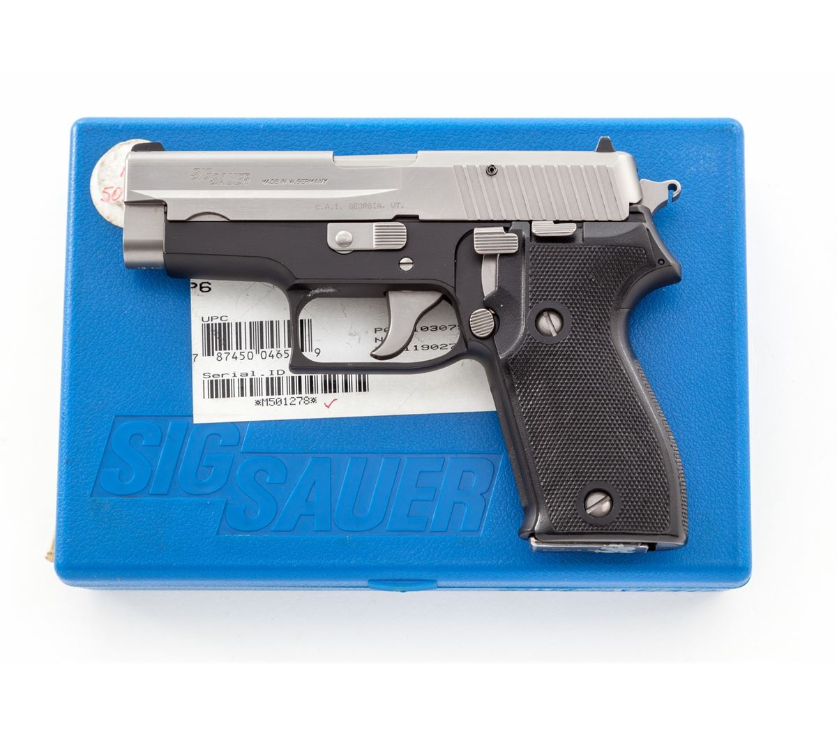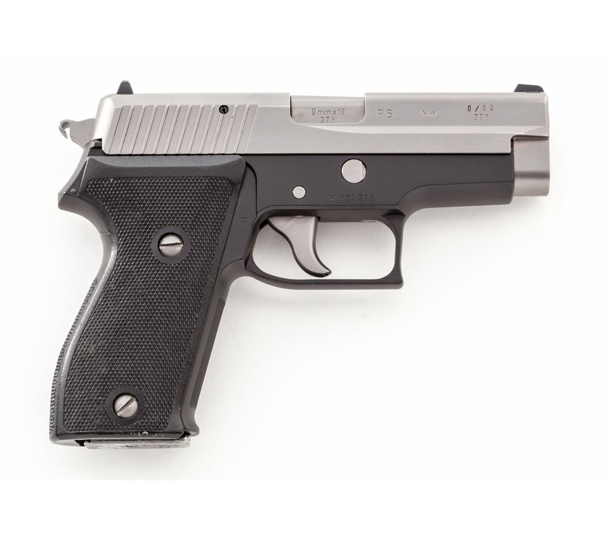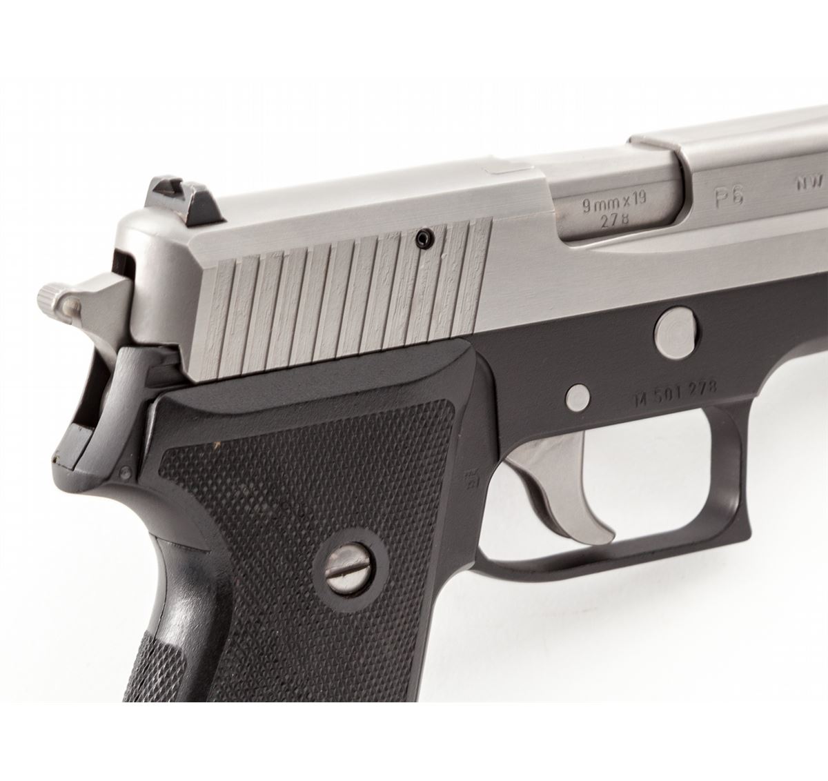 Sig Sauer Model P6 Semi-Automatic Pistol, #M501278, 9mm, 3-1/2'' barrel, stainless steel slide, aluminum frame, factory checkered black plastic grips, in original box with instructions and two (2) magazines. Condition is excellent showing little use, with just minor handling marks to grips. Est.: $450-$650. (Modern)