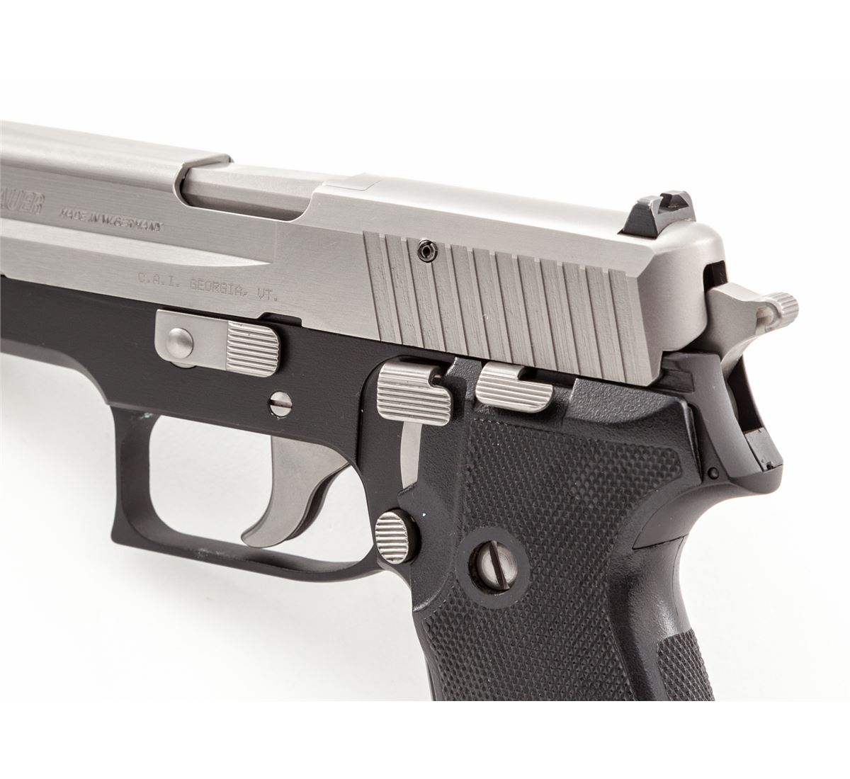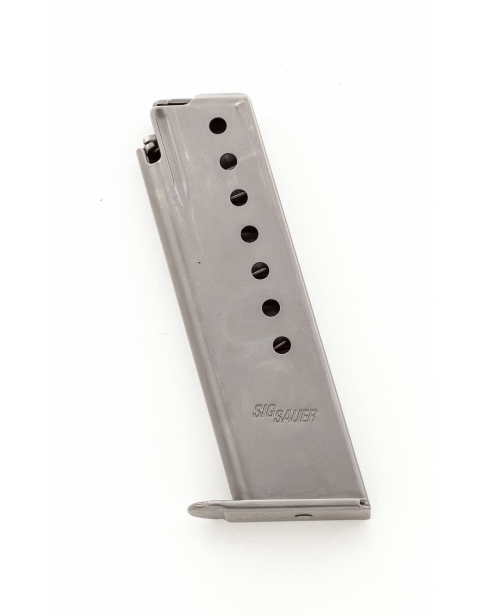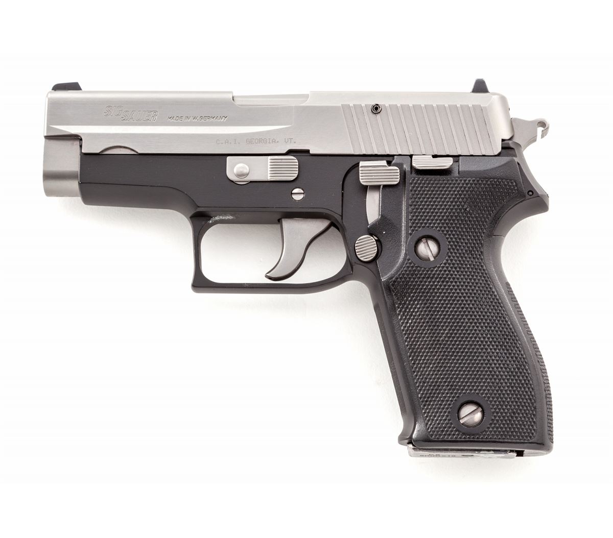 Sig Sauer Model P6 Semi-Automatic Pistol, #M501278, 9mm, 3-1/2'' barrel, stainless steel slide, aluminum frame, factory checkered black plastic grips, in original box with instructions and two (2) magazines. Condition is excellent showing little use, with just minor handling marks to grips. Est.: $450-$650. (Modern)