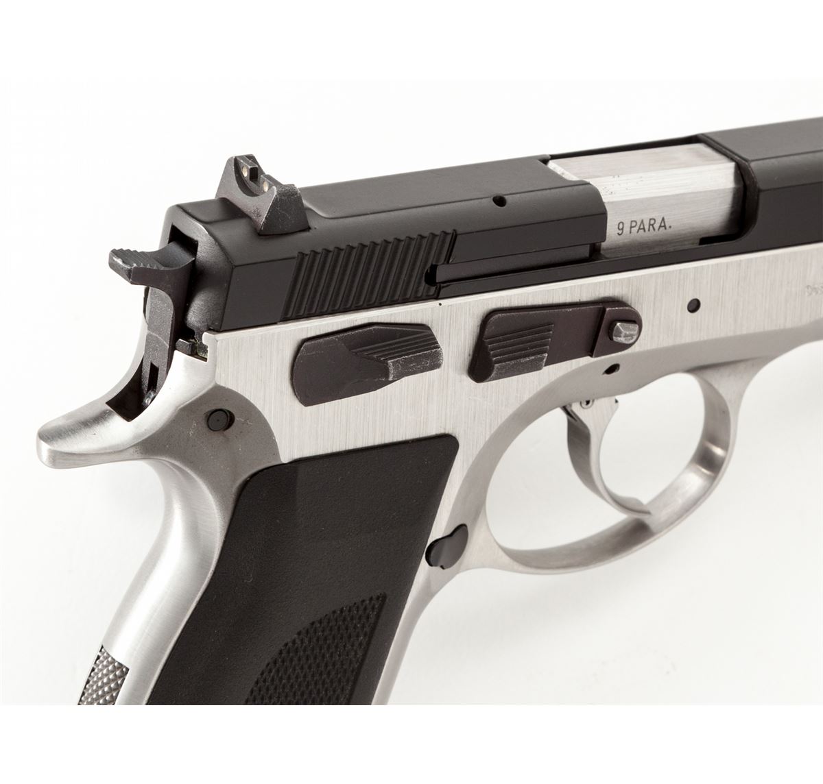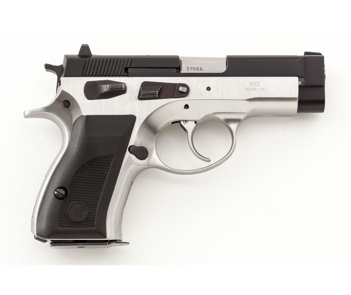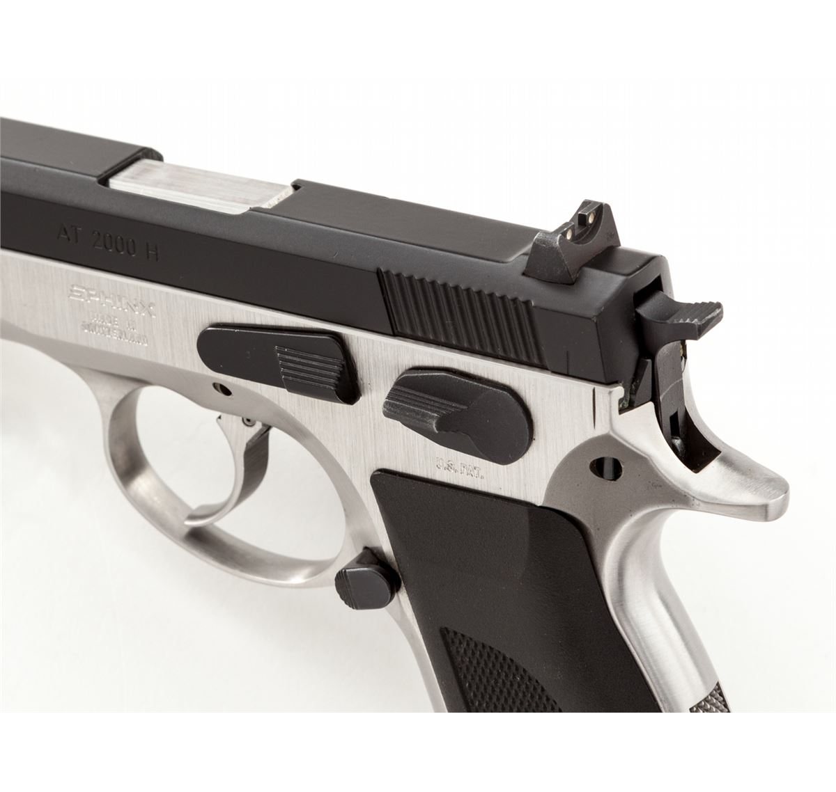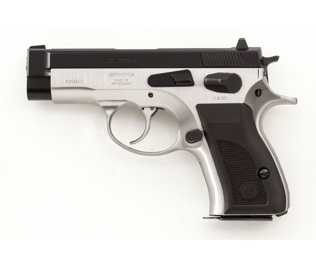 Swiss Sphinx Model AT2000H Semi-Automatic Pistol, #A01441H, 9mm, 3-1/2'' barrel, two-tone stainless steel, factory black checkered rubber grips, with one 12-round magazine. Condition is excellent showing little use. Est.: $750-$1,000. (Modern) (Not available to Calif. residents.)