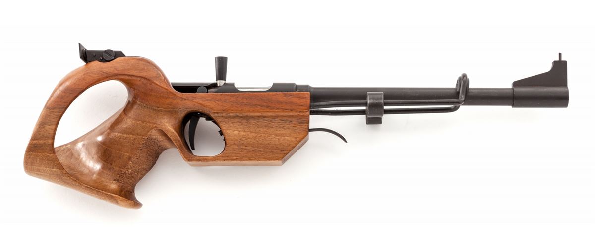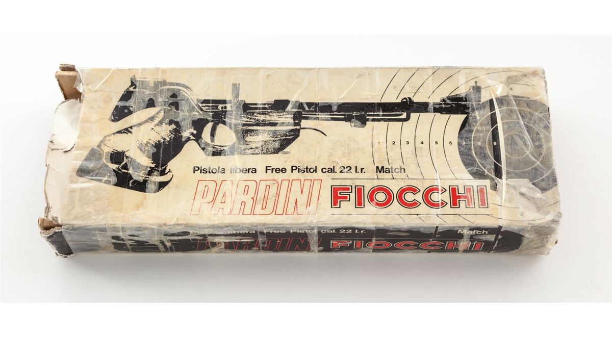 Pardini Model P.GP75 Single Shot Free Pistol, #441218, .22 LR cal., 9-1/2'' barrel, matte finish, small right-hand target grip. Condition is excellent showing minor range use. Original box with tape repairs and wear. Est.: $600-$800. (C&R)