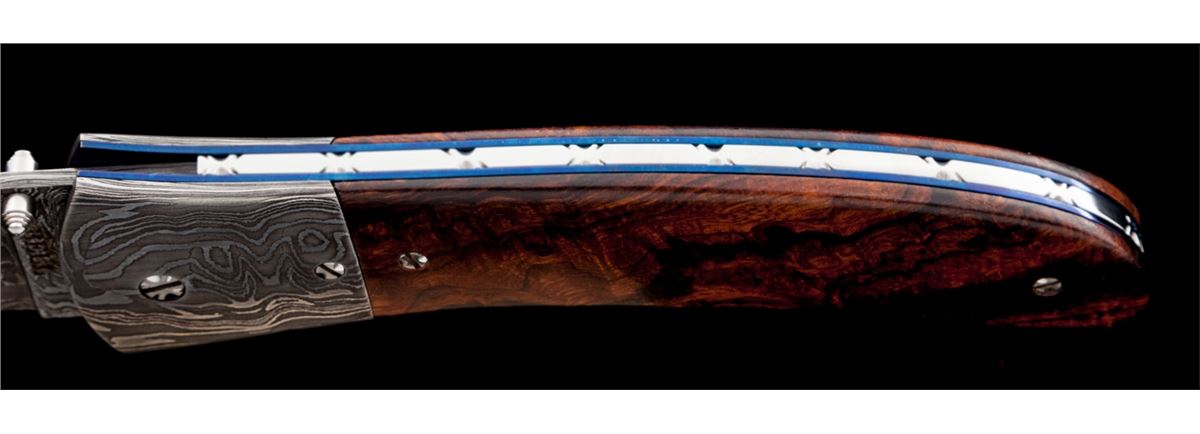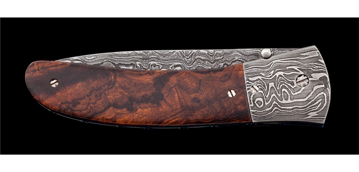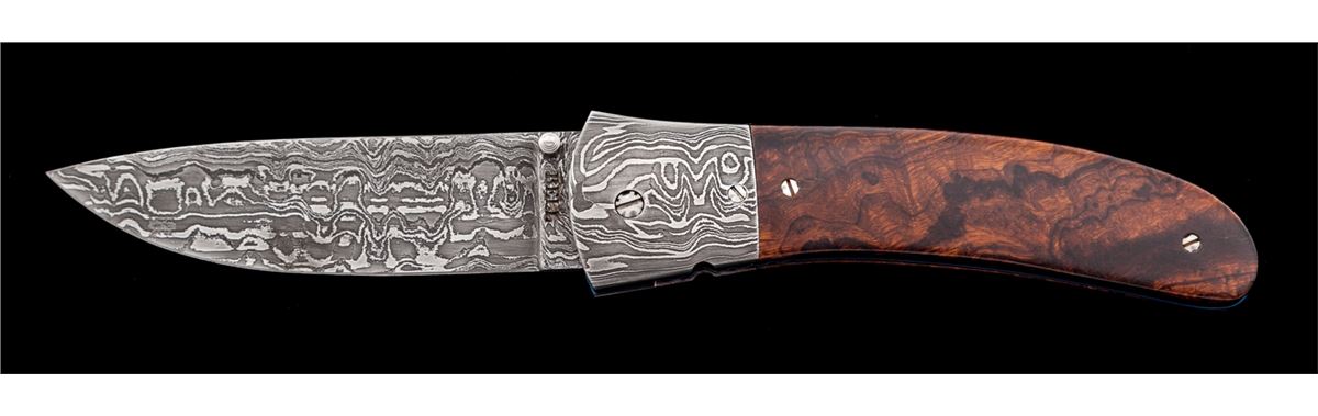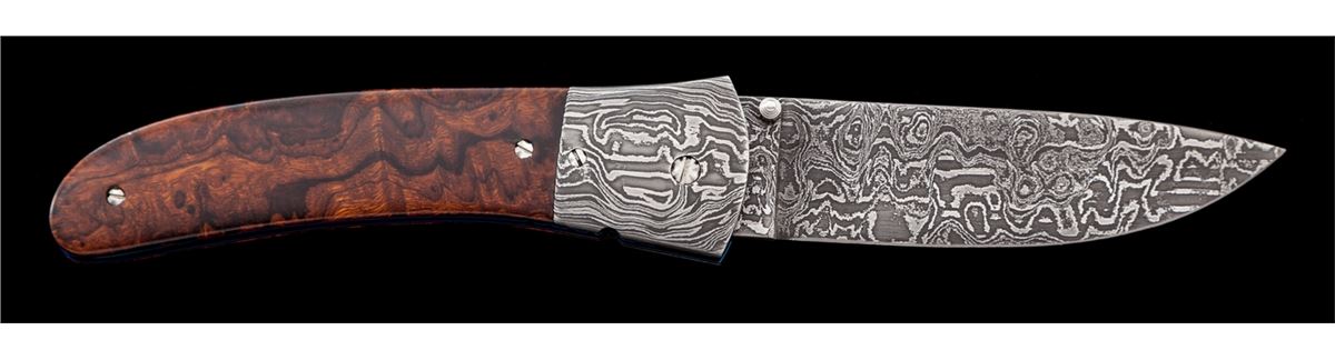 Custom Liner Lock Folding Knife, by Don Bell, 3-3/4'' damascus blade, 5'' overall closed length, dual thumb studs, damascus bolsters, anodized blue liners, file worked back bar, and wood scales held in place by decorative flat head screws. Condition is excellent showing no use. Liner locking system needs adjustment as the blade will unexpectedly close if pressure is applied to the backside of blade. Est.: $400-$600.