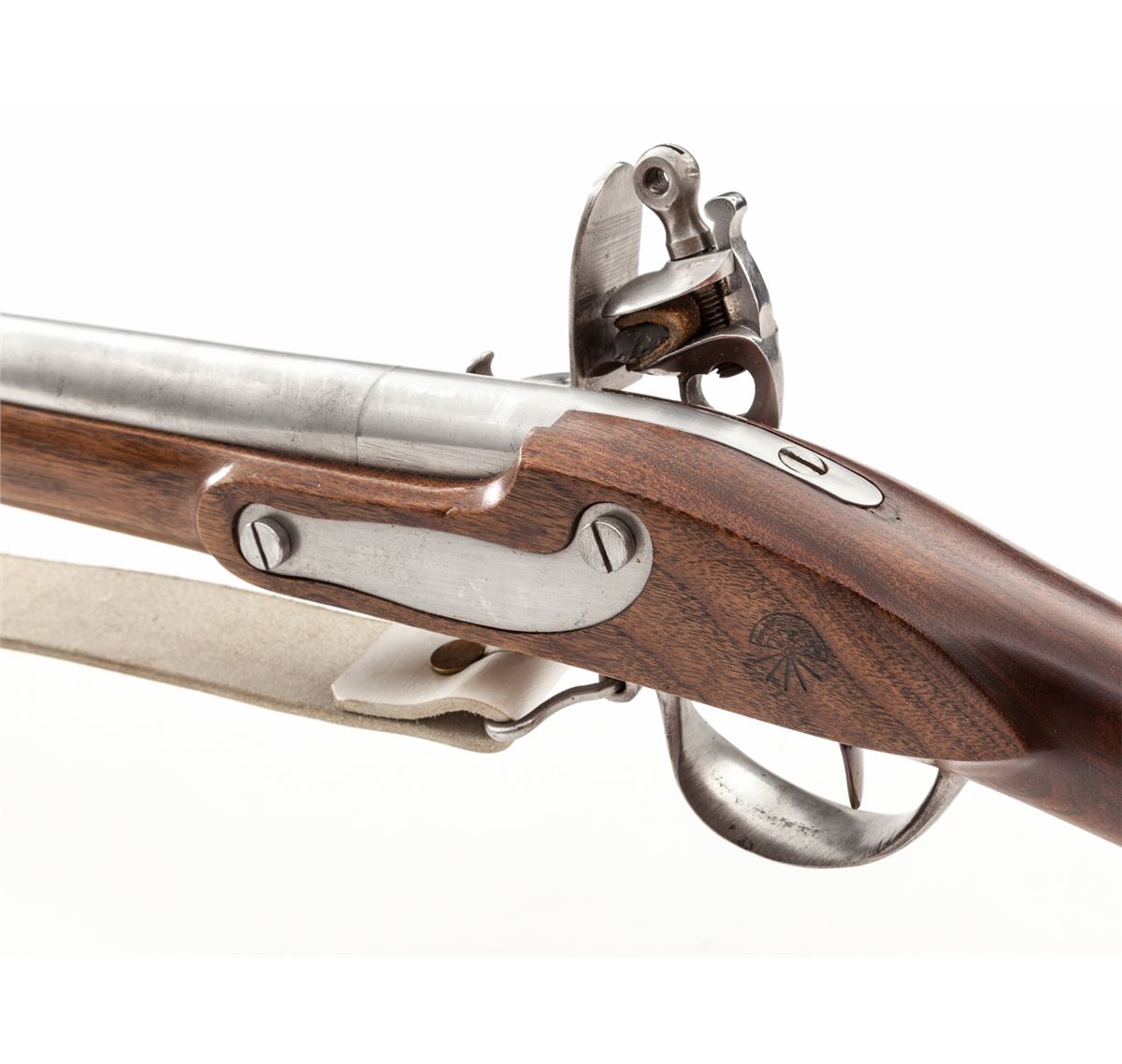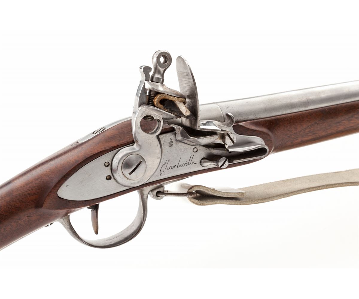 High Quality Copy of a French Charleville Flintlock Musket, NVSN, .72 smoothbore cal., 42'' barrel, metal finished bright, with dimensionally correct walnut stock, lockplate marked ''Charleville'' with fleur d'lis just behind pan, and correct style buff leather sling. Condition is excellent showing just light marks from handling. Est.: $600-$800. (Antique)