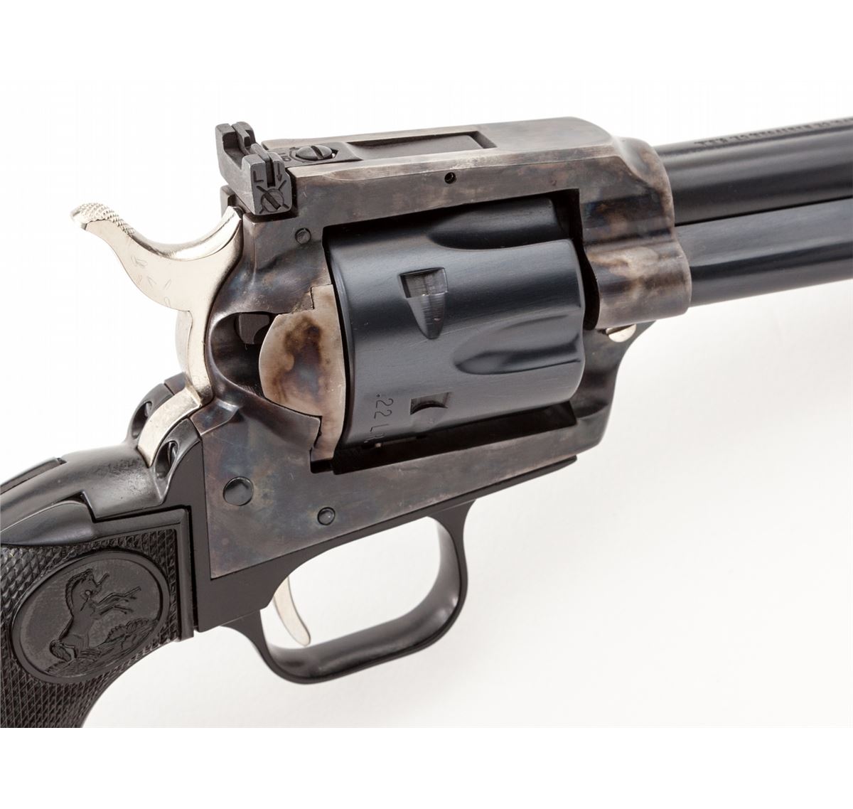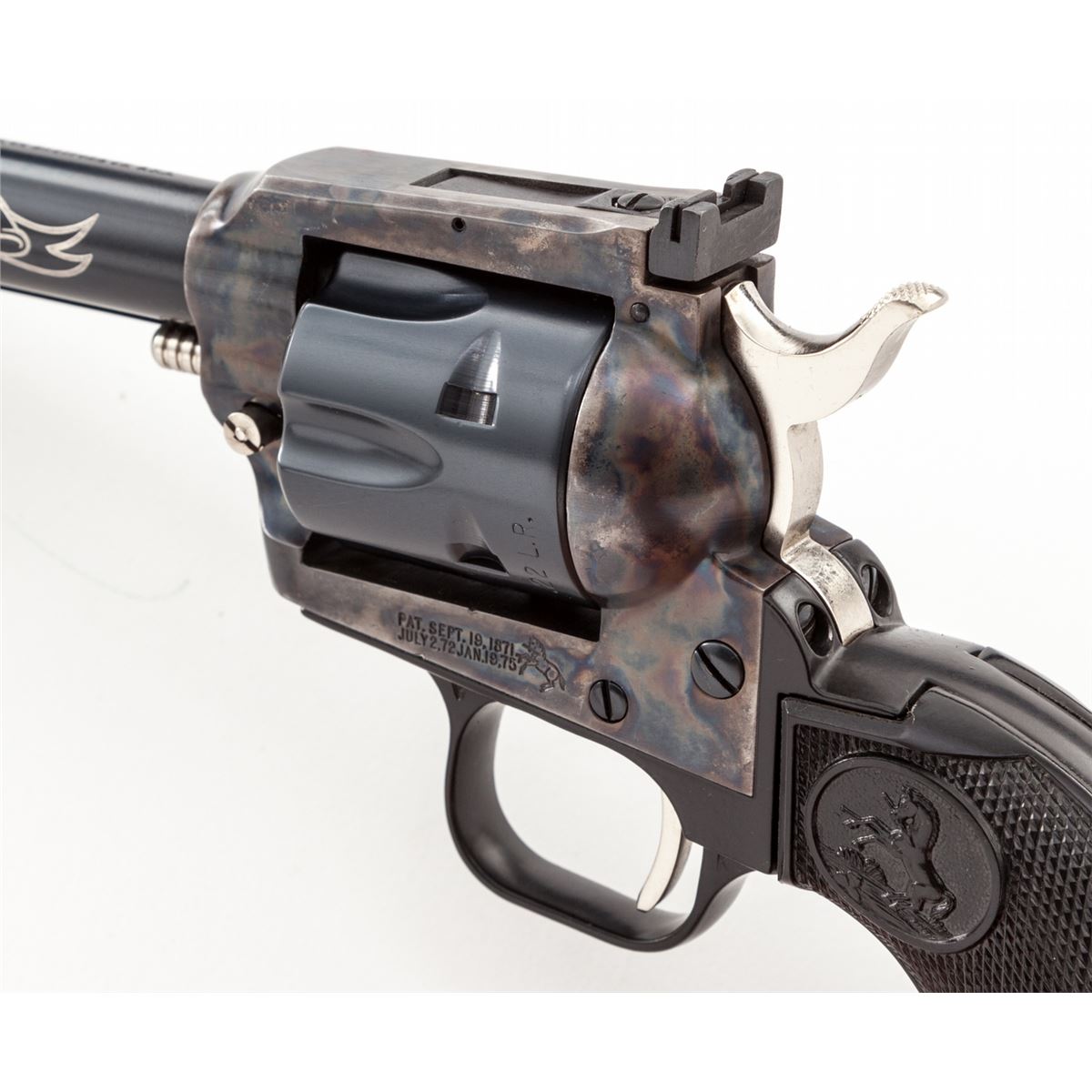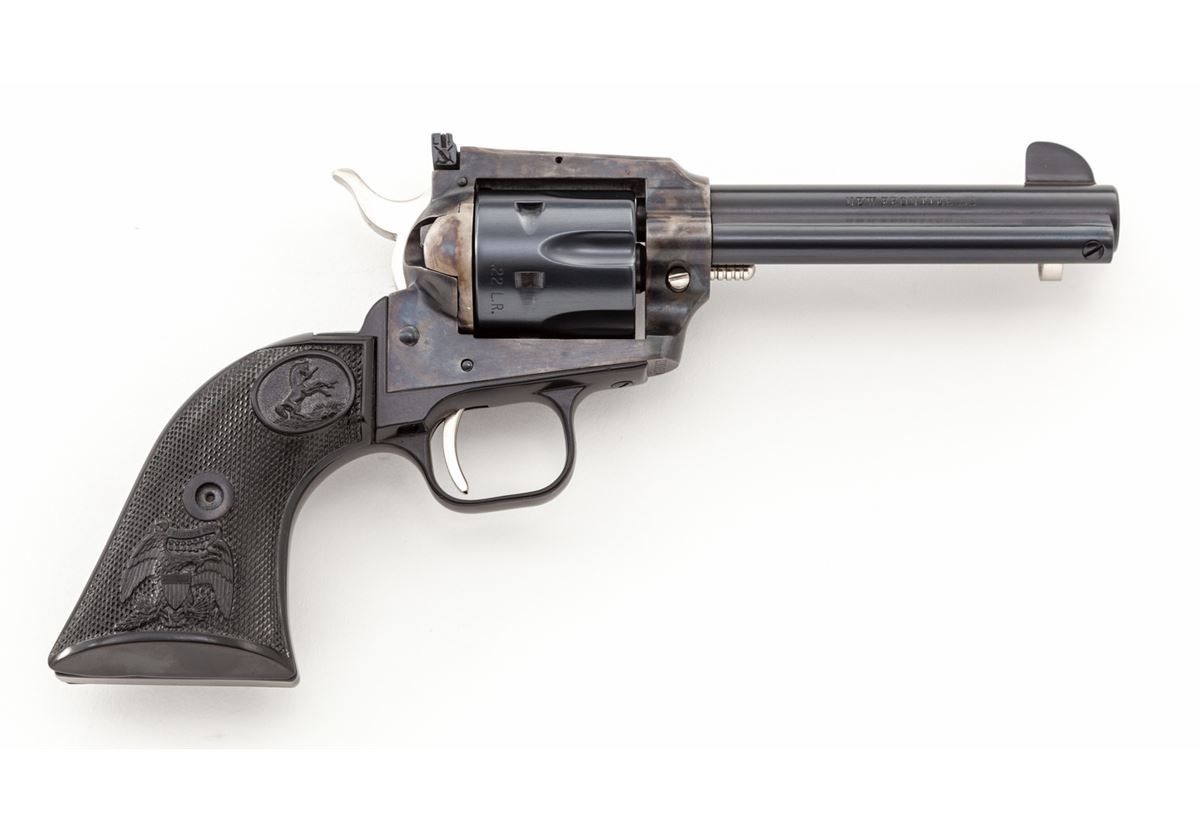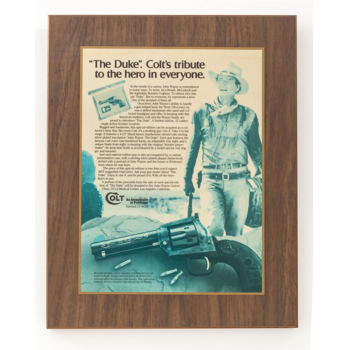 Colt John Wayne ''The Duke'' Commemorative New Frontier Single Action Revolver, #G201354, .22 LR cal., 4-3/8'' barrel, blue and case hardened finish, adjustable sights, checkered black plastic eagle grips, with John Wayne plaque, in red velvet lined walnut ''The Duke'' presentation case. With period advertisement. Condition is excellent, appearing new and unfired. Est.: $500-$750. (C&R/PPT)