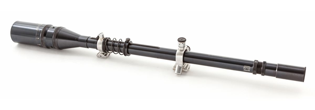 J. Unertl 2'' Rifle Target Scope, 24 power, 26-1/4'' in length, 1'' diameter, with 2'' objective portion. Bright Unertl adjustable rings and recoil spring. Condition is near excellent retaining approx. 96% blue with light runner marks in actioning area to lower portion of scope, and light corrosion near eyepiece. Fine crosshair reticule is crisp, with both eyepiece scope caps. Est.: $500-$750.