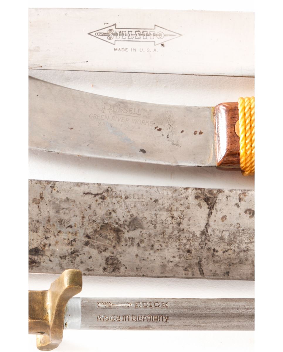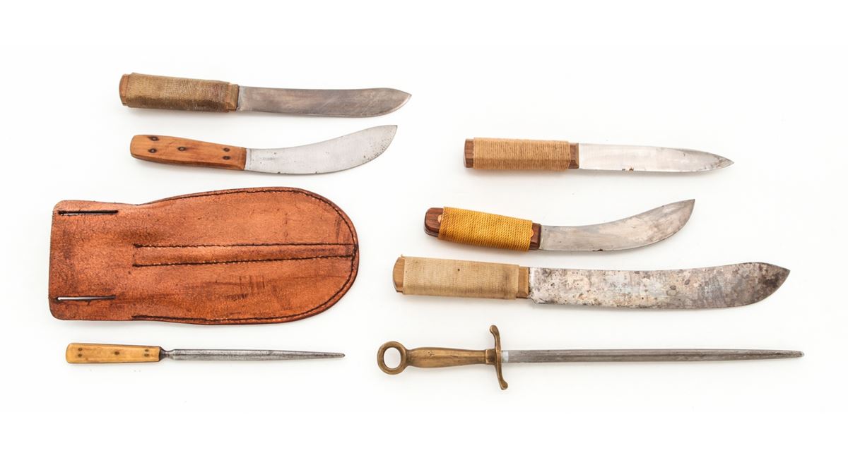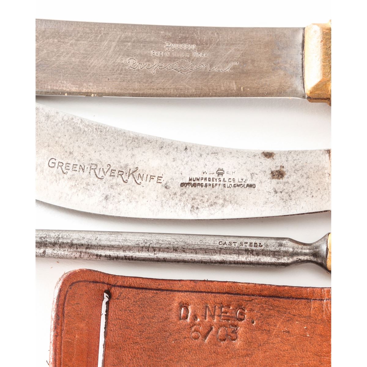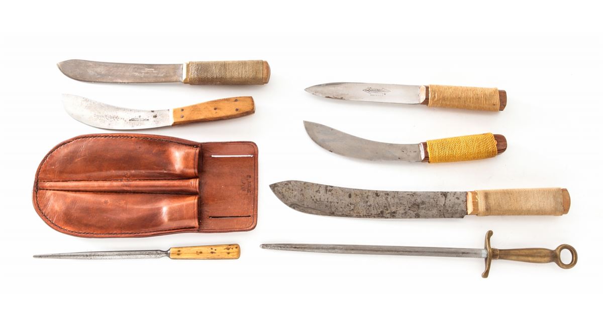 Lot of Five (5) Antique Skinning/Butcher Knives & Two (2) Sharpening Rods, including leather sheath which holds a Russell Green River Works ''Professional'', Green River Knife/Humphreys & Co. Ltd., and small wood-handled sharpening rod. Also included is an F. Dick sharpening rod; Russell GRW skinning knife; ''Stiletto'' butcher's knife; and large unmarked butcher's knife with 10'' blade, 15'' overall. Four of the five knives with handles wrapped in twine or small rope. Conditions range from good to very good overall showing normal signs of age and wear. Blades with additional sharpening, some with light to moderate carbon spotting. Est.: $100-$200/lot.