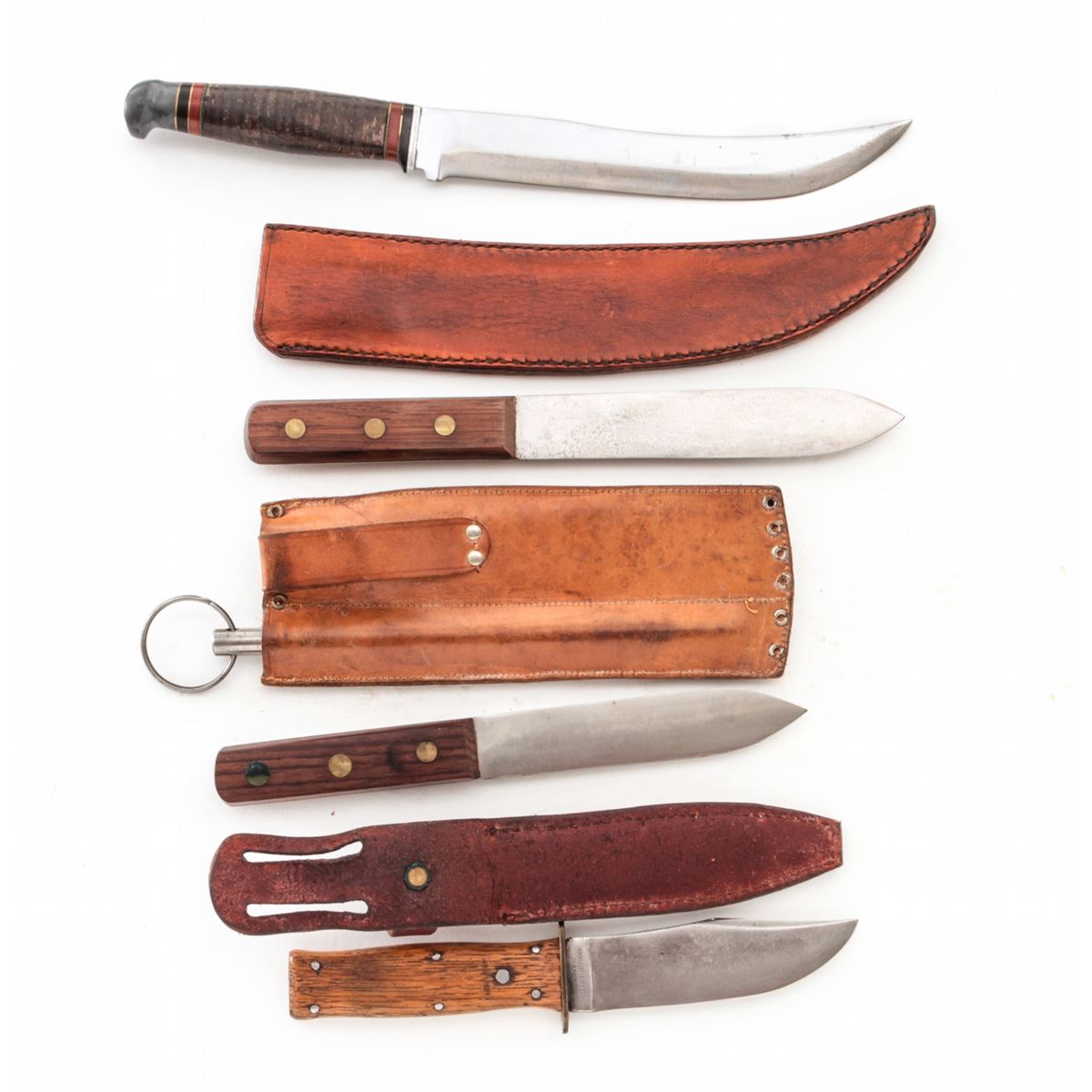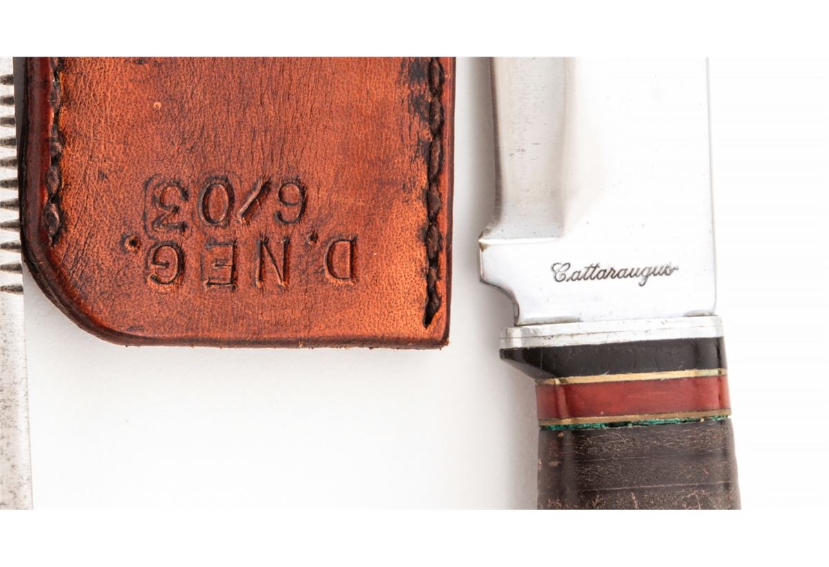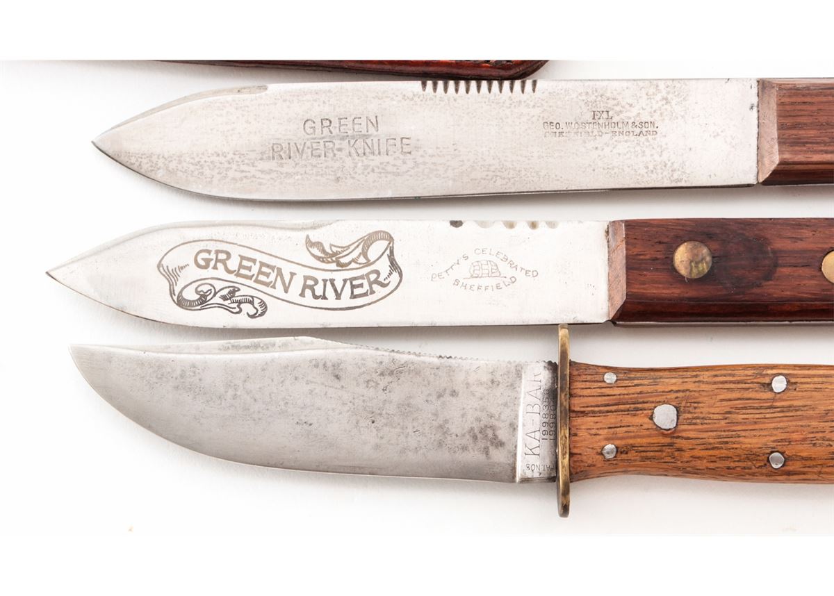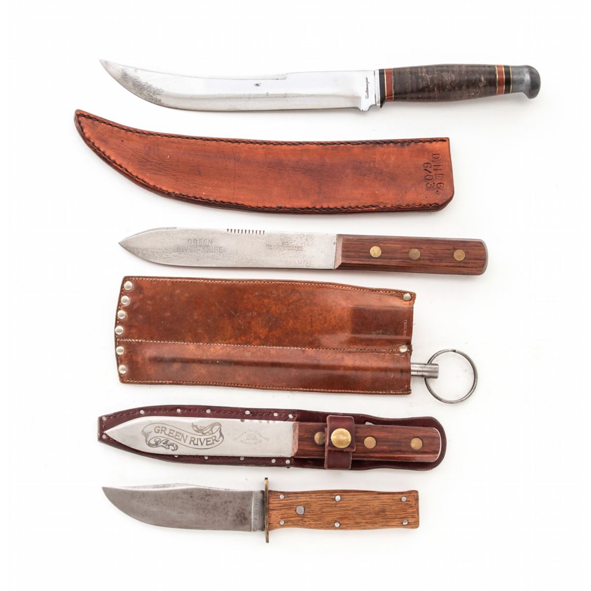 Lot of Four (4) Knives by KA-BAR, Green River, Wostenholm, & Cattaraugus: 1.) Green River skinning/hunting knife, blade marked ''Petty's Celebrated, Sheffield'', 5'' blade, 9'' overall, with unmarked leather sheath. 2.) KA-BAR/Union Cut Co. hunting knife, 4-3/8'' blade, 8-3/8'' overall, with wood handle. 3.) Green River skinning/hunting knife set, by Geo. Wostenholm & Son, 6'' blade, 10-1/4'' overall, with sheath and sharpening rod. 4.) Interesting Cattaraugus butcher's knife, 8'' upswept blade, 12-1/2'' overall, stacked leather washer handle, black/red/brass spacers, with leather sheath stamped ''D.NEG. 6/03. Conditions range from very good to fine overall, showing light to moderate use. The Cattaraugus has been cleaned, with pinprick pitting remaining near the tip. Leather sheaths with tight stitching and seams. Est.: $175-$275/lot.