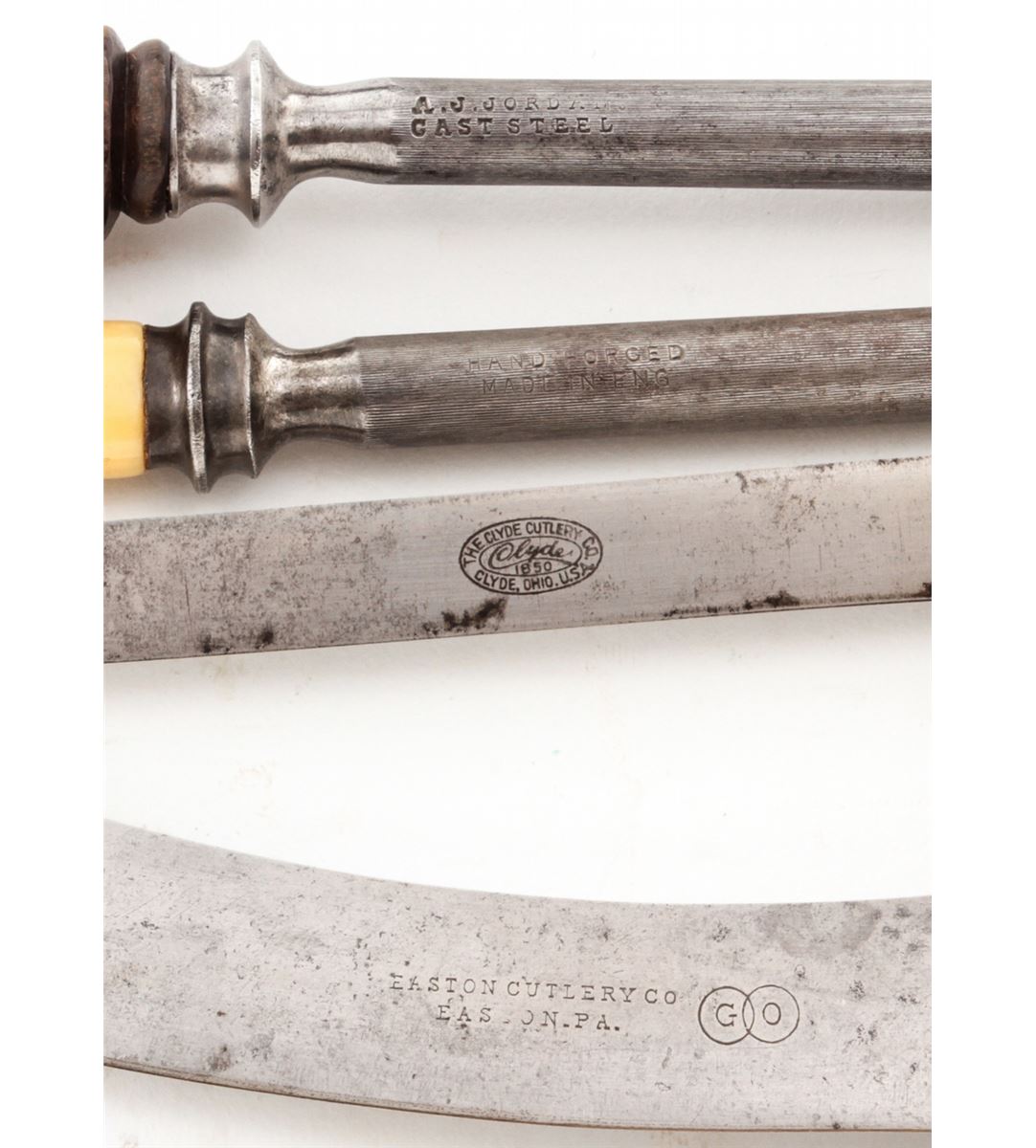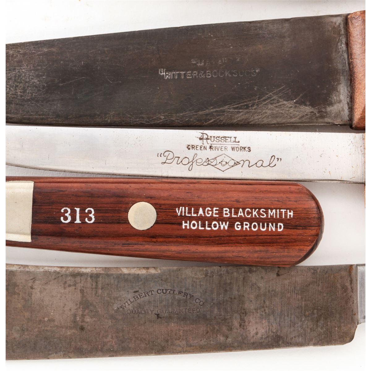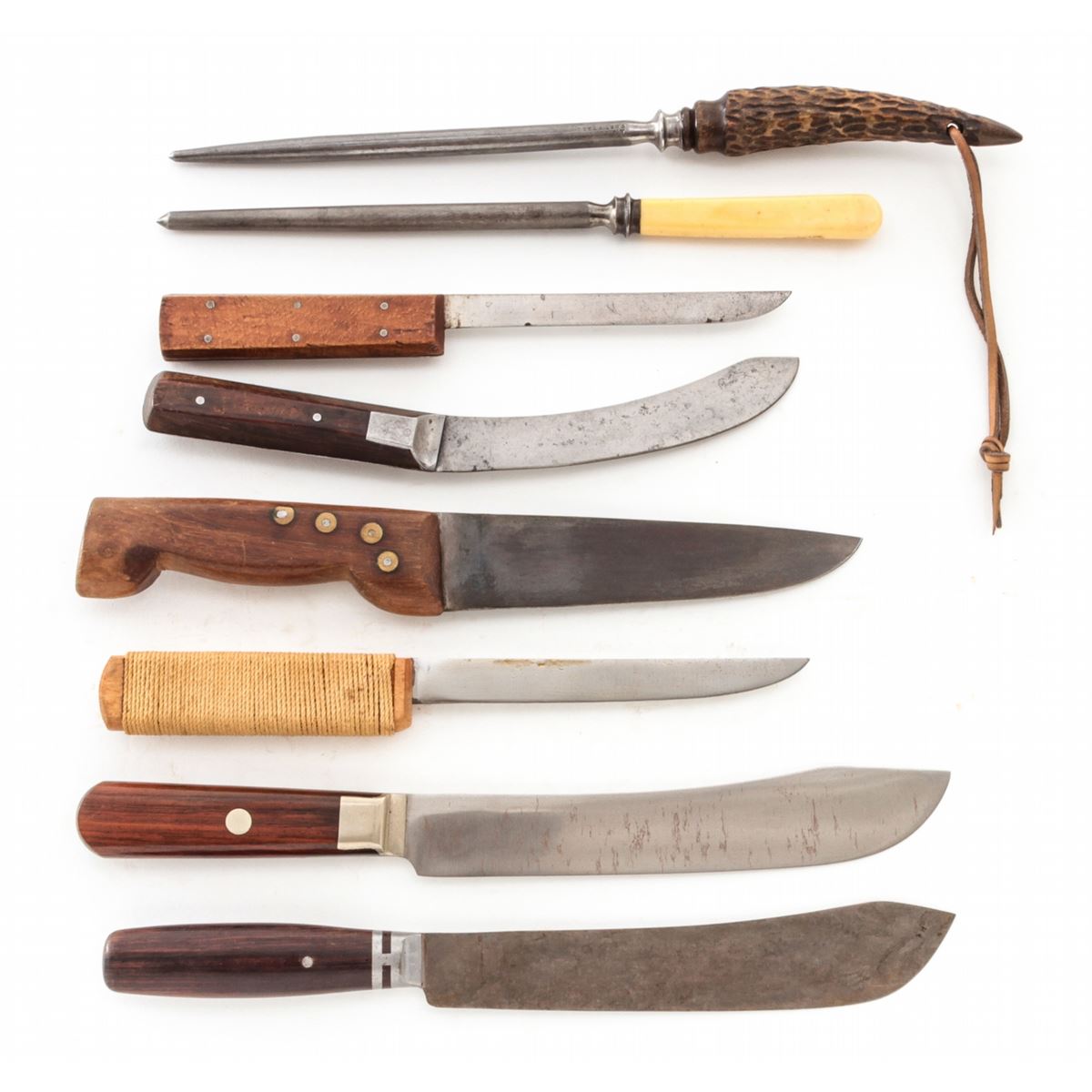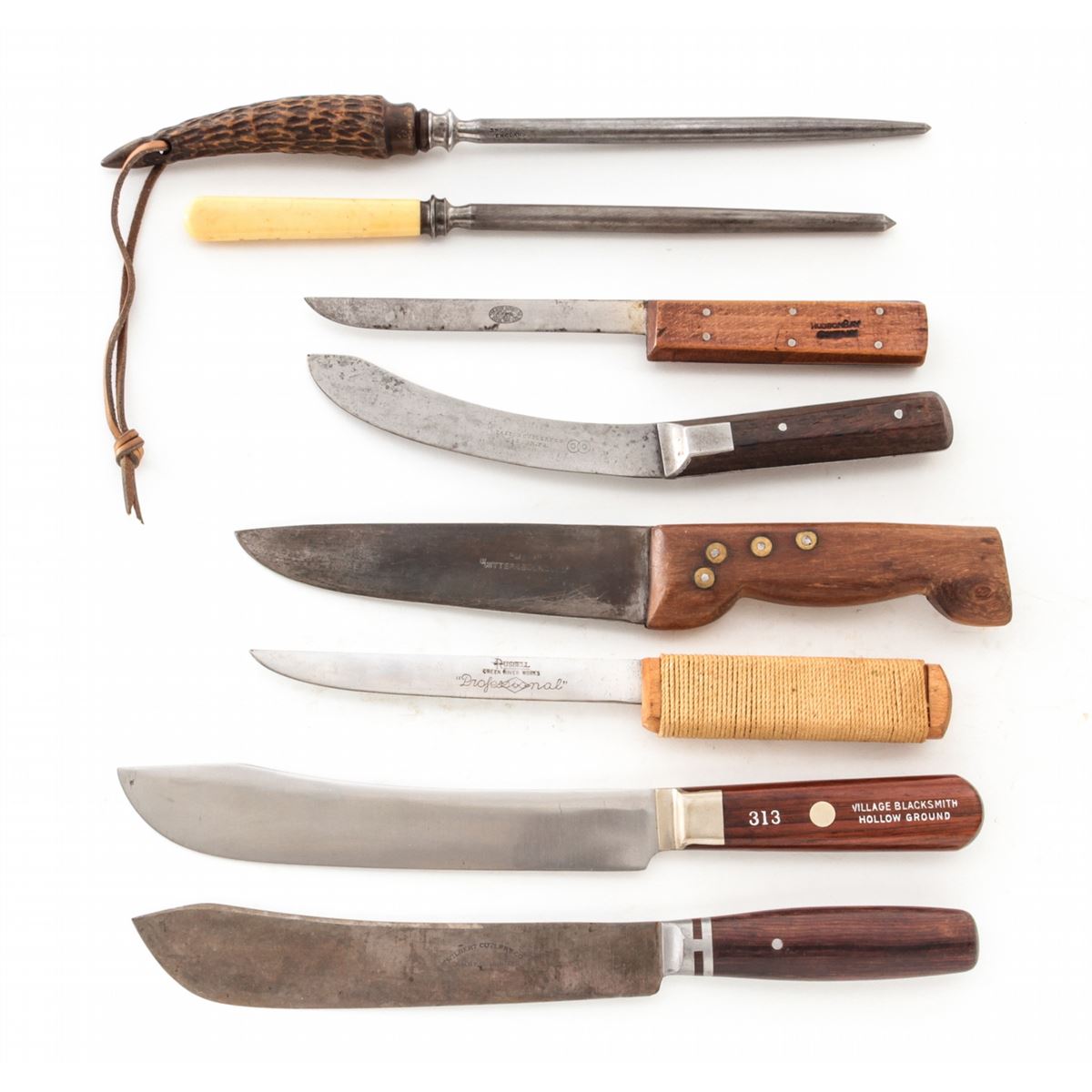 Lot of Six (6) Skinning/Butcher Knives & Two (2) Sharpening Rods. Knife manufacturers include Wilbert Cutlery Co., Village Blacksmith, Clyde Cutlery, Easton Cutlery, Russell Green River Works, and Ritter & Bock. Blade lengths range from 5-1/2'' to 8-1/4'' with overall lengths ranging from 10'' to 13-1/4''. Included in this lot is a horn-handled sharpening rod by A.J. Jordan and another sharpening rod marked ''Made in England''. Conditions range from good to very good showing normal signs of age and wear. Blades with additional sharpening, some with light to moderate carbon spotting. Est.: $125-$225/lot.
