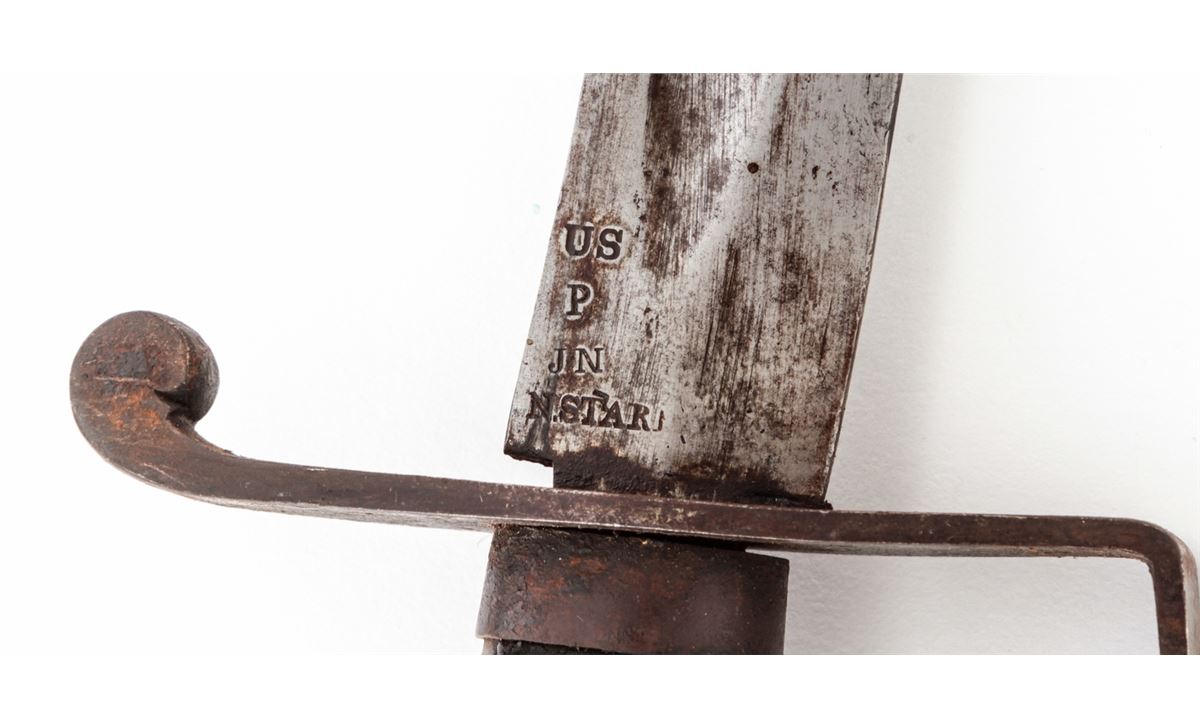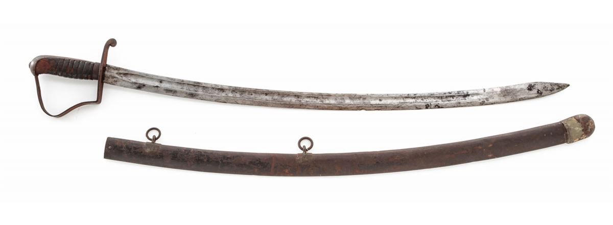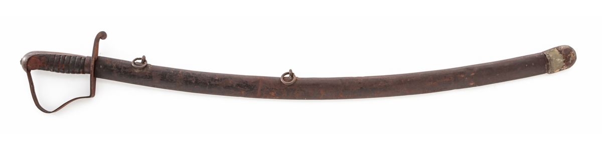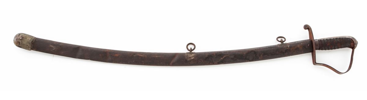 Starr 1818 Contract Cavalry Saber, with scabbard, 32'' blade, 37'' overall, with blackened iron scabbard showing pewter drag. Hilt dated 1821; blade marked ''US-P/JN-N. Starr''. Condition is good. Blade with several nicks and carbon spotting. Approx. 40% leather remains over wood grip. Scabbard with moderate dings, scuffs and paint loss. Est.: $200-$400.