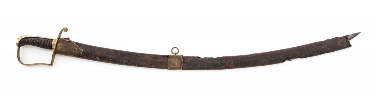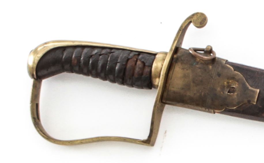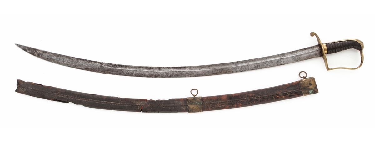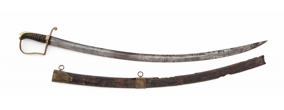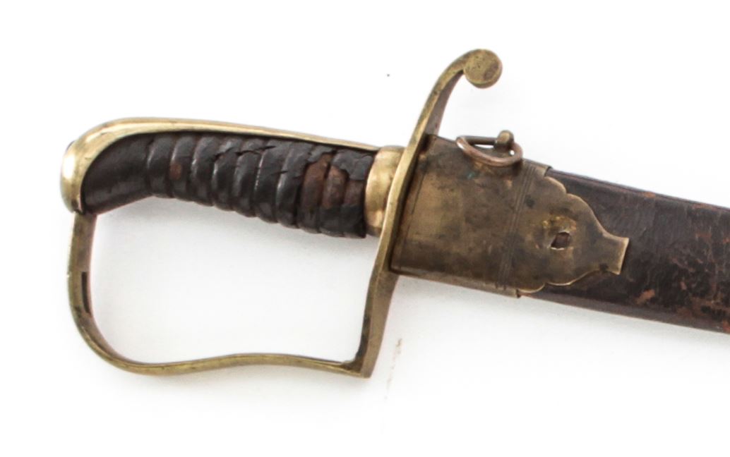 Early Militia NCO Sword, 33'' single-edged blade, 37-1/2'' overall, artillery style brass mounts, with leather-covered carved wood grip. In very scarce brass and leather scabbard. Condition is good. Blade shows light carbon spotting, more pronounced to forward third of blade. Approx. 70% leather covering is retained on grip surface. Twin-looped scabbard with losses to top edge and missing its tip. Est.: $300-$500.