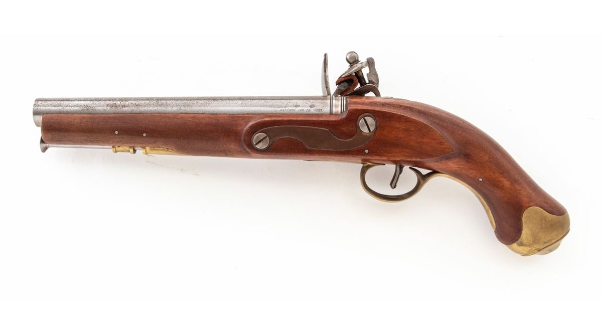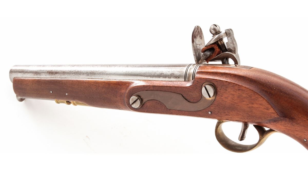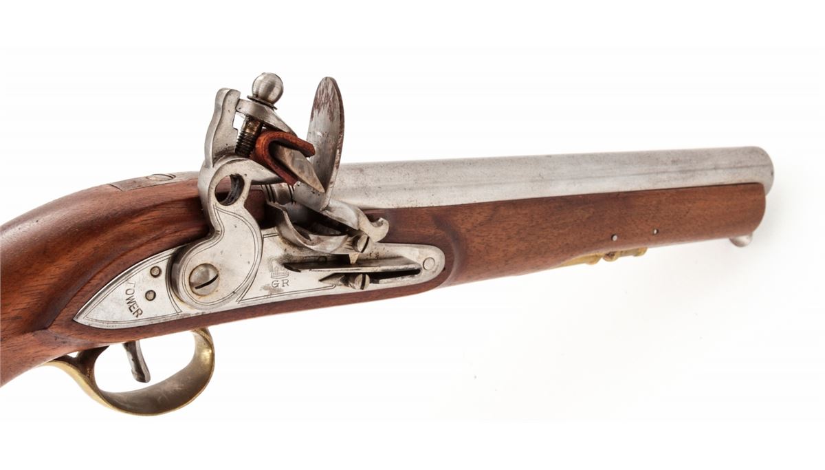 European Copy of a Tower Flintlock Pistol, #1767, .67 cal., 9'' barrel, bright finish, walnut stock, brass furniture, with steel ramrod. Condition is very good with light patination to barrel. Good action and bore. Est.: $200-$400. (Antique)