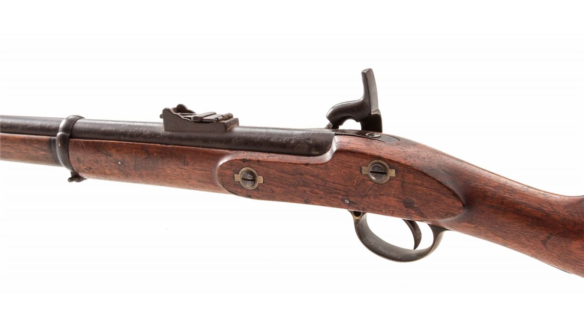 Enfield P1853 Three-Banded Musket, by Tower (1862), .58 cal., 39'' barrel, brown finish, walnut stock, brass triggerguard, buttplate and forend cap. Ramrod is present. Condition is good. Metal surfaces with moderate patination. Stock with light scuffs and dings. Good action, fair bore. Est.: $250-$450. (Antique)