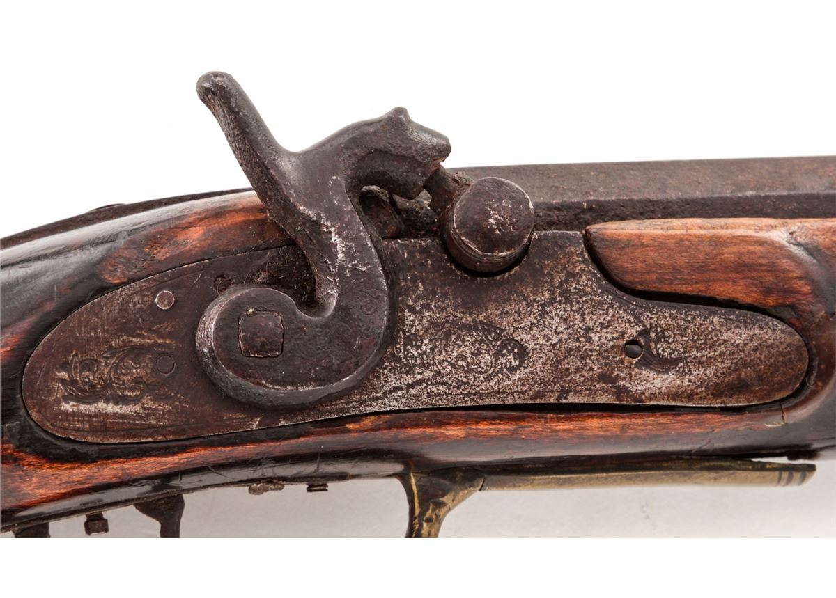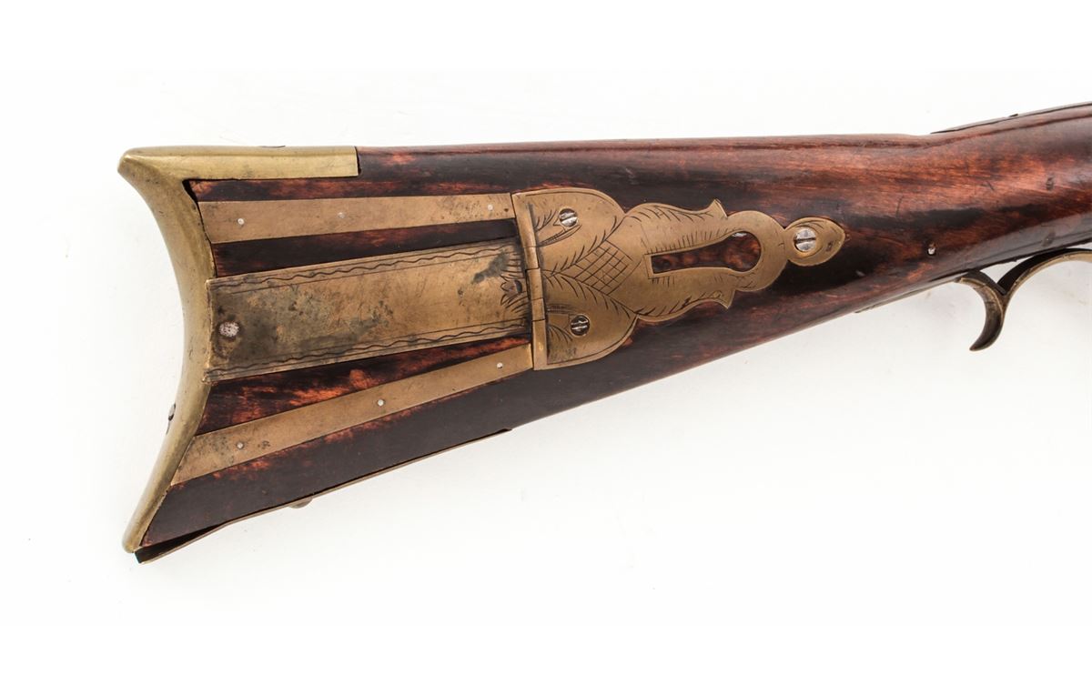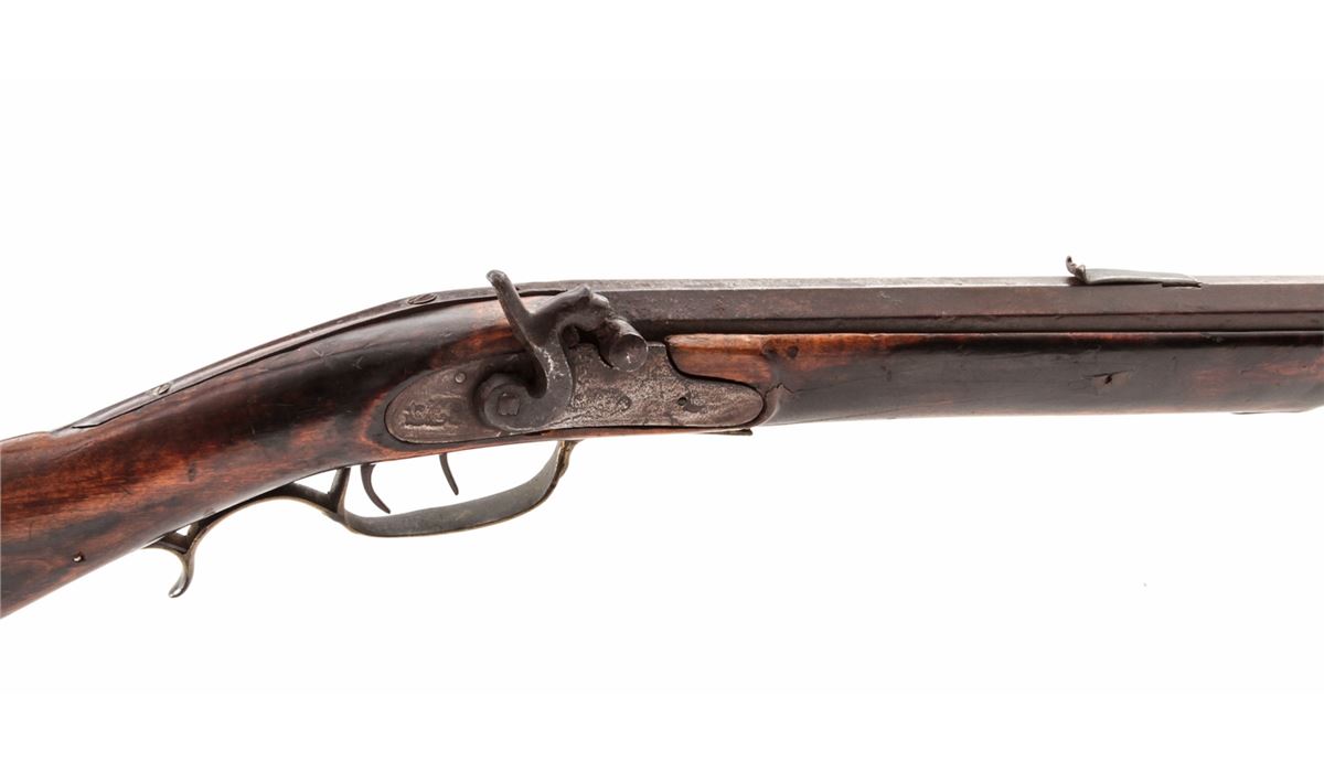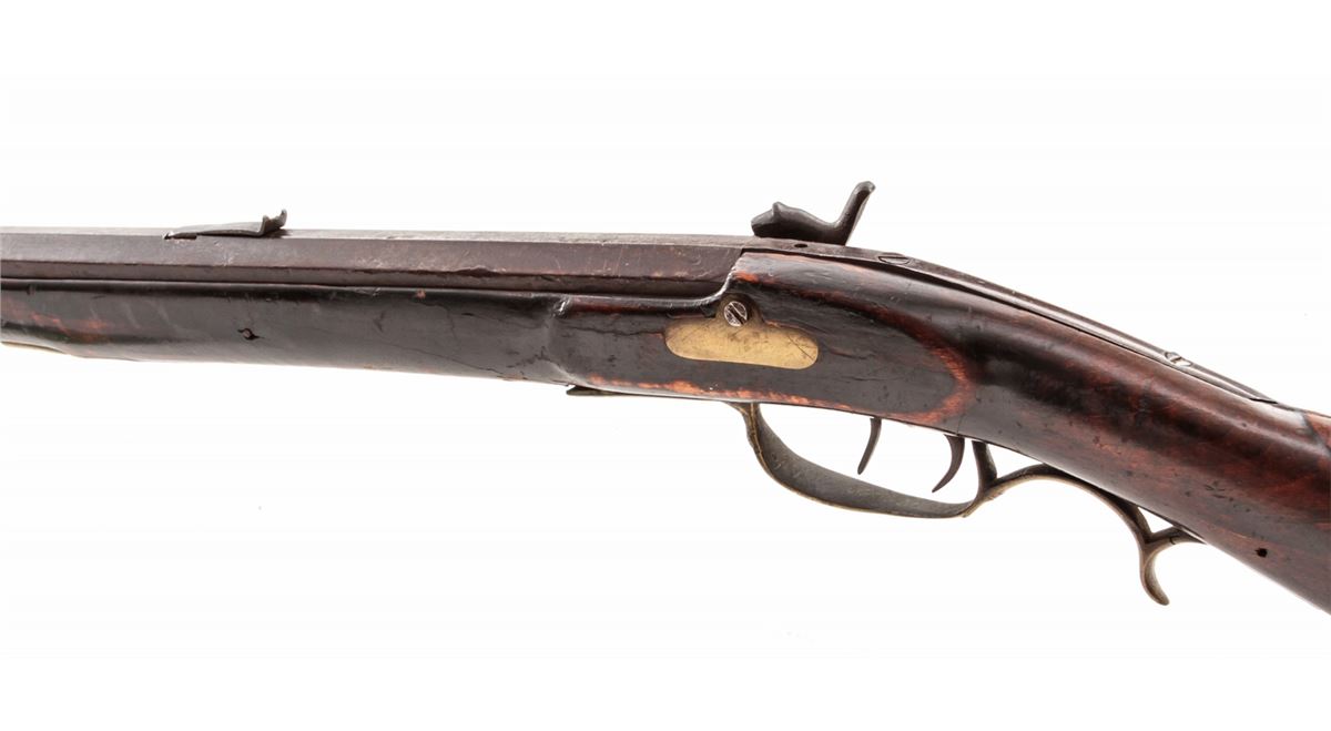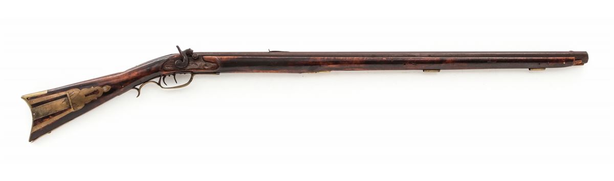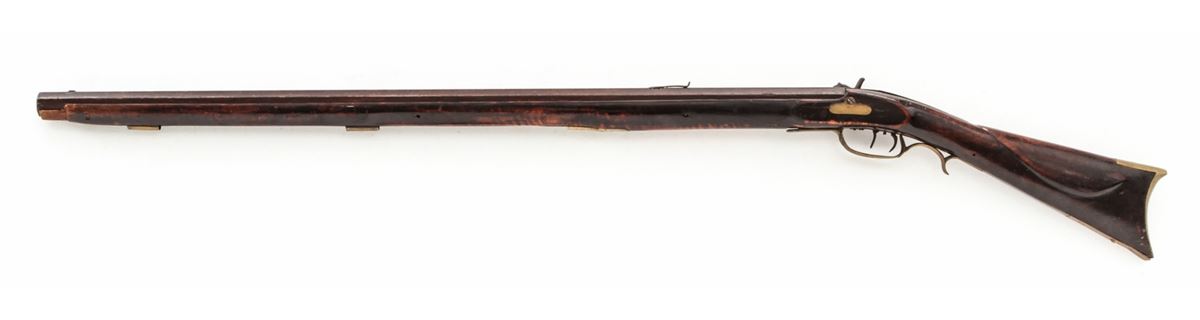 Unmarked Fullstocked Percussion Plains Rifle, .46 cal., 36'' medium weight octagonal barrel, full-length walnut stock with elegant cheekpiece, double set trigger, with Pennsylvania style pierced brass patchbox. Condition is fair showing heavy use to iron surfaces and minor separation to brass at butt. Missing forend cap and ramrod. Est.: $250-$400. (Antique)