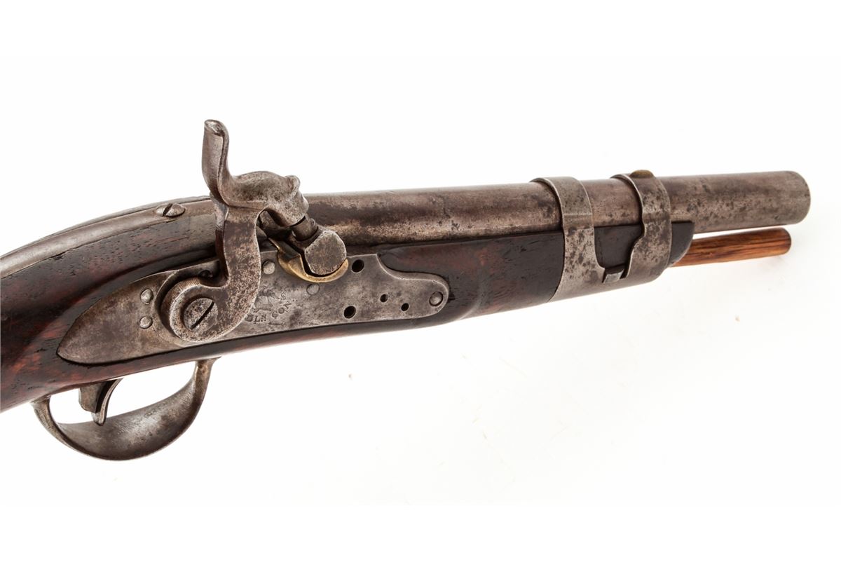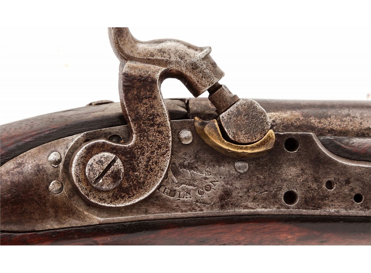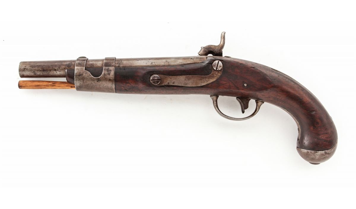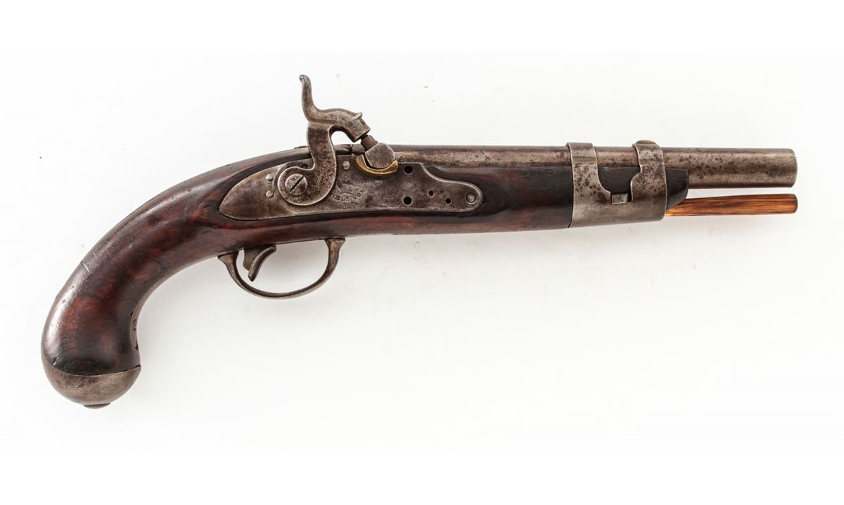 U.S. Model 1816 Pistol converted to Percussion, by S. North, .54 cal., 9'' barrel, bright finish, walnut stock, with ''US'' and ''P'' proofmarks to top of barrel. Condition is very good as converted, with bolster type nipple fitting nestled in bronze pan. Holes from spring and frizzen remain in lockplate. Metal surfaces have toned a moderate brown. Stock with light scuffs, dings and oil darkening. Ramrod is a later replacement. Est.: $300-$500. (Antique)