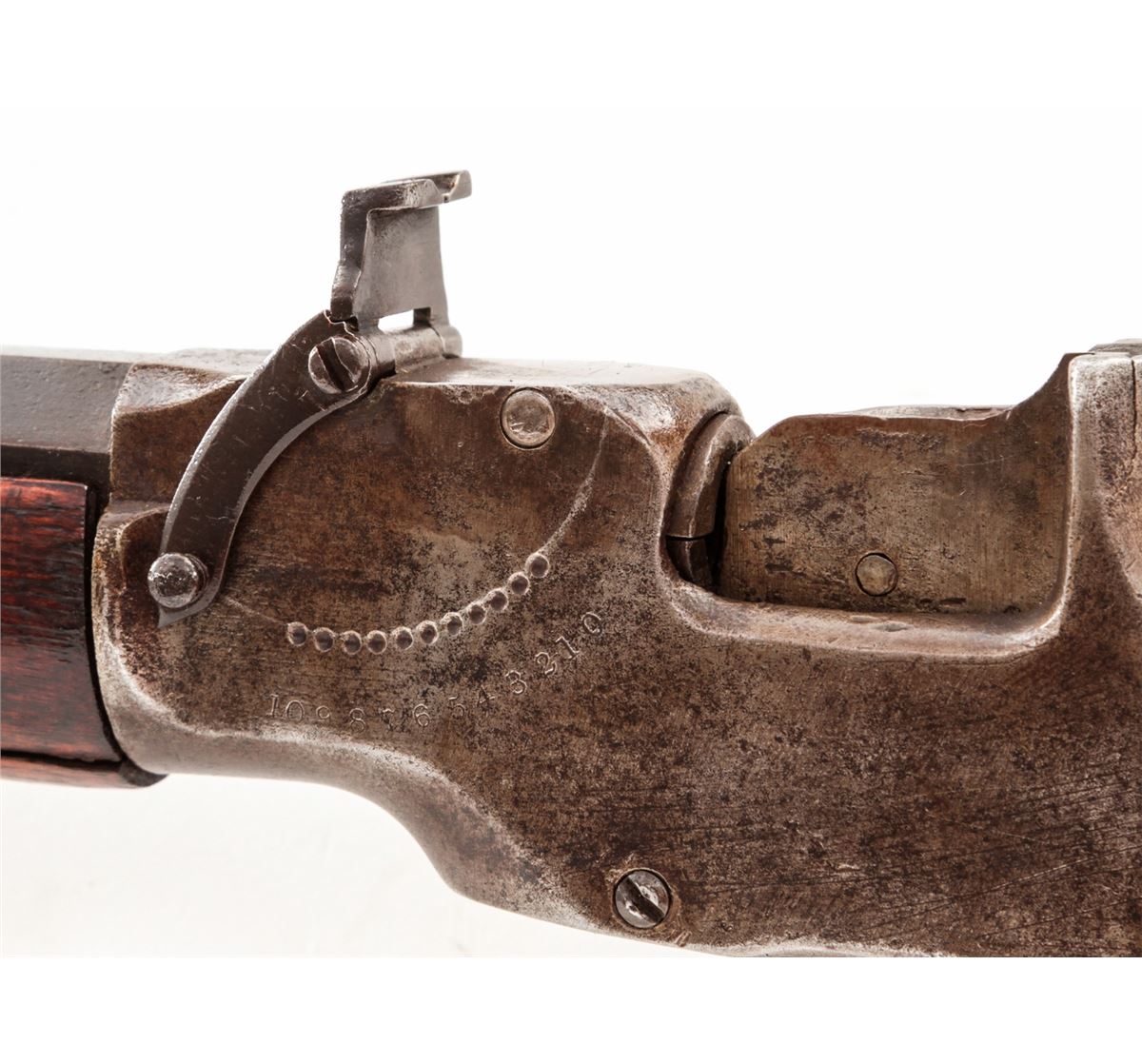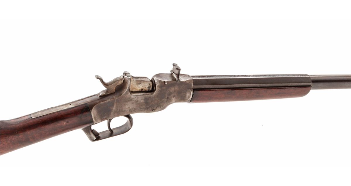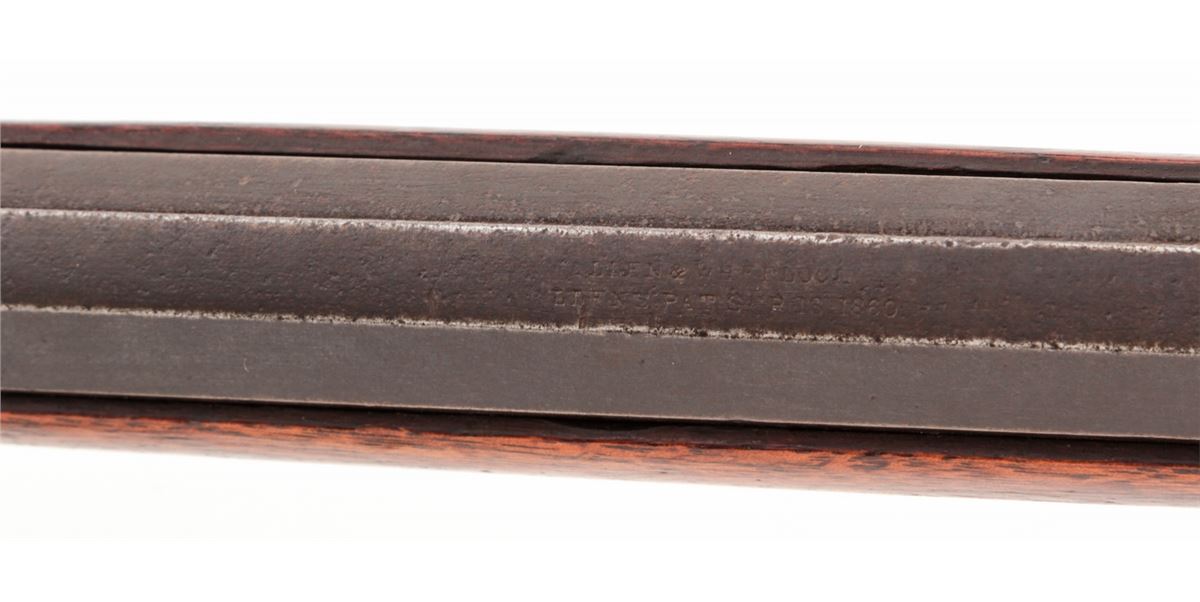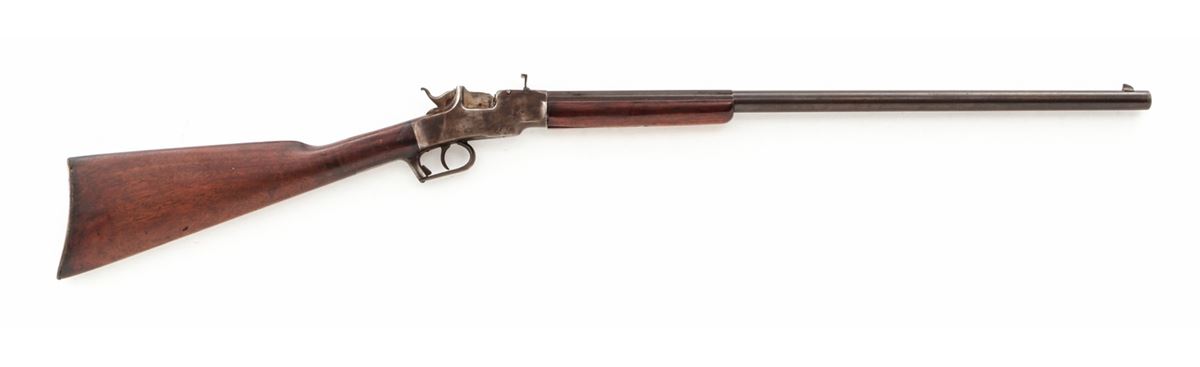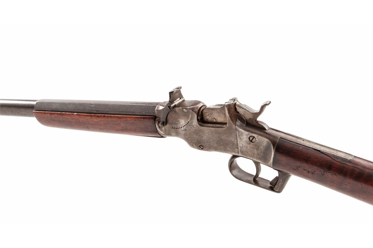 Allen & Wheelock Drop-Breech Single Shot Rifle, NVSN, .38 RF cal., 24'' part-round barrel, blue finish, walnut stock and forend. Condition is good to very good. Barrel assembly retains approx. 80% thinning blue, which may have been re-colored at one point as address markings are faint and there is some pitting beneath the blue. Frame retains approx. 20% blue with the balance having toned a silvery brown. Both stock and forend with small fractures; forend with two parallel fissures beginning at frame; stock with one small crack emanating at upper tang. Action and bore are good. Est.: $450-$600. (Antique)