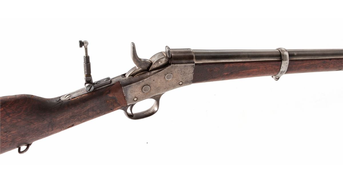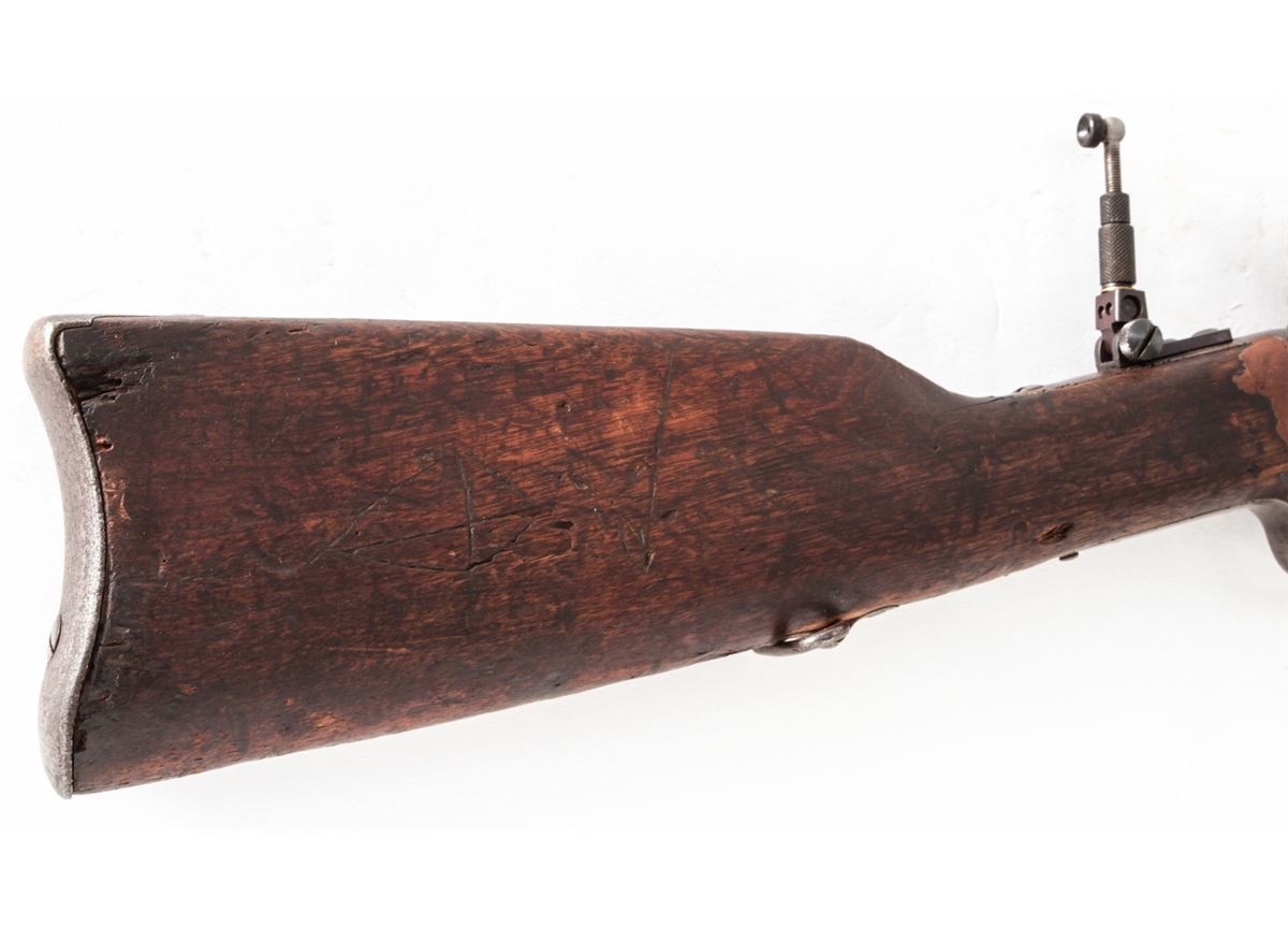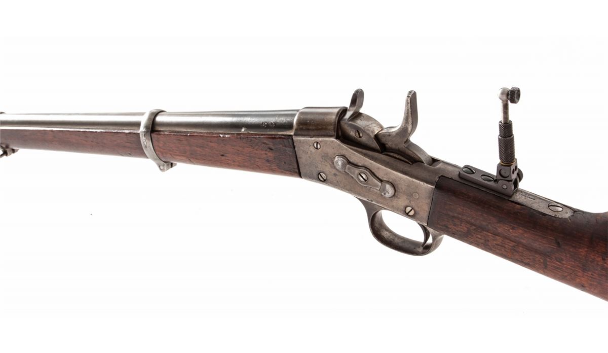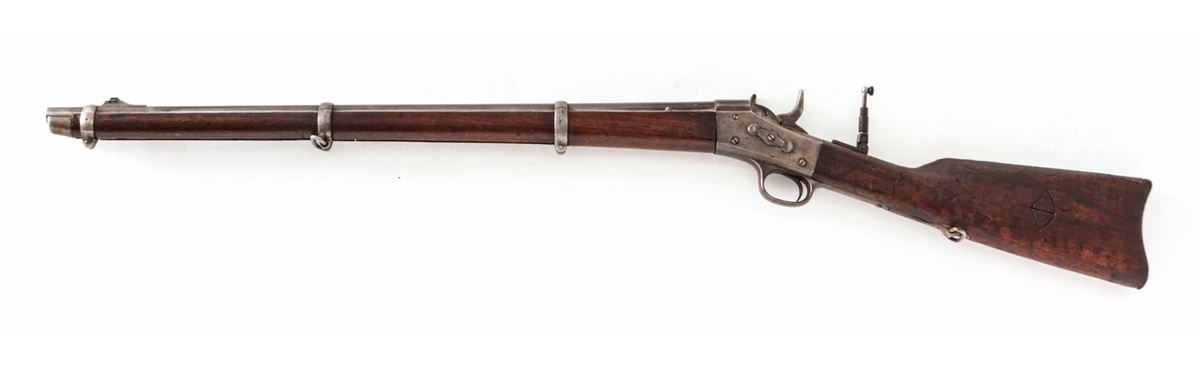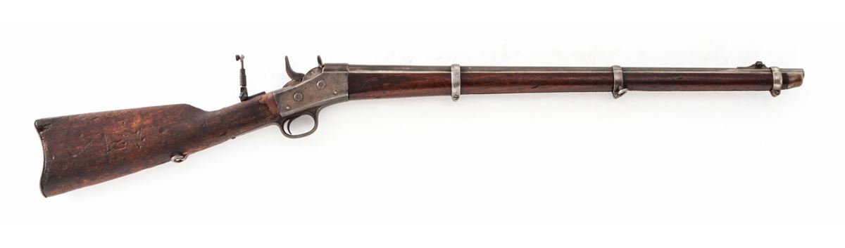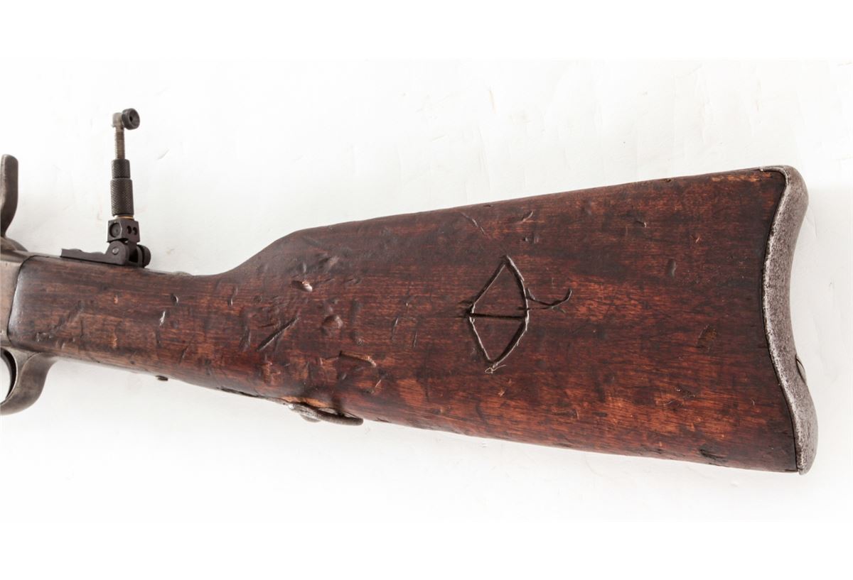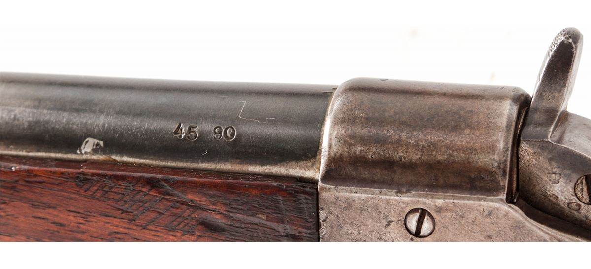 Remington Rolling Block Rifle, NVSN, converted to .45-90 cal., 27'' blue barrel, case hardened frame, walnut stock and forend, with modern tang and front sight. Condition is very good as modified, retaining approx. 20% blue. Buttstock with dark stains and scratches and one repair to forward right portion where it abuts the frame. Stock with possible Indian motif to both sides. Forend with scuffs and repairs. Action is crisp, bore is good. Est.: $250-$400. (Antique)