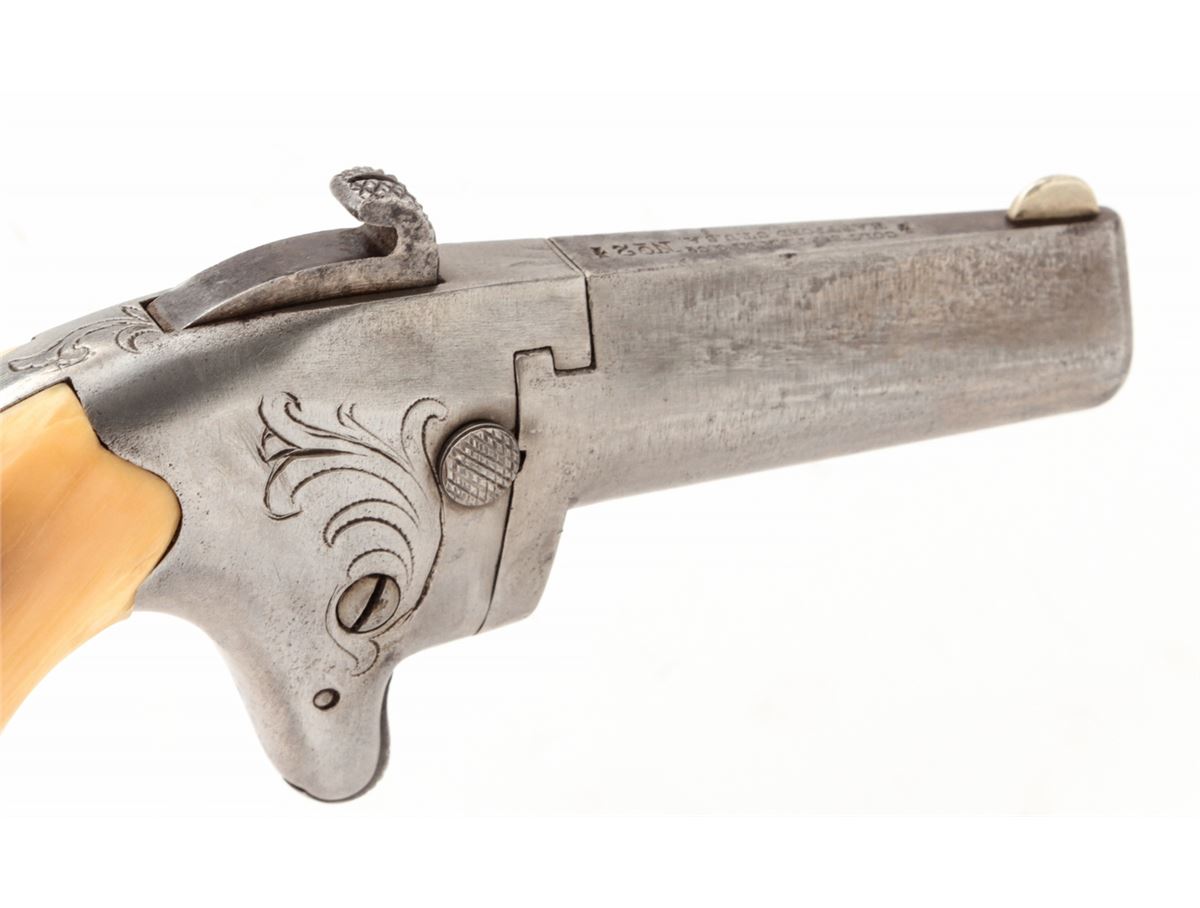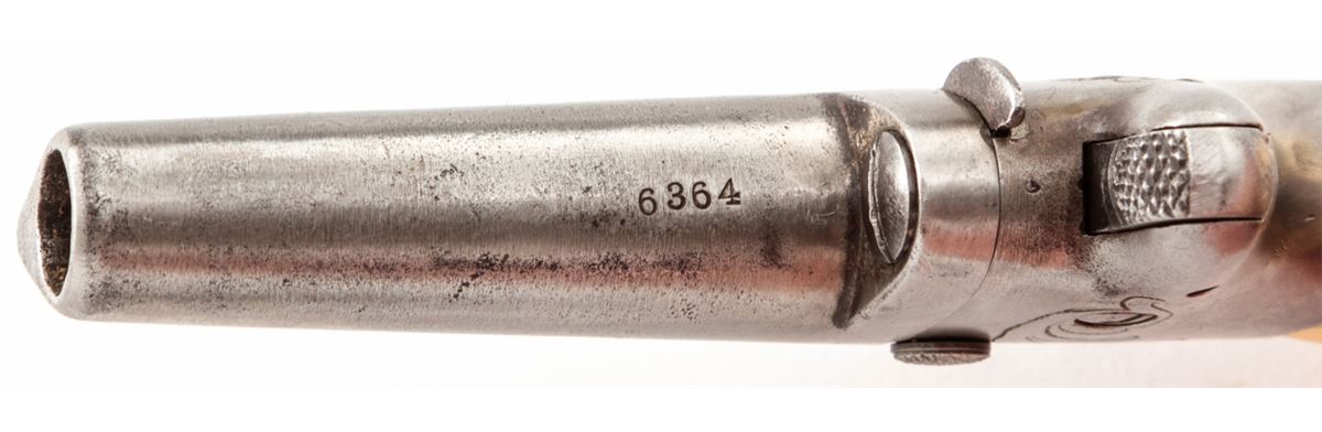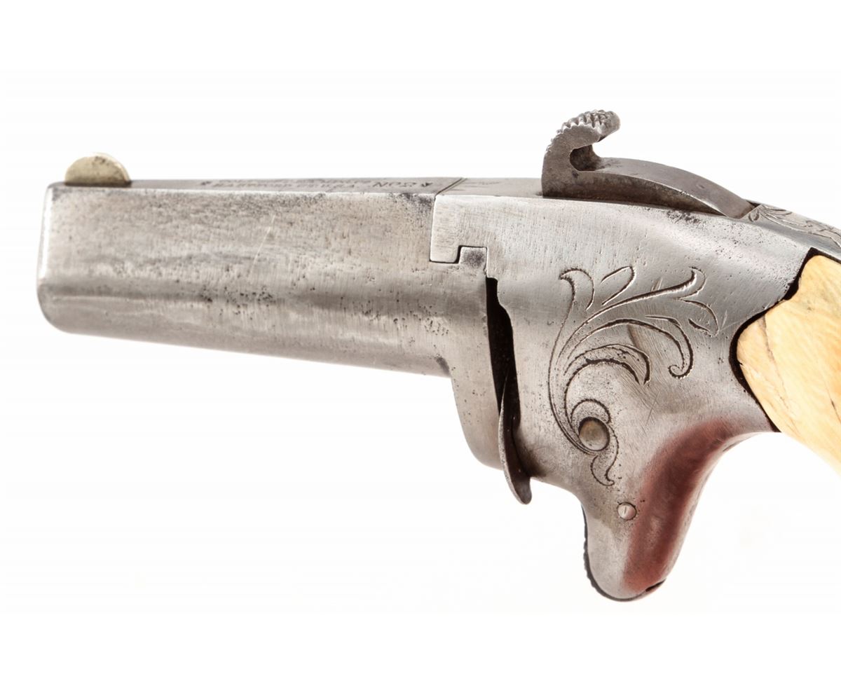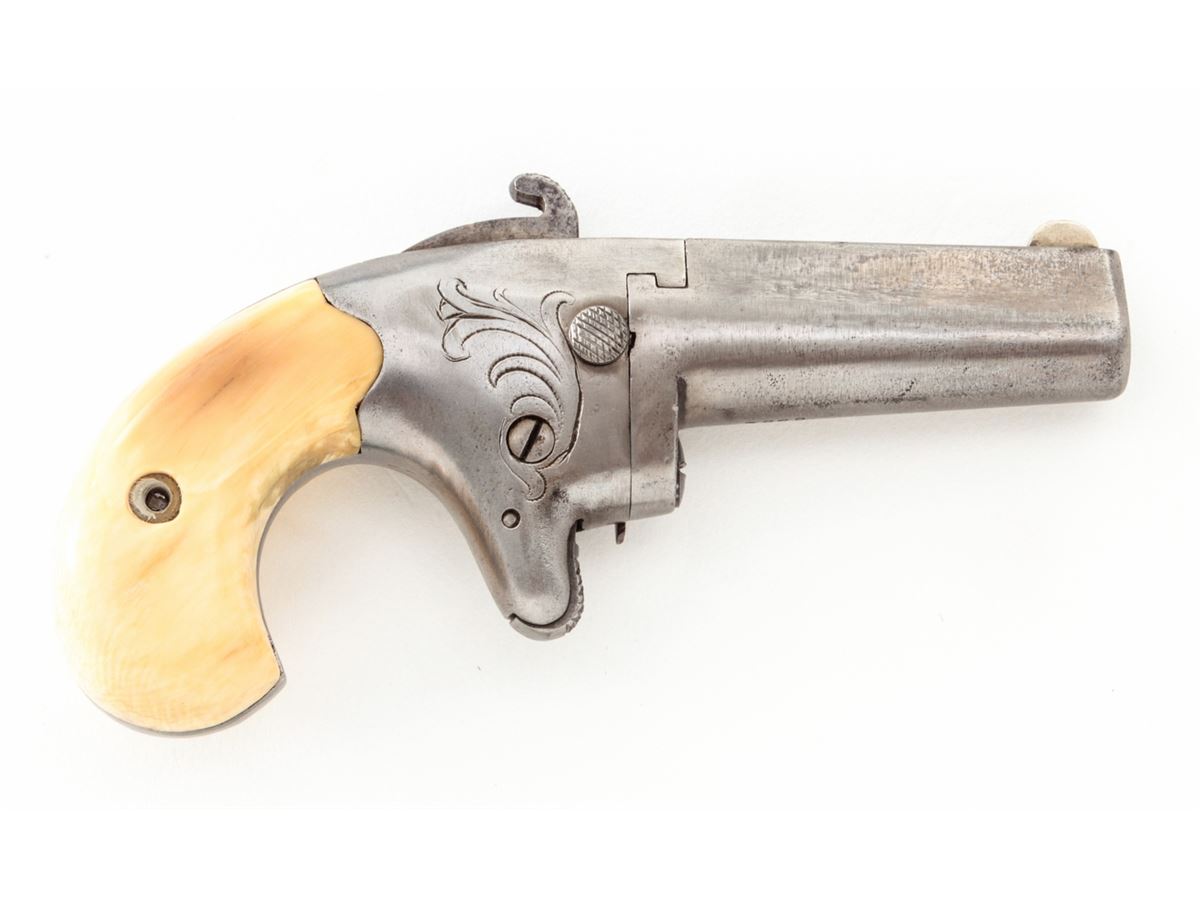 Colt No. 2 Single Shot Derringer, #6363, .41 RF cal., 2'' barrel, originally blue and case hardened finish, bone grips. Condition is very good having been cleaned with little finish remaining. Later added grips show minor gaps in places; escutcheons and grip screw are not original. Good action, fair bore. Est.: $250-$400. (Antique)