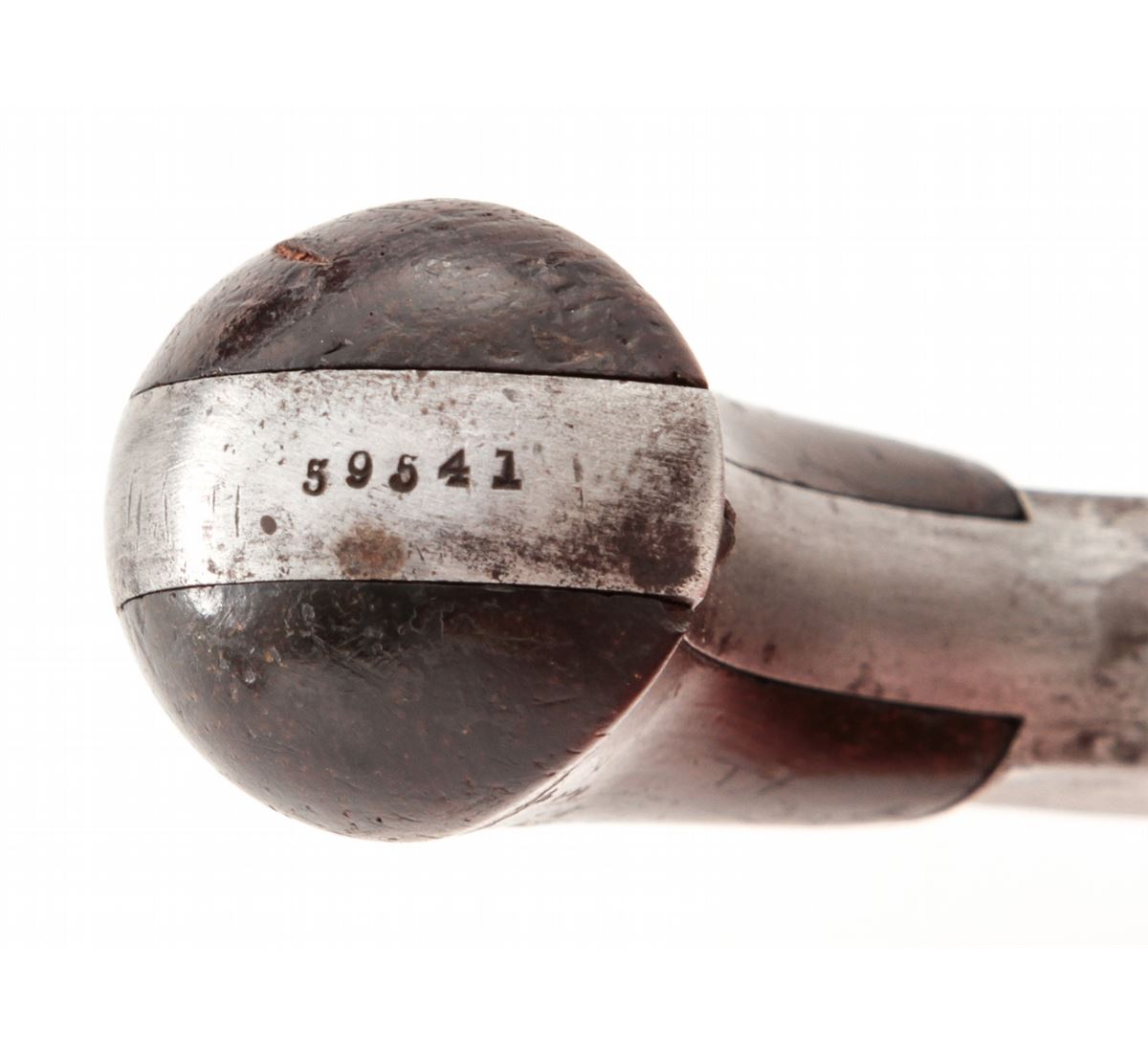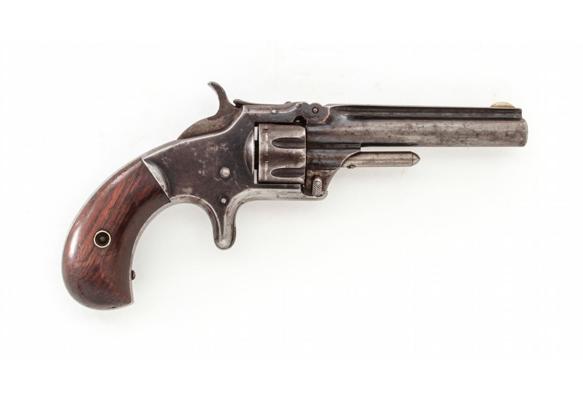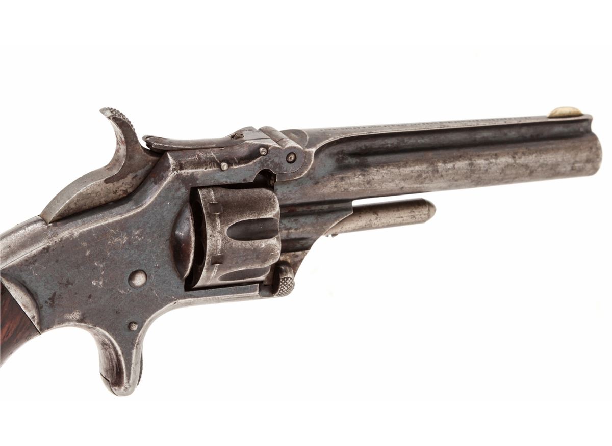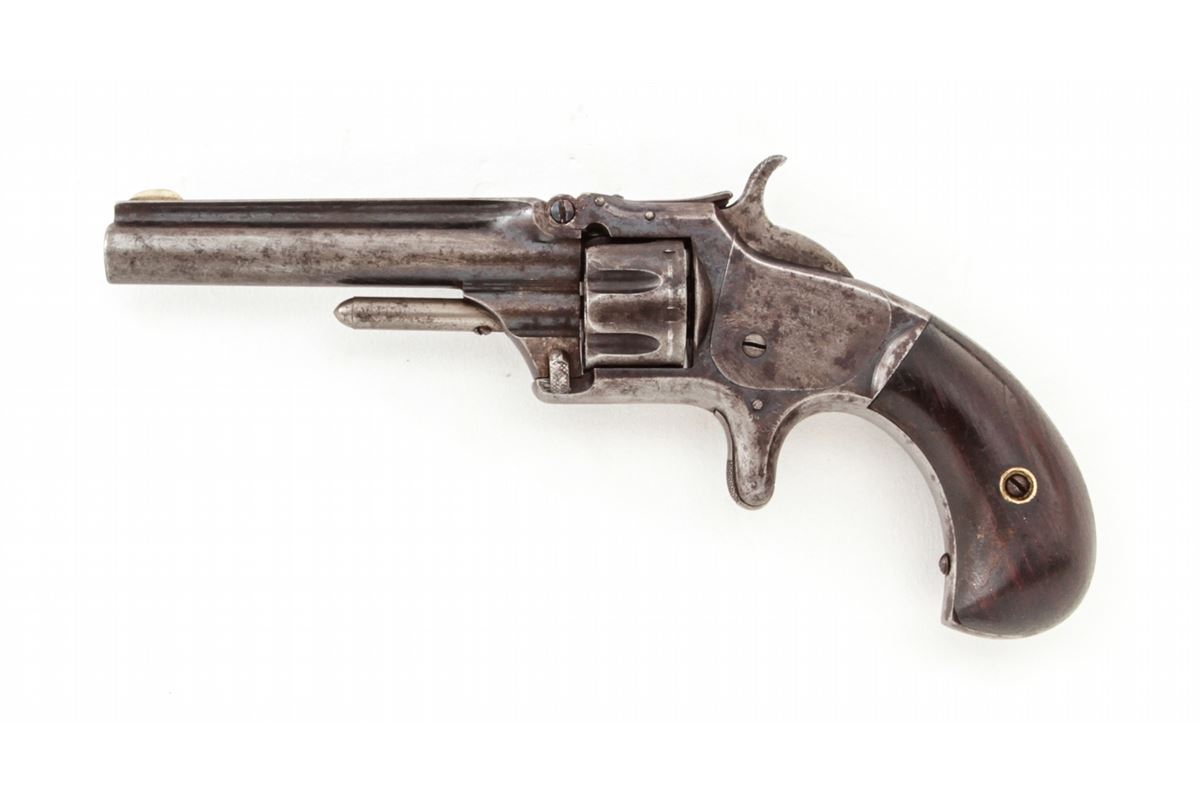 Smith & Wesson No. 1 3rd Issue Spurtrigger Revolver, #59541, .22 Short cal., 3-3/16'' barrel, blue finish, rosewood grips. Condition is about very good retaining approx. 50% blue. Grips with moderate knackering and oil darkening. Good action, fair bore. Est.: $200-$400. (Antique)