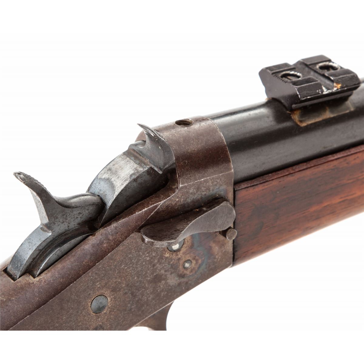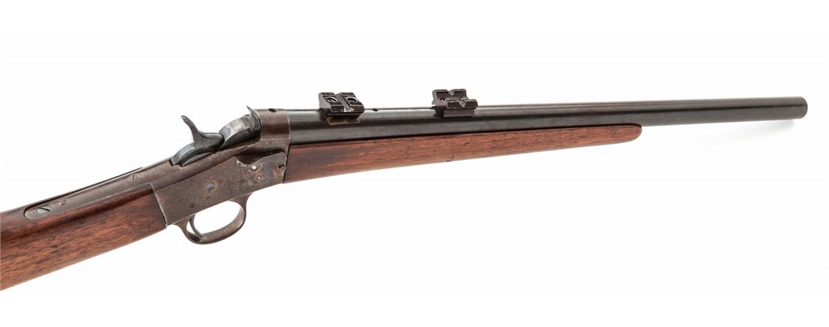 Antique Remington New Model No. 4 Rolling Block Rifle, NVSN, .22 cal., 16'' round blue barrel, case hardened takedown frame, straight-grip smooth walnut stock, with factory steel buttplate. Condition is very good with added Weaver scope rings, and several drilled and taped screws to top of barrel and frame. Good wood, crisp action, bright bore. Barrel was professionally crowned at time of shortening. Est.: $150-$300. (Antique)