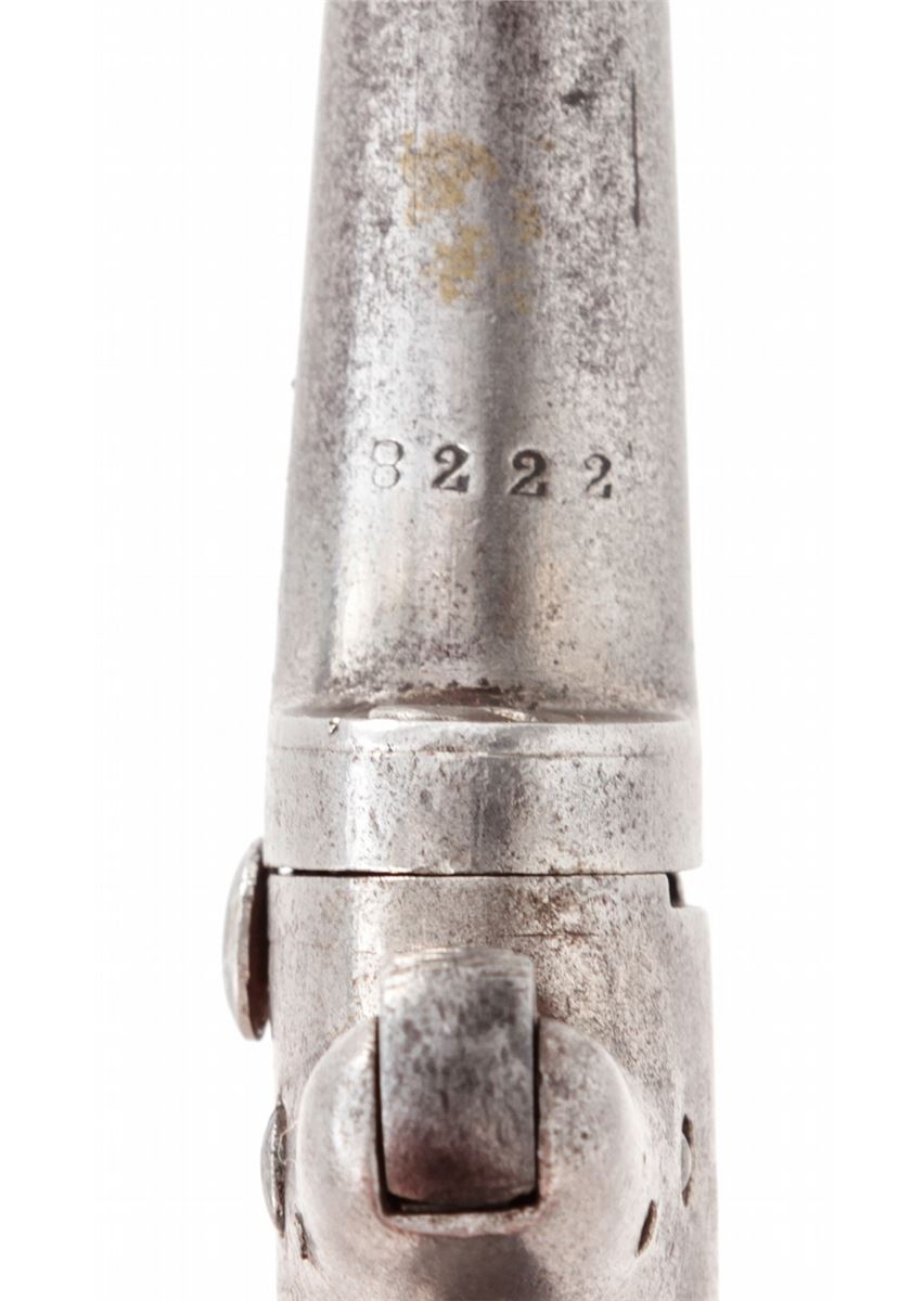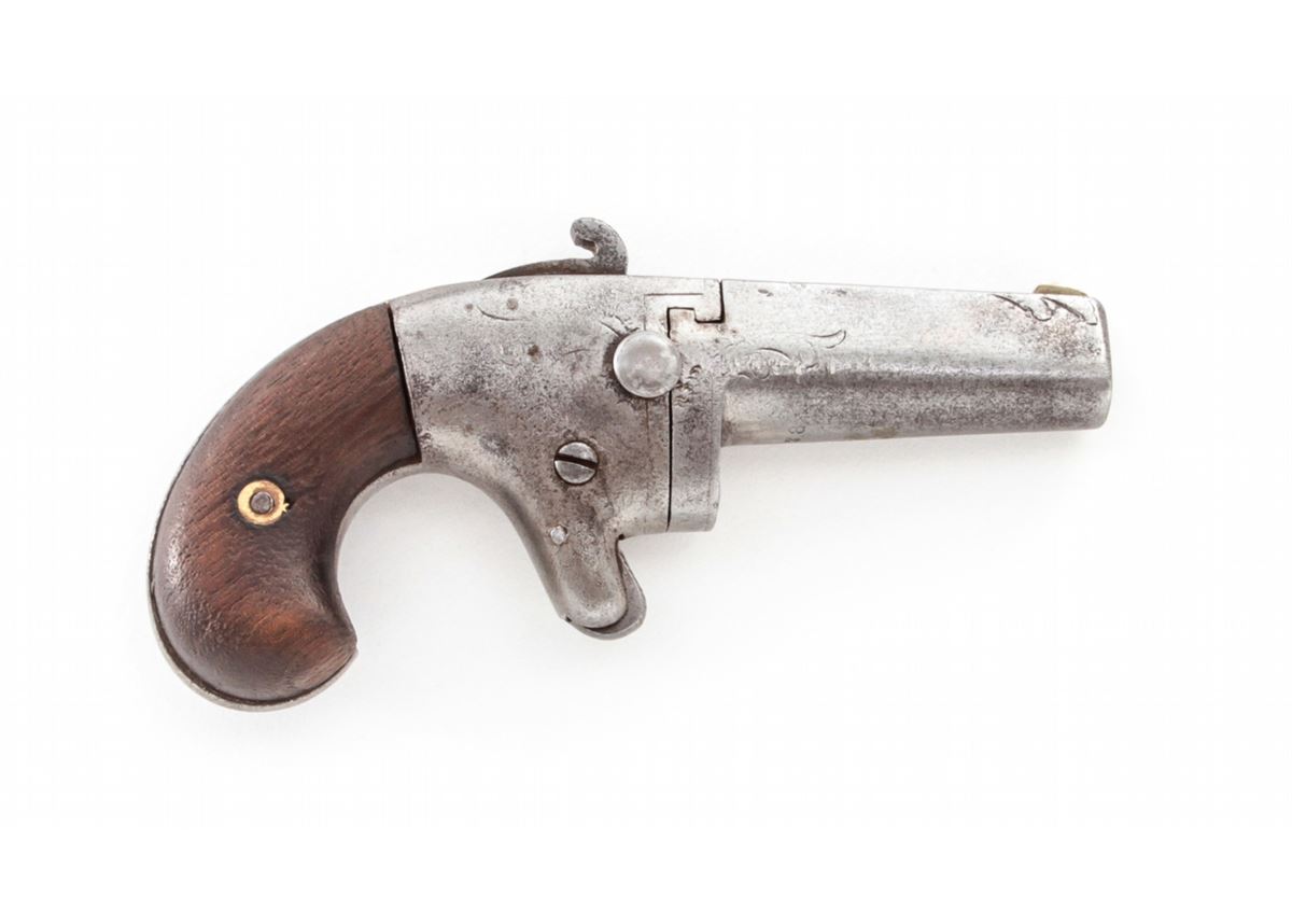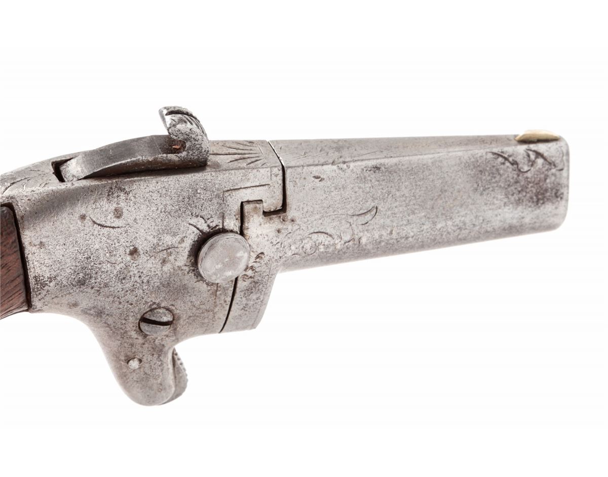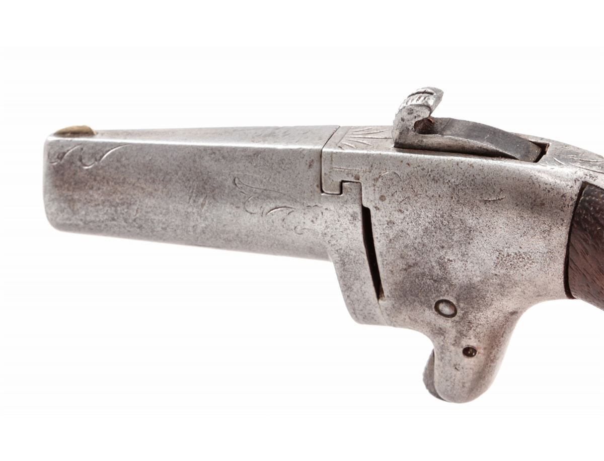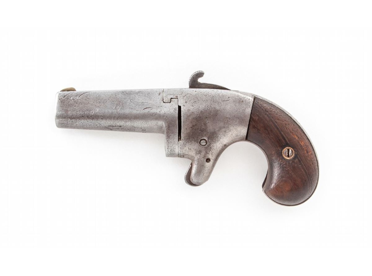 National Arms Single Shot Derringer, #8222, .41 RF cal., 2-1/2'' barrel, lightly engraved, walnut grips. Top of barrel marked ''National Arms Co., Brooklyn, NY''. Condition is good with little original finish and knackering at barrel address. Good working action, dark bore. Est.: $200-$400. (Antique)