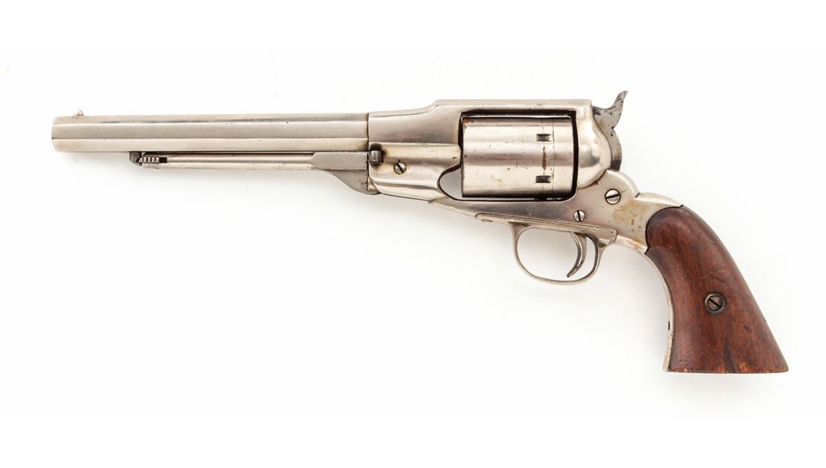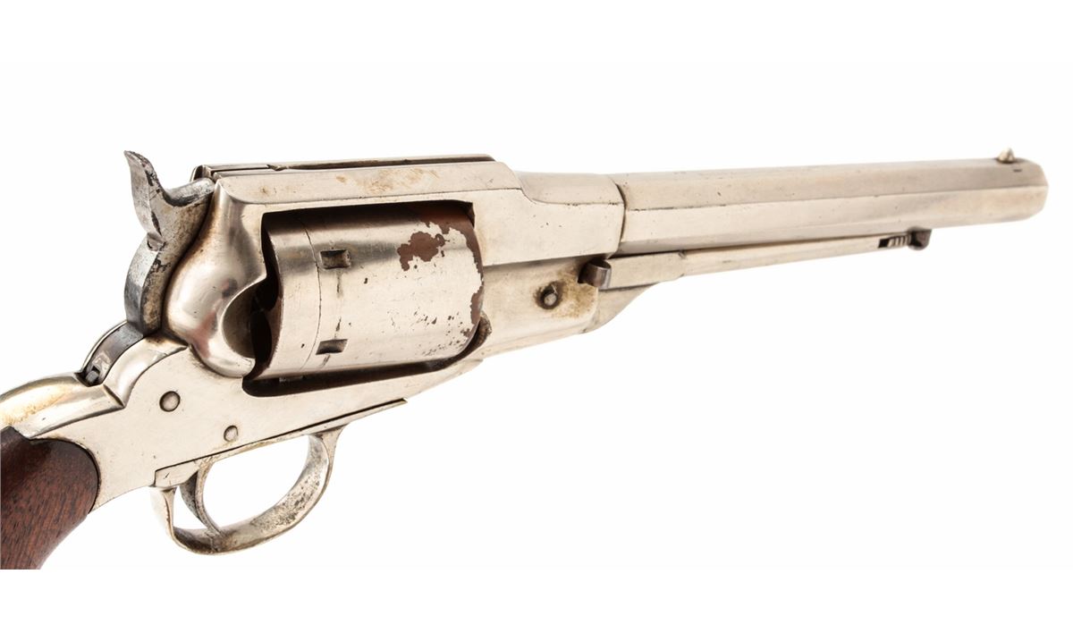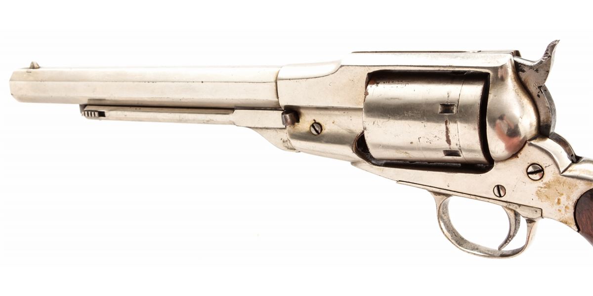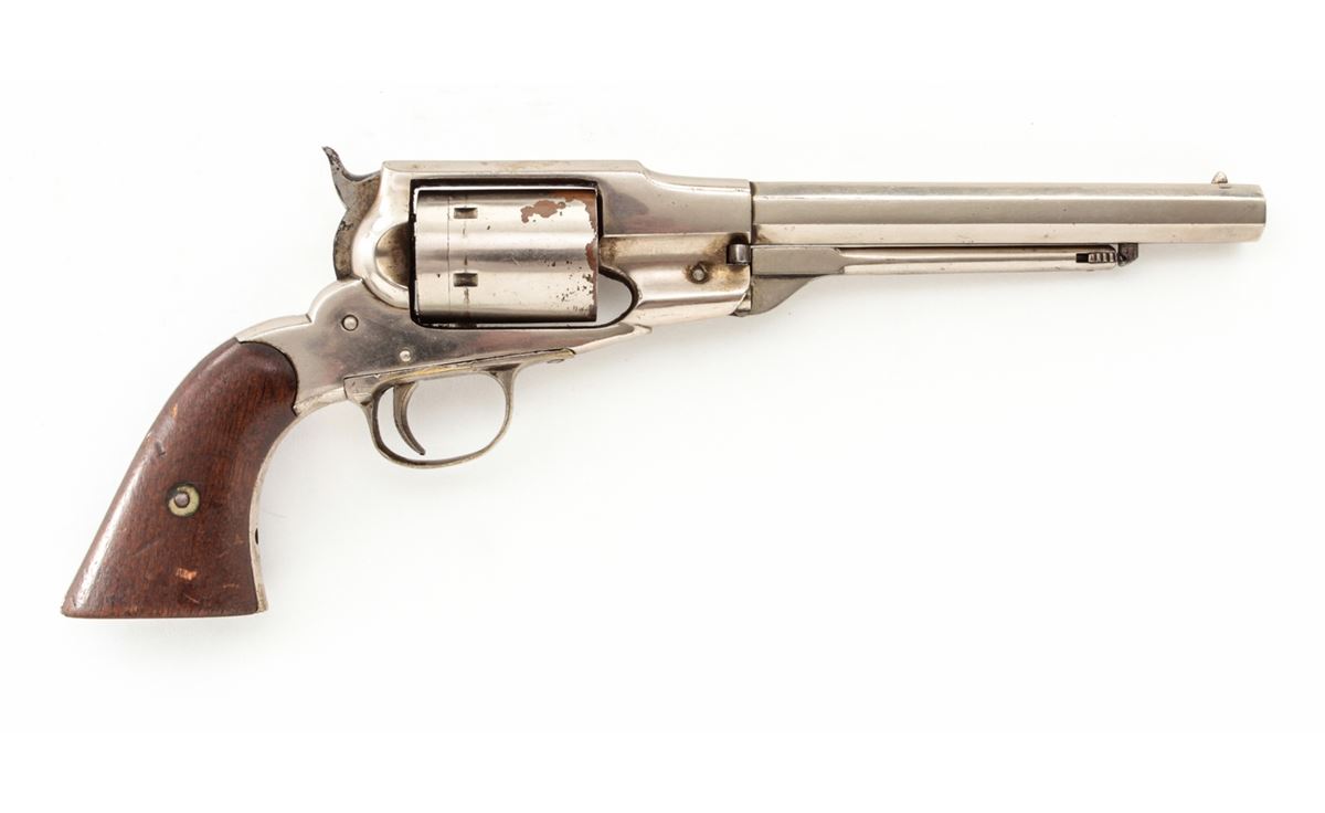Remington-Beals Model 1861 Navy Converted to Cartridge, #10595, .38 RF cal., 7-1/2'' barrel, nickel finish, with two-piece walnut grips. Condition is excellent with later added nickel of which approx. 92% is retained. Grips with light scuffs and one loss to left panel near butt. Good action, fair bore. Est.: $600-$800. (Antique)