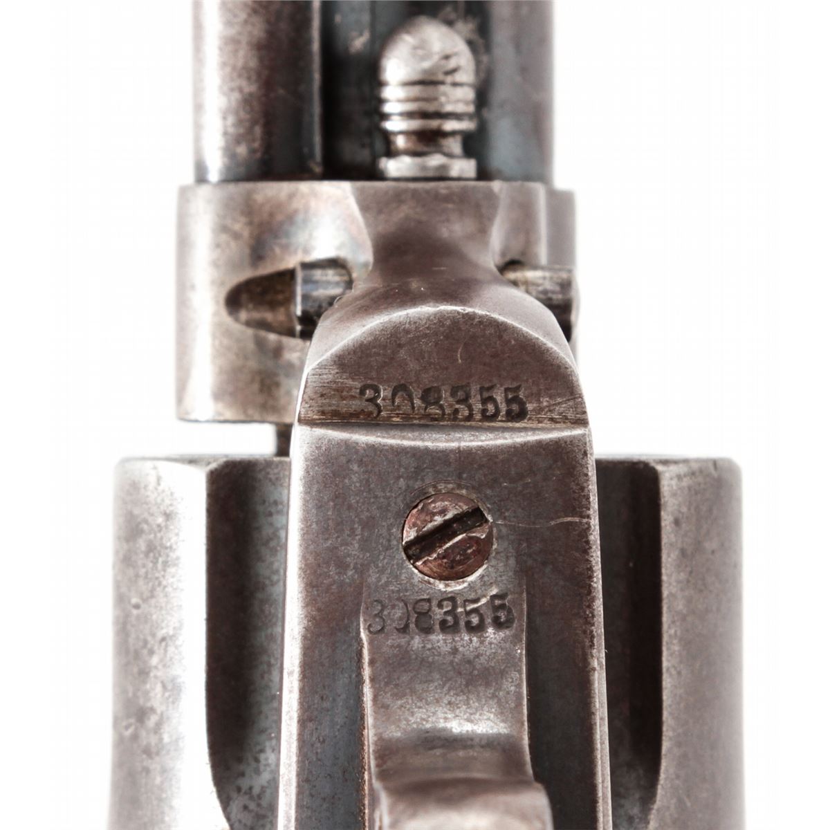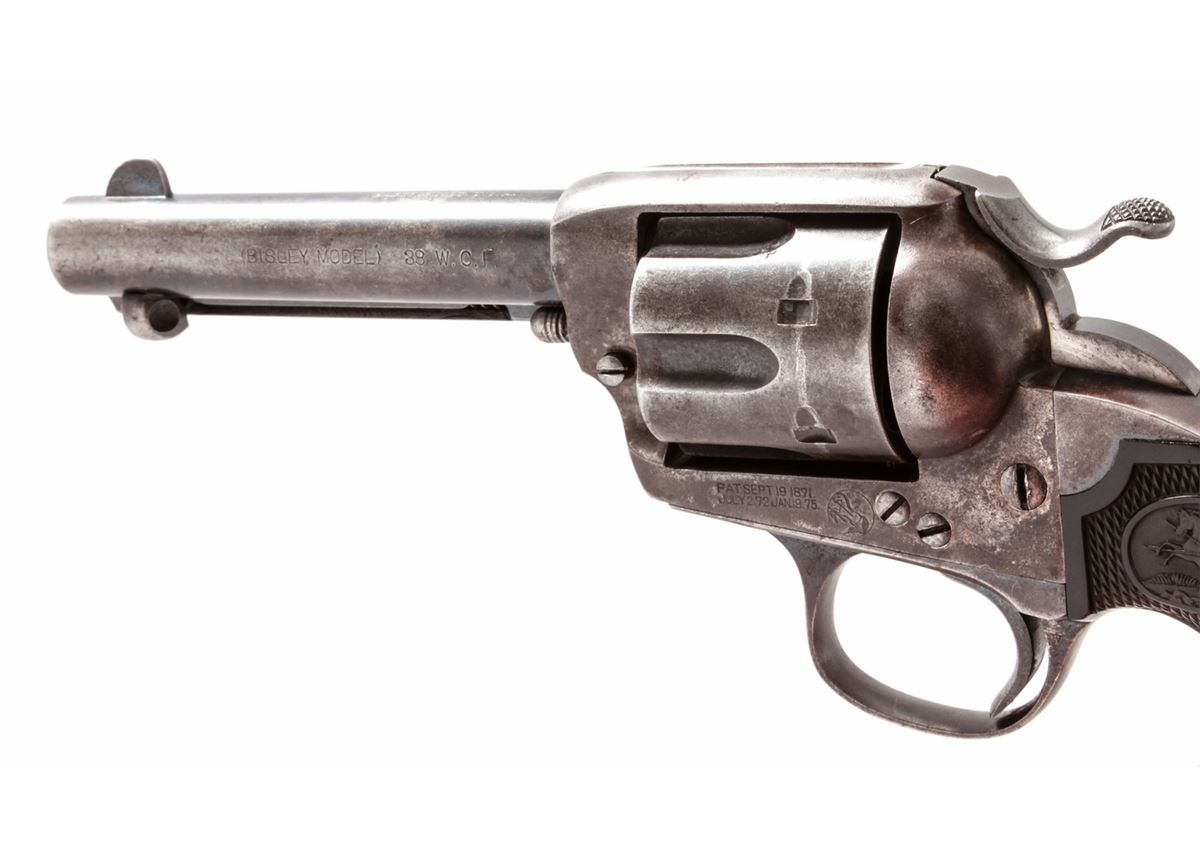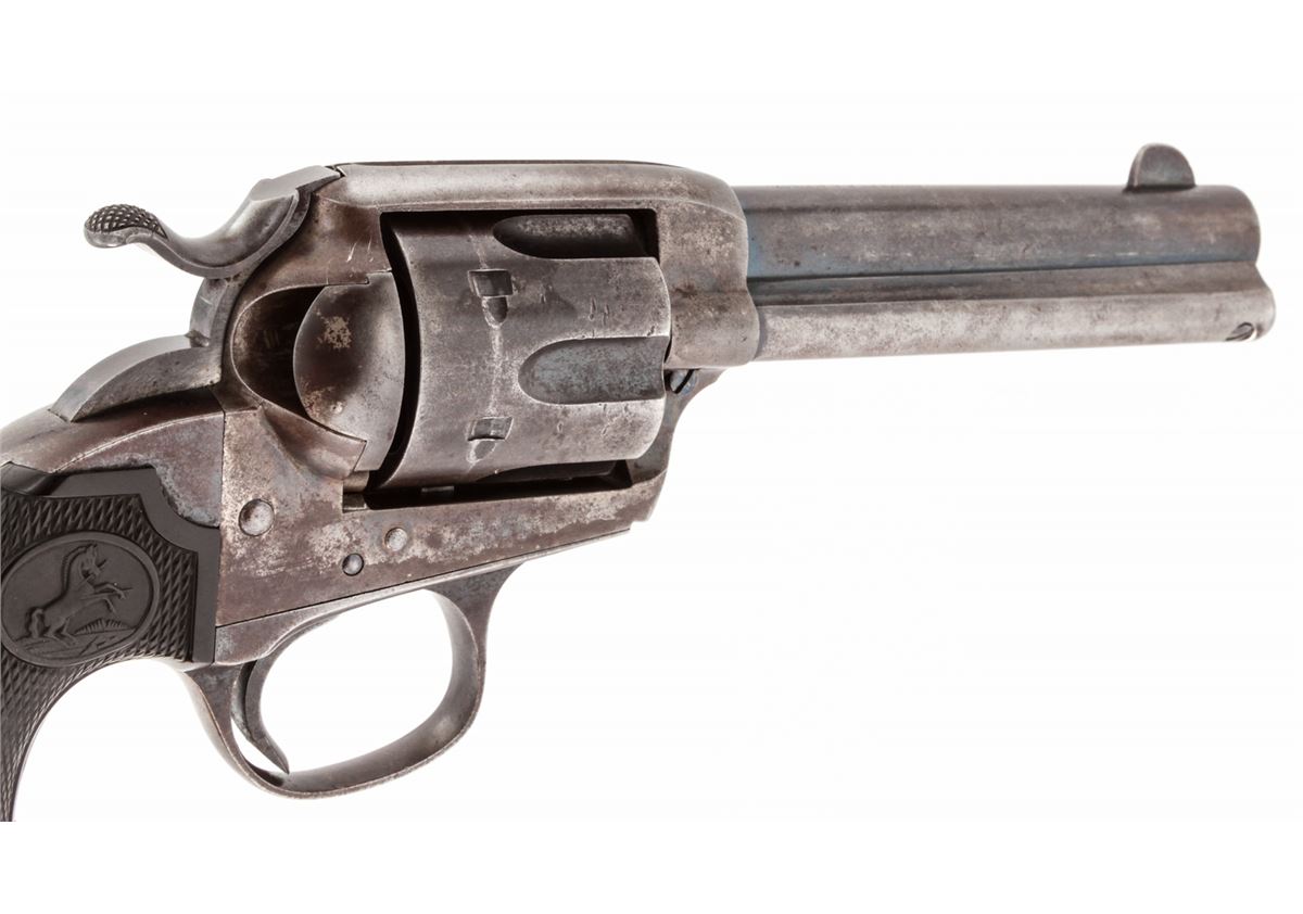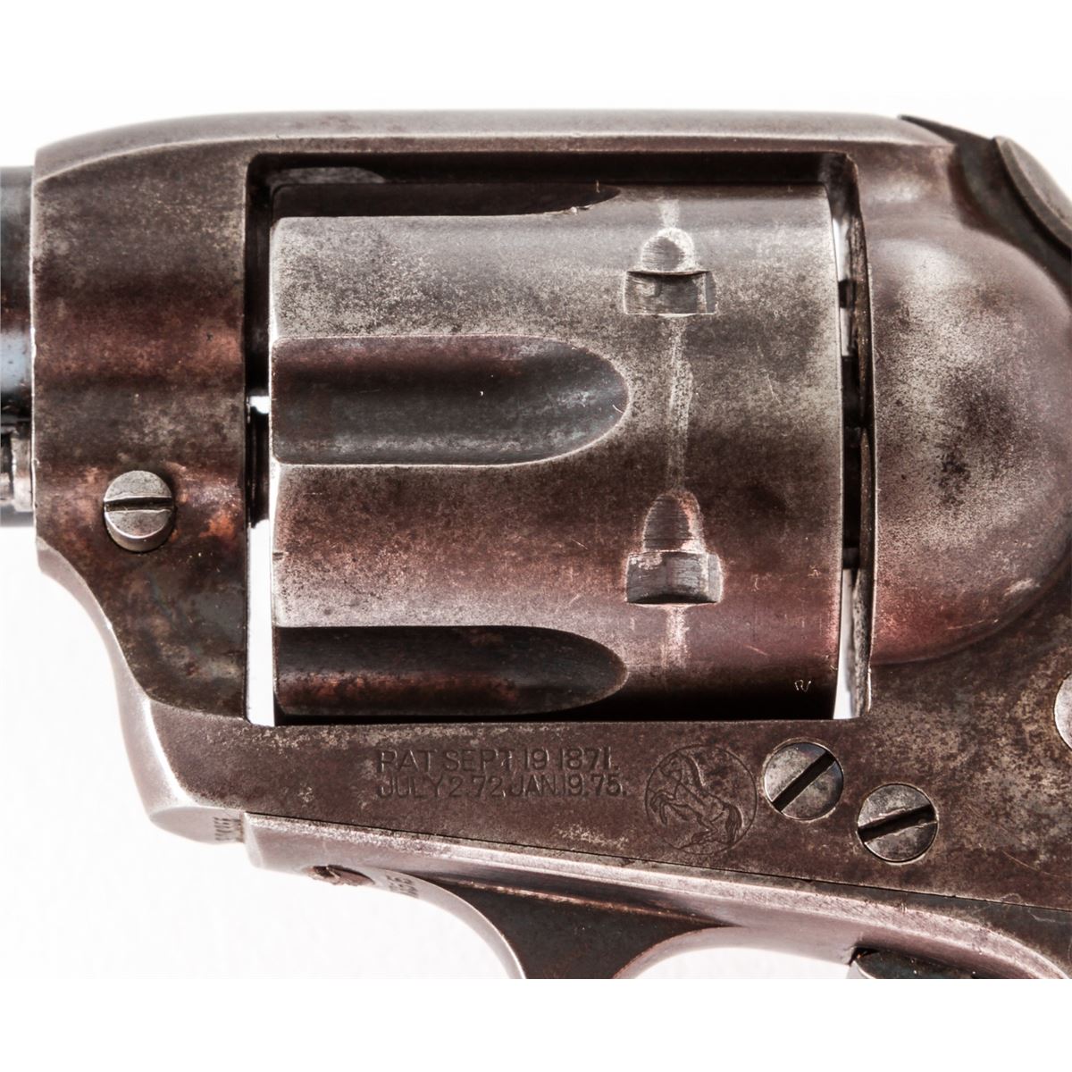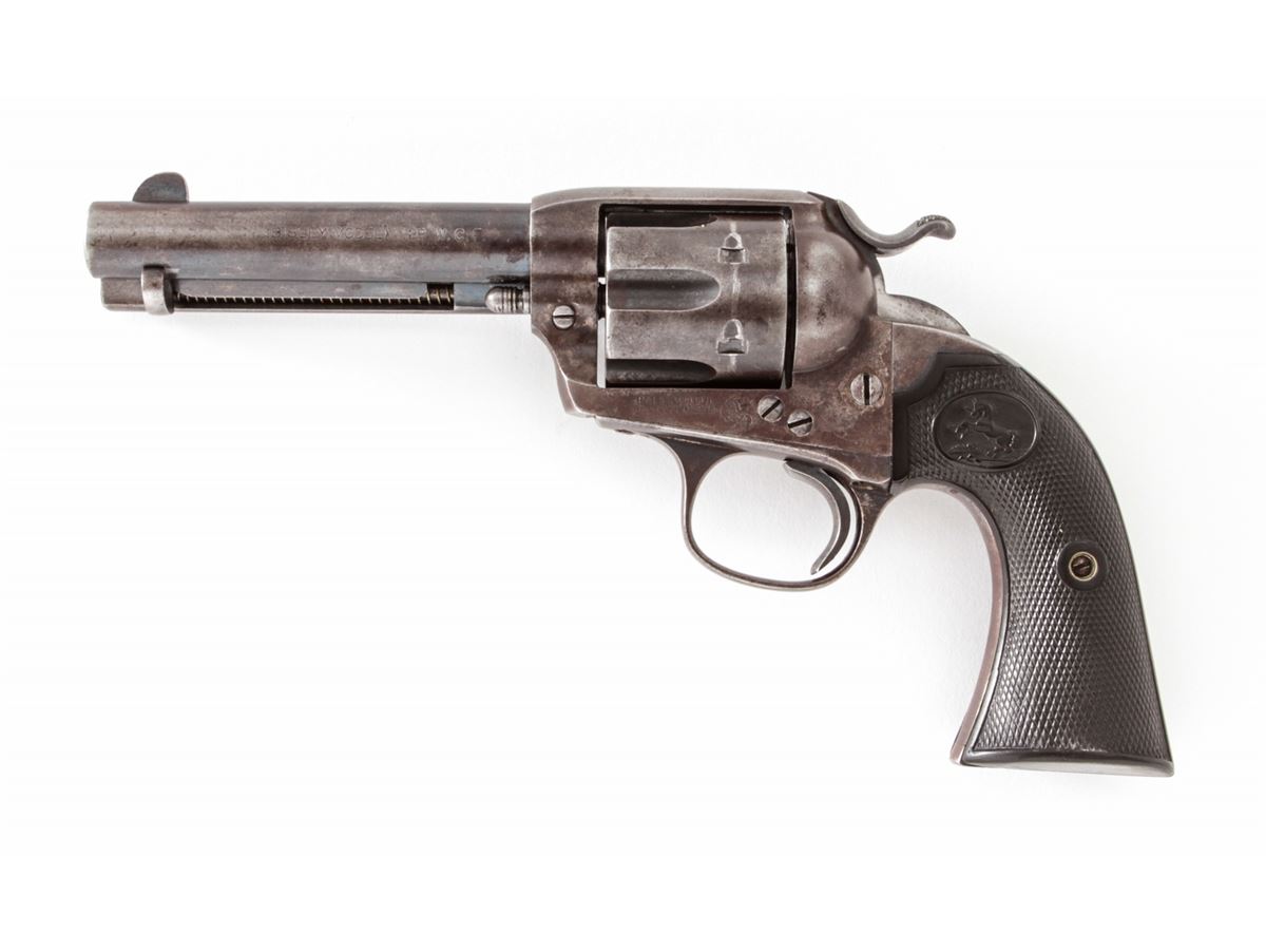 Colt Bisley Single Action Revolver, #308355, .38-40 cal., 4-3/4'' barrel, blue and case hardened finish, factory checkered hard rubber grips. Mfg'd 1909. Condition is very good retaining approx. 75% original toning finish. Grips with possible repair to left panel toe. Action and bore are fine. Est.: $1,200-$1,800. (C&R/PPT)