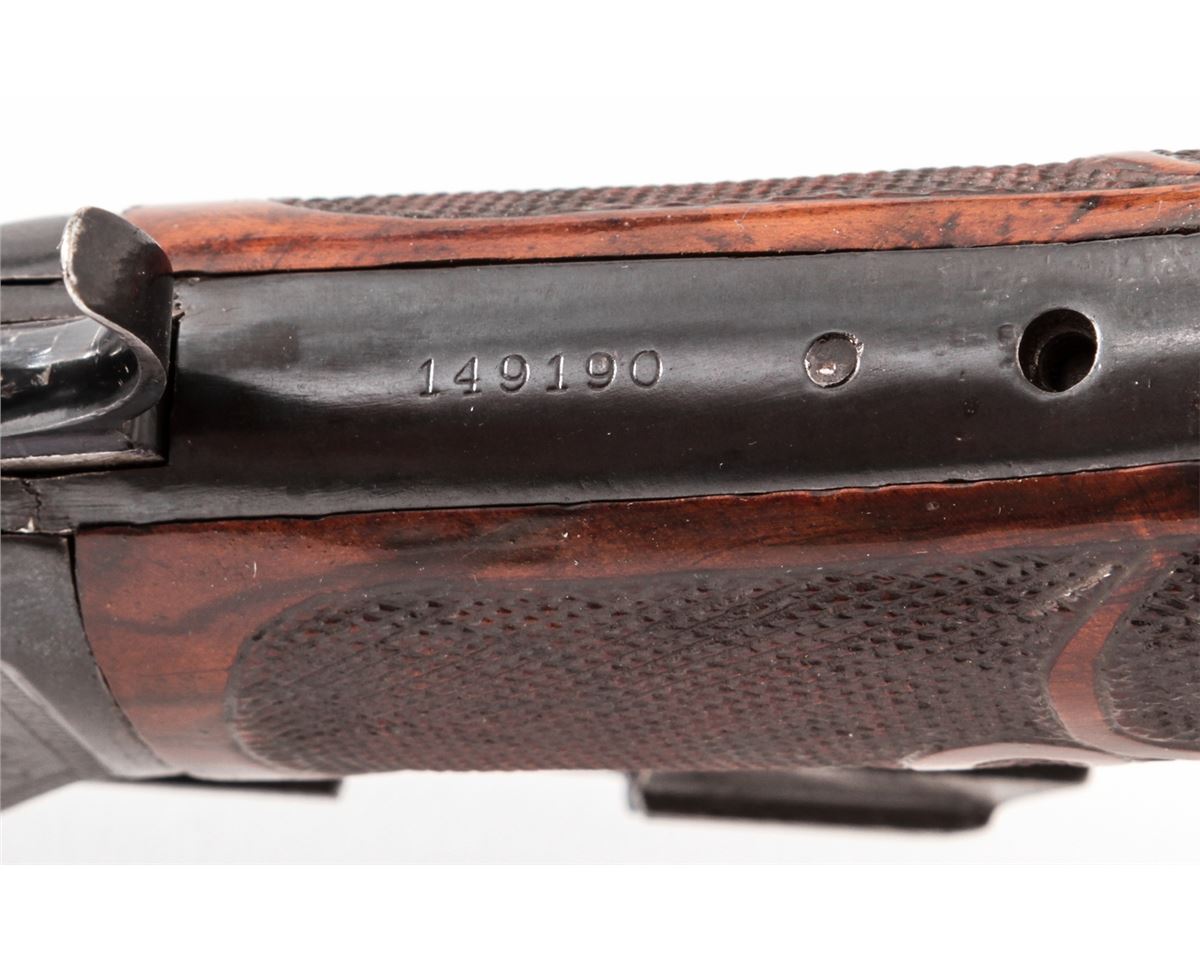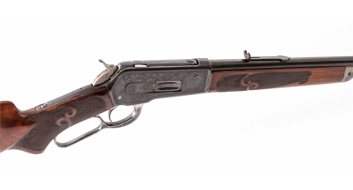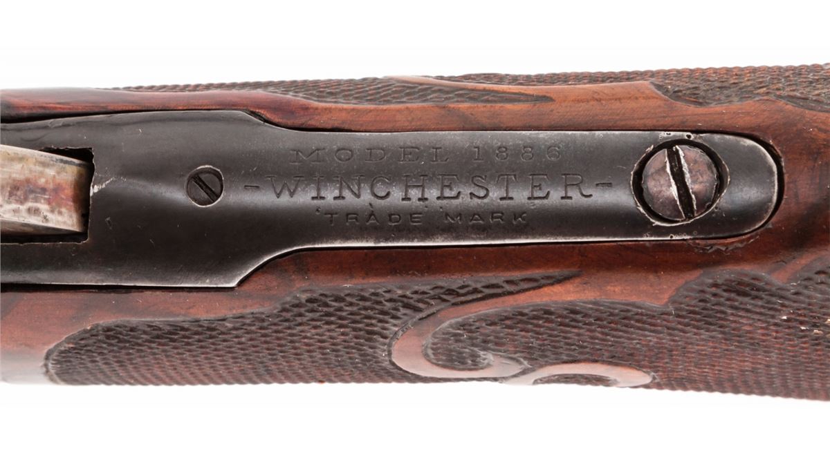Custom Engraved Winchester Model 1886 Lever Action Rifle, #149190, .50 Ex. cal., 26'' round barrel, scroll and game scene engraved blue receiver, custom checkered fancy walnut stock with case hardened shotgun steel buttplate. Gold band at muzzle and breech, with similarly engraved forend cap. Three-leaf rear sight and standard front sight. Condition is fair to good. Although this rifle shows well with approx. 95% of a hot salt blue, internal mechanism is tight and needs work. Lower tang with one missing screw and re-positioned serial number. Stock checkering needs cleanup to scroll carving. Bore is very good. Est.: $1,000-$1,500. (C&R)