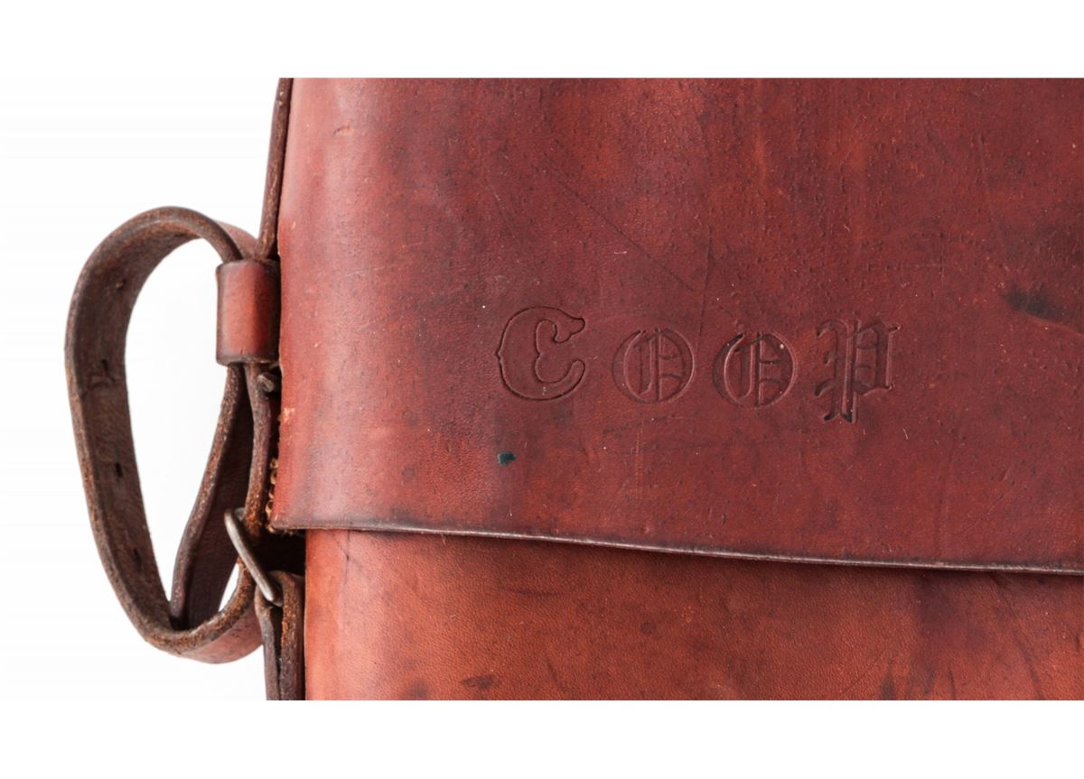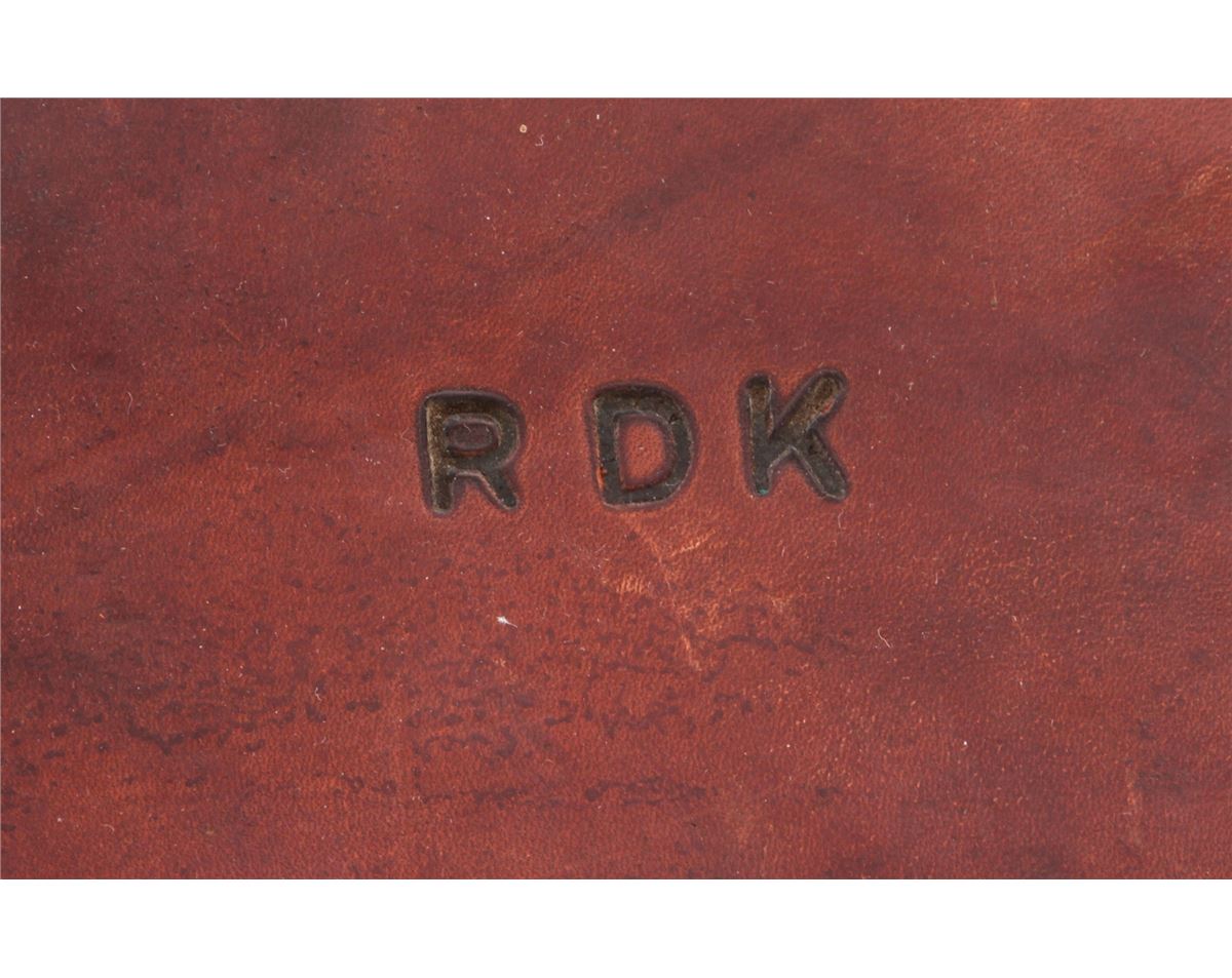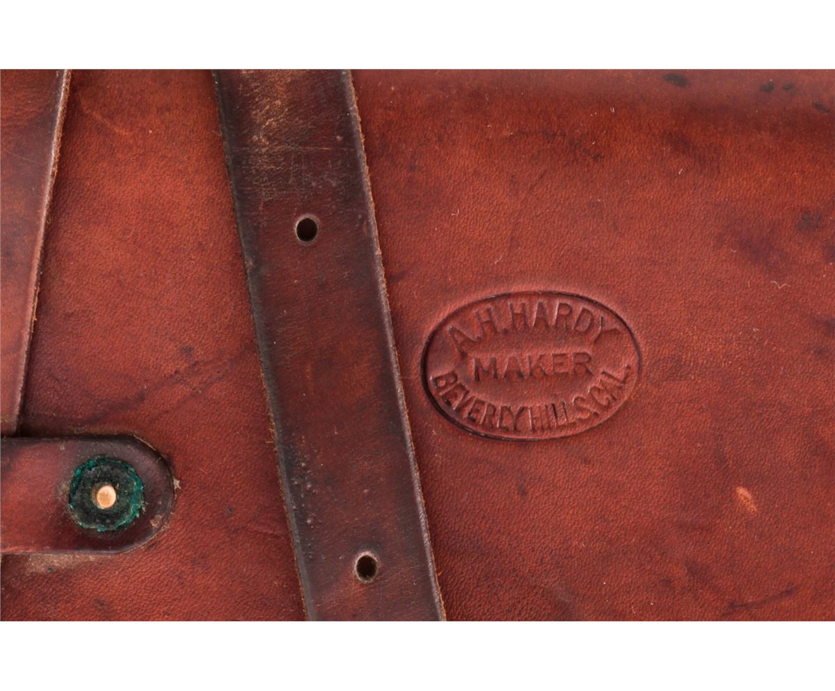 Two-Piece Brown Leather Rifle Scabbard, by A.H. Hardy, (Beverly Hills, Ca.), purportedly given to Gary Cooper while filming ''The Hanging Tree'' in 1959. Top half stamped ''Coop'' (later marked ''RDK'' to backside). Scabbard will fit a rifle measuring approx. 42'' overall. Condition is very good with minor verdigris near copper rivets. Top strap with minor separation; all others are tight and complete. Shows an overall nicely seasoned look. Est.: $300-$500.