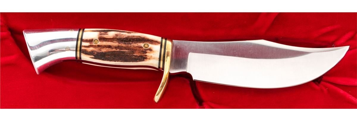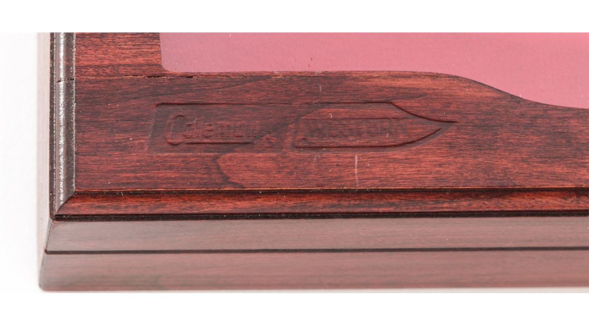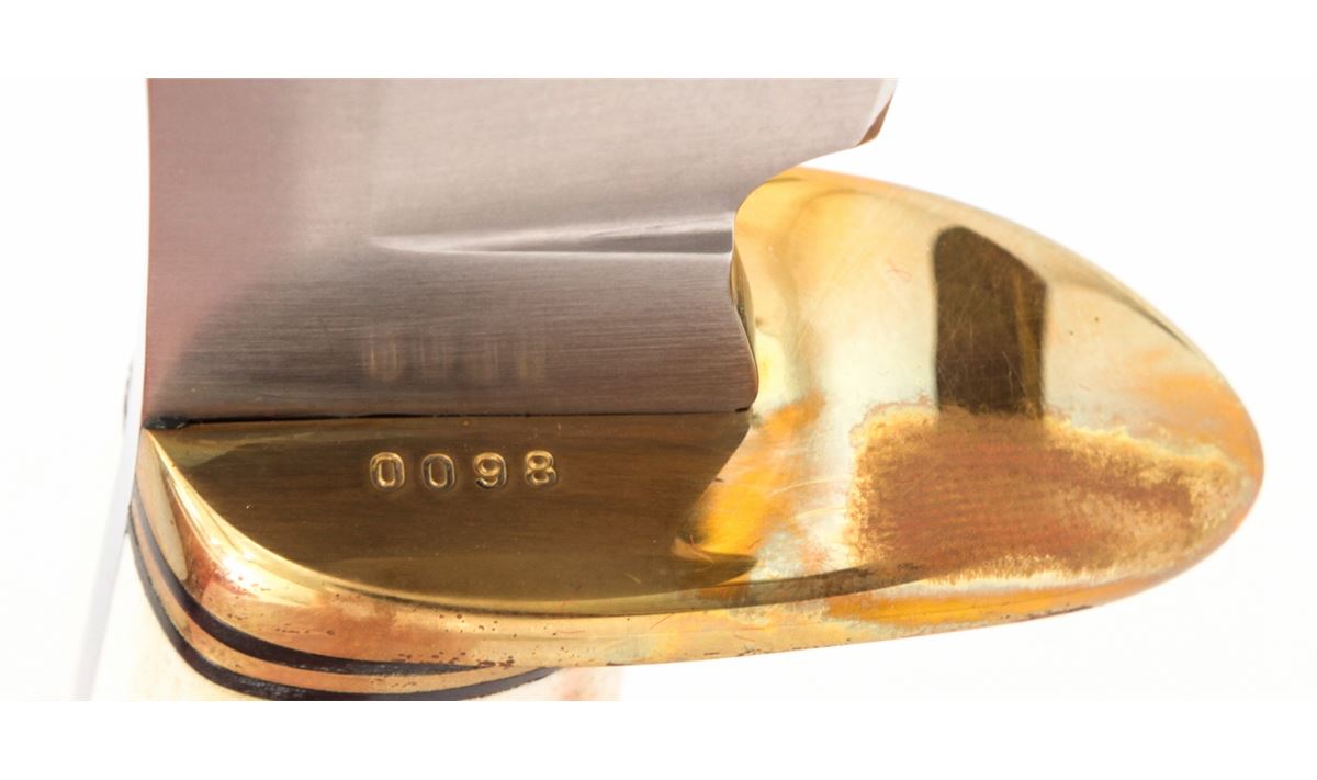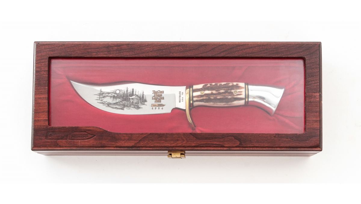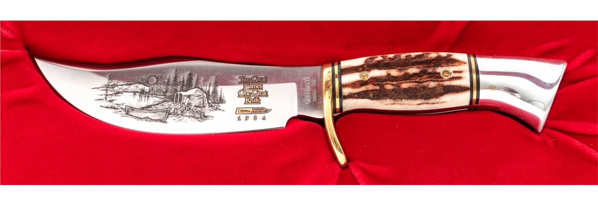 Western/Coleman Limited Edition Westmark 701 Fixed Blade Knife, #98, 5-1/2'' blade, 10-1/8'' overall, brass half guard, stag grips, aluminum pommel, with brass and black spacers at both guard and pommel. Included is the original wood display case. This knife was made to commemorate the joining of Western and Coleman. Blade is etched with the Coleman/Western logo and reads ''Two Great Names, One Great Knife'', and also features a detailed camping scene. Condition is excellent and as new. Blade retains the factory edge and is unused; guard with a patch of discoloration most likely from prolonged contact with the case liner and should clean easily. Grips and pommel with light overall marks from handling. Est.: $200-$300.