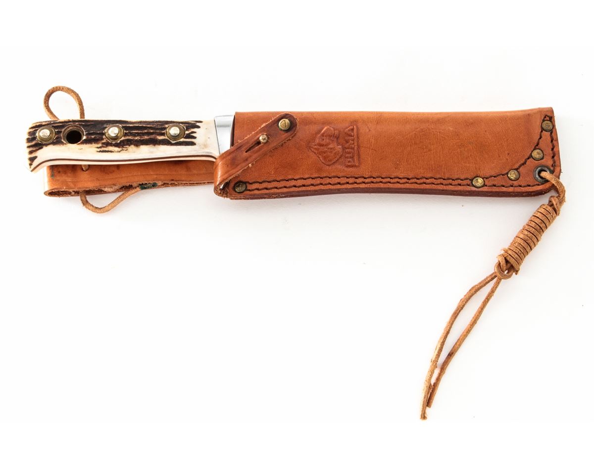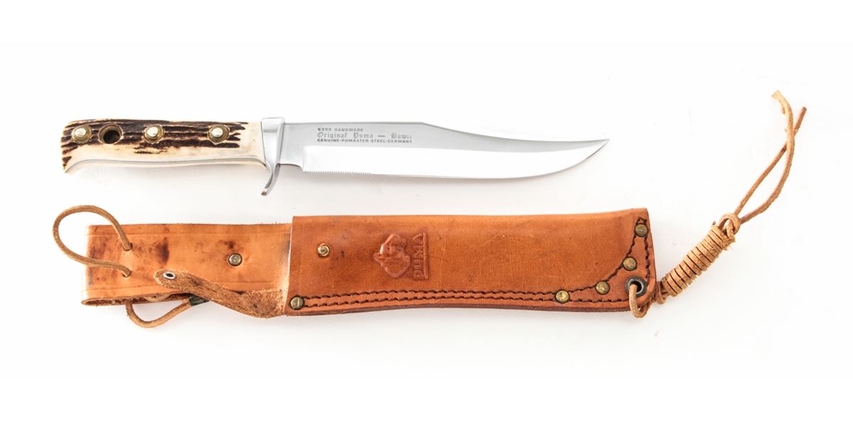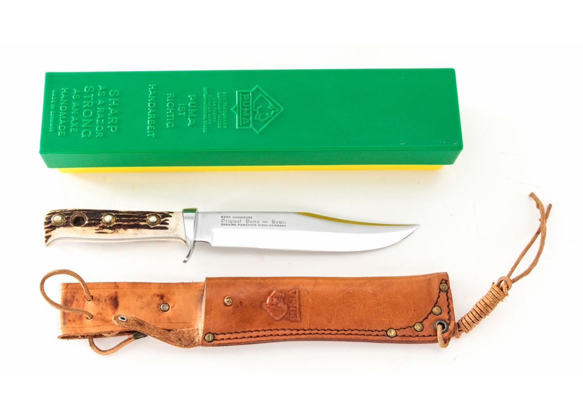 Early '70s Puma #6396 Bowie Knife, 6-3/8'' clipped point blade, 10-7/8'' overall length, guard marked with date code ''83274'' which makes the date of mfg. October 1972. Stag grips, brass lined lanyard hole with original leather sheath, green and yellow plastic case, hang tag, and owner's manual. Condition is excellent, appearing as new, with light overall marks from handling. The tongue of the sheath with patches of mild to moderate darkening. Est.: $200-$300.